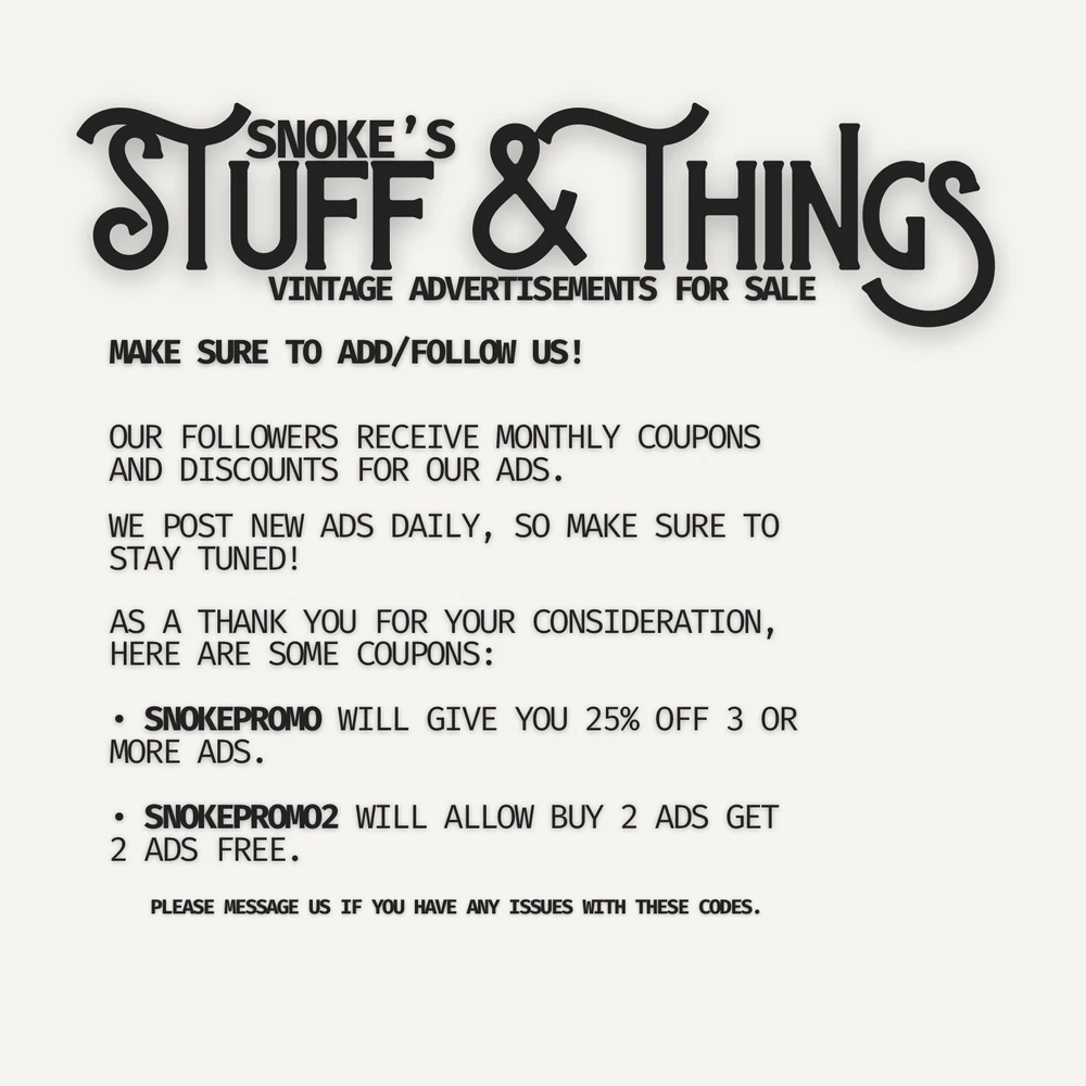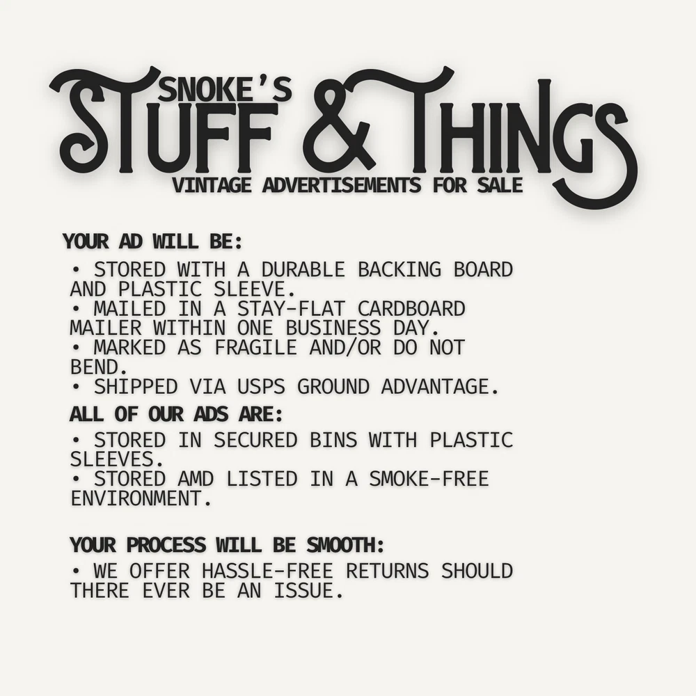 Everyone who purchases ads from us will receive exclusive coupons/discounts for future purchases. Our followers also receive exclusive coupons/discounts each month. If you're looking to purchase multiple ads, then please make sure to follow us and stay tuned! We upload daily! This wonderful piece of American history is more than an advertisement; it’s a glimpse into what life was like during the 1940s. While having aged with charm and grace, this ad paints a unique story for its collector. That chronicle varies per person but is sure to bring a smile to any viewer Each imperfection helps create a token of authenticity and a unique prize to add to any collection. This is an ideal piece for framing, DIY projects, collage art, or simply a thoughtful gift for a friend or loved one. We live in a wonderful time where most information and images are available online. Technology is everywhere around us. These advertisements are a perfect reprieve from the screens of our smartphones, laptops, etc. Take a trip down memory lane, and make sure to check out all the other ads we have listed. This advertisement measures approximately 11x14 inches and has been carefully removed from LIFE Magazine. Please enjoy each image provided and send over any inquiries you may have. We always look forward to hearing from you. Please note that the second picture is of the advertisement in a sealed poly bag with our inventory number at the top right. This sticker is NOT on the actual advertisement. Our vintage ads are shipped with care. For individual advertisements: each ad will be set on a cardboard backer and then placed in resealable poly mailer. The entire package will be shipped in a flat cardboard mailer. For multiple advertisements: all ads will be set on a cardboard backer and then placed in a resealable poly mailer. The entire package will be shipped in a flat cardboard mailer. We combine shipping costs. You will not pay multiple shipping charges for ads purchased in the same order. If you end up buying multiple ads in the same order before we can adjust the shipping cost, we will refund you the difference as soon as possible. ● All mailers will be marked as FRAGILE. We understand that there are a lot of great sellers out there, and we thank you for your consideration. Please don’t forget to add us as a favorite seller. Our goal is to have you visit us as often as possible. If there is ever an issue with your order, please let us know. Your satisfaction is priority! NOTE: The pictures provided are of the actual item you will receive. We recommend using the zoom feature on eBay so you’re able to see as much as possible before your purchase. We will gladly provide more pictures upon request. All ads will have some signs of aging. This is an advertisement for a product, not the actual product being advertised. Please note that most split two-page ads have been trimmed. There may be some minor alignment offsets due to this. These are easily fixed and can be adjusted to fit your needs with them.
