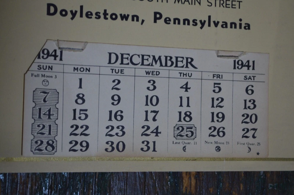 Description:1941 Clymer's Department Store Doylestown Bucks County PA Advertising Calendar Showing Covered Bridge. Age and use related wear noted, but calendar displays well. Only the calendar page for the month of December is present. This calendar calendar would look great matted and framed. Questions and offers welcome. Please review entire listing (including condition, title, pictures, description, and terms) before committing to purchase this listing. Before agreeing to purchase this listing, make your own determination on condition of the item(s) being offered in this listing. Pictures are part of the description and are provided to help illustrate condition. Since descriptions and opinions of condition can vary, seller provides prospective buyers with the ability to request more information and additional pictures before the close of this listing. When in doubt, please contact Taggart Neveling Books Ephemera, LLC "the seller" through eBay before you bid or agree to purchase this listing. This helps ensure a smooth transaction, one where Taggart Neveling Books Ephemera, LLC gets a sale and the buyer gets the item(s) they want to purchase. Condition & Disclosure of All Faults: All items appearing in this listing are pre-owned and are sold "AS-IS" and "WITH ALL FAULTS." No warranties, express or implied, are made in connection with this listing. Additionally, all other warranties not specifically listed above, are also disclaimed. Since the seller, Taggart Neveling Books Ephemera, LLC, does not provide any warranties with this listing, to the fullest extent allowed by law no sale shall be deemed invalid. A written description and uploaded pictures are offered to help provide a general idea of condition. Pictures are part of the description, but may not show every defect or flaw of an item or collection of items. The written description offered in this listing may not state every single defect or flaw in condition associated with item or items offered in this listing. However, Taggart Neveling Books Ephemera, LLC "the seller" offers potential buyers the ability to submit questions before agreeing to purchase this listing. Buyer agrees that a failure to exercise this option is not sufficient cause to initiate a return. Since Taggart Neveling Books Ephemera, LLC offers potential buyers the ability to submit questions before agreeing to purchase this listing, by bidding or agreeing to purchase this listing, buyer agrees seller has provided sufficient legal disclosure of all defects and faults, even if such defects and faults are not specifically identified in the written description or shown in the uploaded images. All statements and descriptions about age, authenticity, condition, fitness for a particular purpose, or origin of items offered in this listing, as well as those made in response to questions about this listing, reflect the opinion of the seller and are NOT offered as statements of fact. By bidding or agreeing to purchase this listing, the buyer agrees that to the fullest extent allowed by applicable law, Taggart Neveling Books Ephemera, LLC "the seller" will not be liable for any defect, error, or omission in this listing. By bidding or agreeing to purchase this listing buyer agrees to have performed all due diligence beforehand. By bidding or agreeing to purchase this listing buyer acknowledges the fact that some or all of the items offered in this listing may require cleaning, conservation, or repair. By bidding or agreeing to purchase this listing, buyer agrees ALL SALES ARE FINAL. NO REFUNDS. NO PARTIAL REFUNDS. NO RETURNS. NO EXCHANGES. Digital Photos and on Screen Viewing: Cameras and computers sometimes display colors differently. Colors, when viewed on a computer screen, can be lighter or darker than the actual item(s) that is being photographed. Please keep this in mind when you place your bid. Please also note: No display props or materials (tape measures, stands, or other items that may be used to help display a listing) are included. Taggart Neveling Books Ephemera, LLC welcomes questions, but asks all potential buyers to submit questions at least one day before the close of this listing. This helps ensure there will be enough time to respond to questions before the close of the listing. Payment Policy: Payment is due within two days of the close of a listing. If a listing remains unpaid for three or more days the issue will be reported to eBay. Failure to pay for an item in a timely fashion may result in a buyer being blocked from both current and future listings offered under this user ID. Sales Tax, Use Tax, Other Taxes: Since tax laws vary by state, you may be responsible for remitting sales or use tax to the appropriate state agency. The bidder, by bidding, agrees that if any sales or use tax (or any other tax) is due on the item(s) purchased, it is to be paid and remitted to the appropriate agency by the buyer and not the seller. Please note that eBay has largely automated this process. However, if there is any error in eBay's collection or the calculation of tax due, the buyer agrees, to the fullest extent allowed by law, to pay the correct amount to the appropriate agency and to not hold the seller responsible for covering any additional amount of tax due. Shipping Policy: Shipping Cost for this listing (Within Continental US): Item will ship for $9.99, with tracking, to continental US. Please note: No in-person pickups or deliveries are offered with this listing. Delivery for this listing will only be made via USPS mail. In listings without free shipping offered, total shipping cost includes all aspects of shipping, such as packing materials, time to pack the listing(s), time and expense incurred to get the listing(s) to the post office, and lastly postage. Postage is just one aspect of shipping cost. Please keep this in mind if you happen to see an instance where the shipping cost charged was higher than the postage cost. Time to Ship: All orders will s