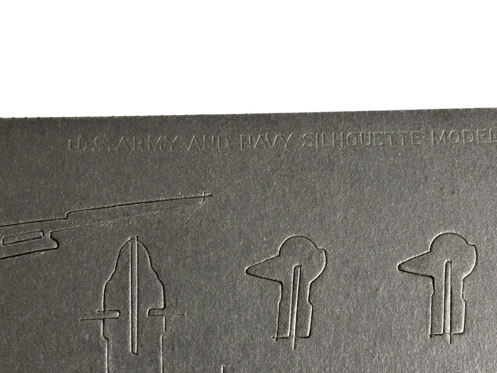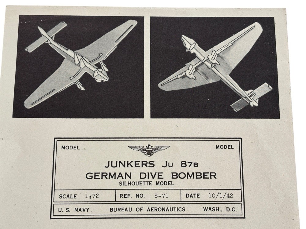 Model: German Junkers Ju 87B Dive Bomber Ref. No: S-71 Maker: U.S Army & U.S. Navy Silhouette Model - Bureau Of Aeronautics - Wash D.C. This is New Old Stock. This is the first series of these Aircraft Identification Silhouette Models that were made to teach aircraft spotters how to identify planes they scan for. These silhouette models are in unpunched condition. This one is dated 10/1/1942 and are scale 1:72. This model is 11"x7". They will come with original instructions or printed instructions. Most of what you find are from 1943 and instructions are printed on envelopes but these have their own sheet and came in blank envelopes. Coca Cola supported this effort as they support the WWII American effort in many different ways. We will be listing more silhouette models of Japan, British, German and U.S . There will be different sizes. HISTORY: Cardboard "silhouette" recognition training models as used during World War II were pioneered by the Special Devices Section of the US Navy's Bureau of Aeronautics, beginning in 1941. Not content to let the Navy lead anything, the USAAF started to produce a few of the same models under their own aegis. (See below for distinguishing markings.) Eventually the military forces decided to cooperate rather than compete, and the "Joint Services" sets were released. All of these models/sets had a date of 2/22/43. Set "A" had 78 models in it. Set "B" had a subset of 50 models in it. The military decided to focus on then-current front-line combat aircraft, so the earlier models of obsolete aircraft fell by the wayside, making them some of the rarest collectibles around today. The 78 models were grouped by country. For example, CM-1 through CM-17 are models of Japanese planes, CM-101 to CM-114 are of German planes, CM-501 to CM-531 are of US planes, and CM-601 to CM-616 are of British planes. As a rule of thumb, whenever you see a CM-xxx number you know that it is from the Army/Navy Joint Services effort. Any S-yyy reference numbered model is from the earlier stand-alone USN effort. There were a few cooperative Army/Navy models which were issued just prior to the boxed sets. For example, some number of the CM-xxx models were issued individually and dated between November 1942 and January 1943. Thereafter, all models were dated 2/22/43 and were intended for distribution in boxed sets. The early USN program used blank envelopes which were inked with the name of the model. The instructions were printed on a separate sheet of paper which was then inserted into the paper sleeve. By the time the Joint Services boxed sets were issued, every envelope had the assembly instructions printed on the outside, probably to prevent the accidental loss of the instruction sheet. A company called Burton-Rodgers, in Cincinnati, Ohio, made these silhouette models for the military. B-R was formerly known as "Co-operative Displays", a company founded in 1934. The name was changed in 1943 because displays were no longer the sole product of the company. "Co-operative Displays" continued as a division of Burton-Rodgers, and began offering sets of models to the public, as well. This effort began in March 1943 just after the contents of the boxed sets were finalized, and the models were used extensively by "plane spotters" of the Aircraft Warning Service (AWS). These models were a creative way to ship a two-dimensional panel from which a 3D model could then be assembled. The process of assembly was intended to reinforce the design elements of the aircraft in the mind of the builder. These ID training models were intended to be viewed from about ~36 feet away. That is about 1/2 mile at scale, and was the effective range of the weapons of the era. At 30+ feet they make for remarkably realistic viewing. According to published sources, about 7 million models were produced of 142 aircraft types. They were cheap, flimsy, and expendable, and many a serviceman whiled away the boring hours crossing the ocean by assembling models and then sailing them over the side of the ship! Not many have survived. In fact, about a dozen of the early S-series models still remain to be identified. The reference number exists, but no one knows what plane was assigned that particular number.