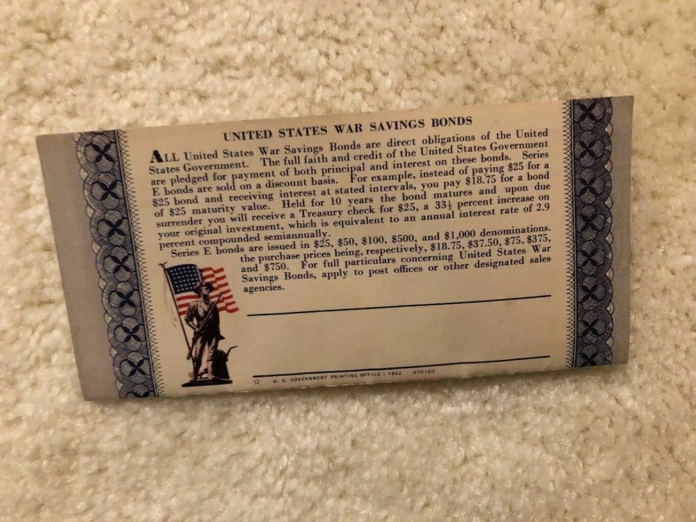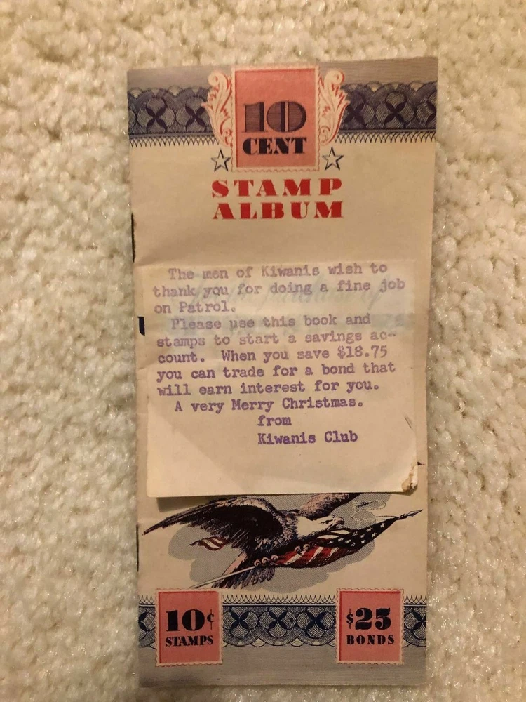 1942 WWII Savings Bond Stamp Album with 14 10 cent stamps glued in. Front has a note from the Kiwanis Club on how to use the booklet and wishing a very Merry Christmas. The stamps were purchased at elementary school and later redeemed for a savings bond. Nice condition, see photos.