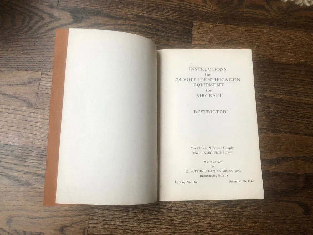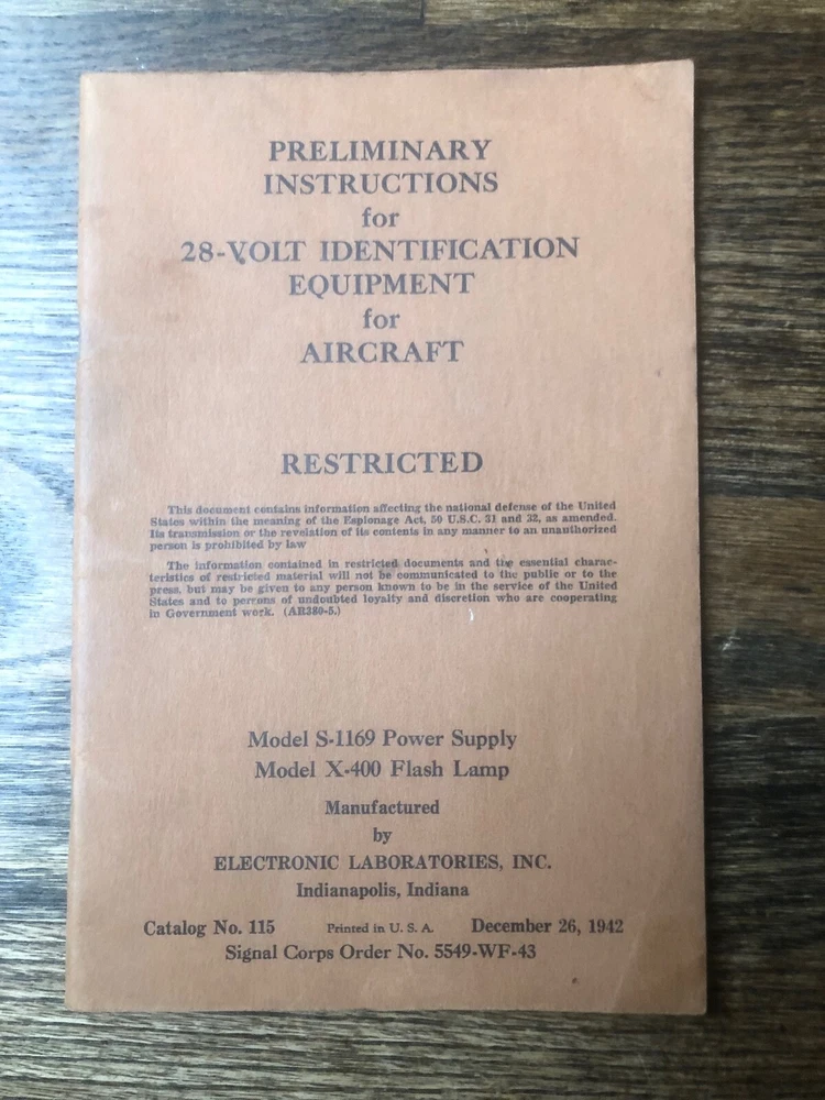 Original WWII Preliminary Instructions for 28 Volt Identification Equipment for Aircraft Manufactured by Electronic Laboratories, Indianapolis, IN. 29 pages, good condition, measures 6" x 9."