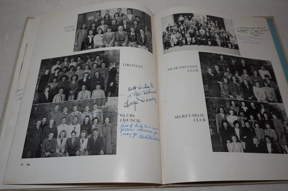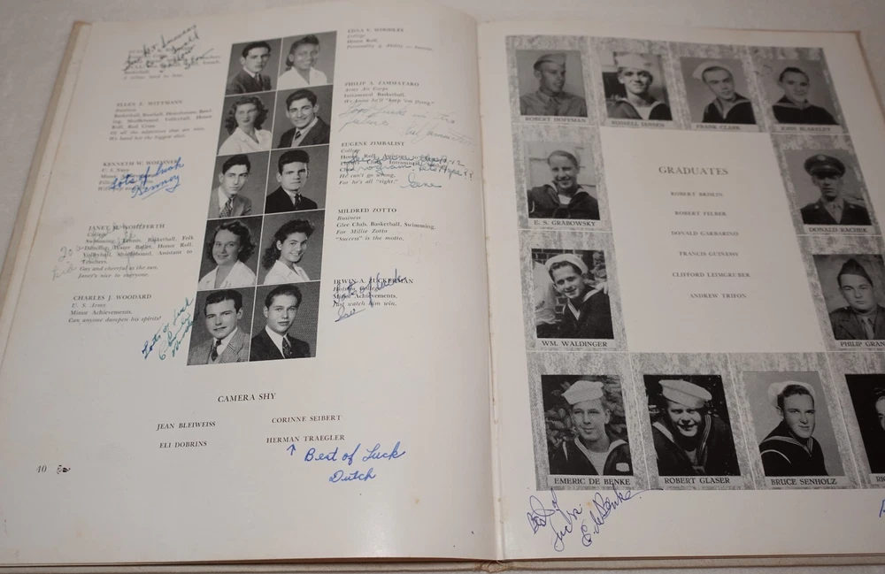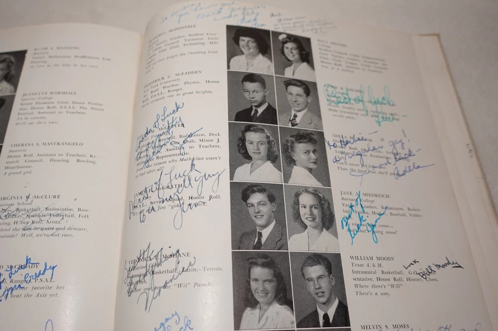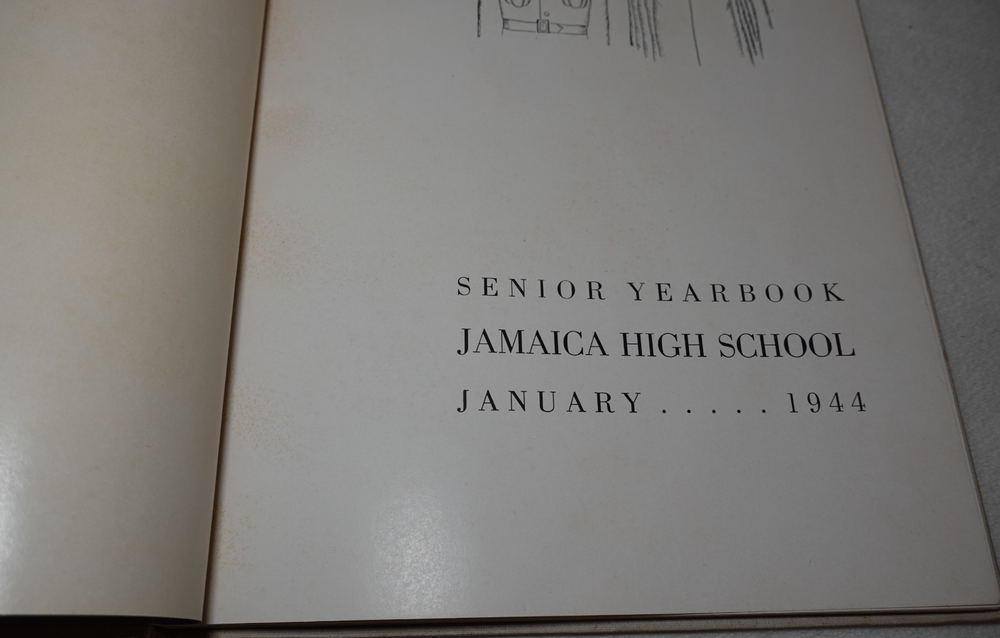 1944 Jamaica High School Queens New York Vintage Original Yearbook Over 200 Signatures Approximately 221 Signatures. Measures approximately 8 5/8" x 11 3/8". 60 Pages. Item is in vintage condition with dinged edges and corners, edge tearing, edge fraying, heavy staining to the covers and along the binding, indentions, age discoloration and marks. There is staining and discoloration inside the front and back covers. Yearbook has writing and marks throughout the publication. Please see photos for more information on condition and ask any questions you may have.
