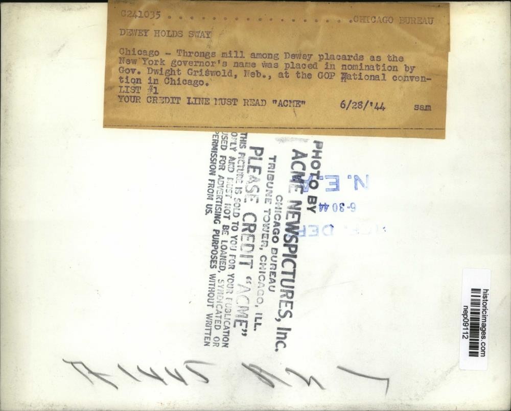 ebay template Note: Please study the images carefully to determine the condition of this vintage photograph, as it may not be in perfect condition. It may contain wrinkles, cracks, and possibly even tears due to its age and how it was handled before it got to us. A scanner may interpret colors and contrast differently than human eyes will, so it is possible that the actual photograph may be slightly darker or lighter in person. This vintage photograph is offered for sale as a collectible item and conveys no transfer of copyright. 1944 Press Photo Thomas Dewey Supporters, Republican National Convention This is an original press photo. Photo measures 9 x 7.25inches. Photo is dated 06-28-1944. PHOTO FRONT PHOTO BACK Historic Images Part Number: nep09112 Sell Smarter with Kyozou. Inventory and Ecommerce Management