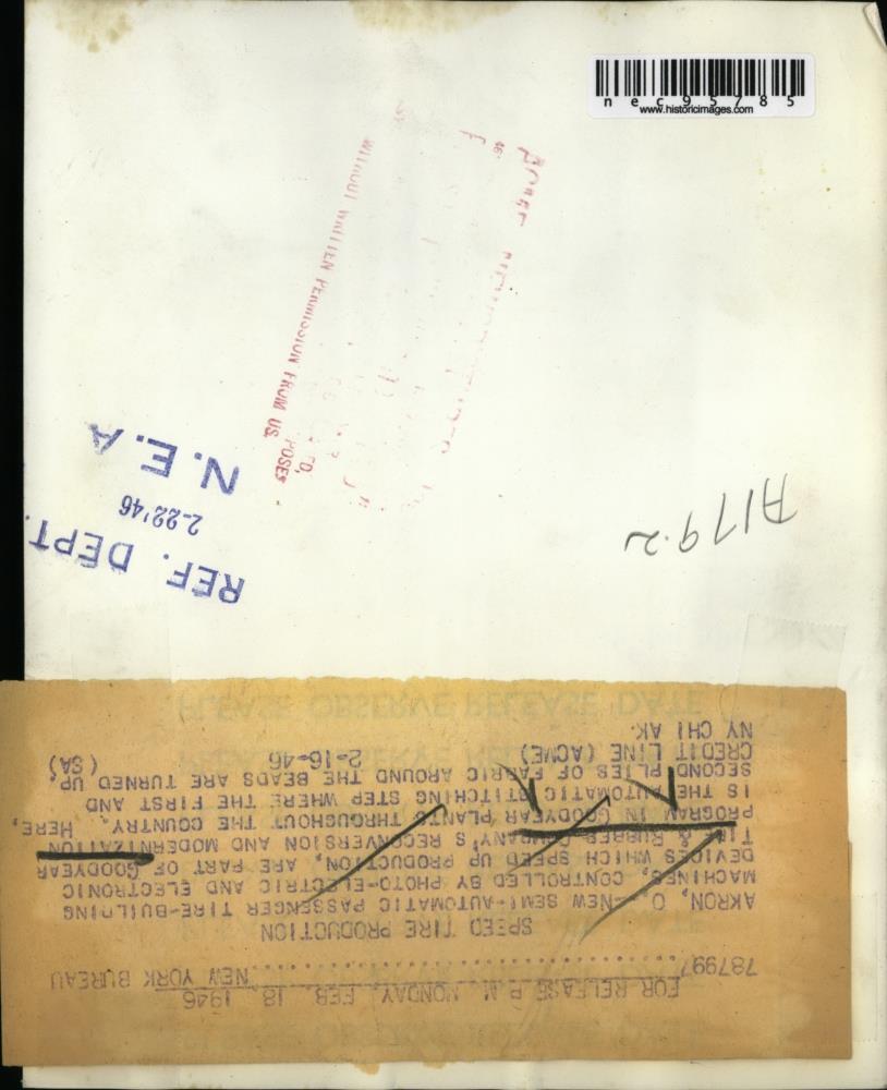 ebay template Note: Please study the images carefully to determine the condition of this vintage photograph, as it may not be in perfect condition. It may contain wrinkles, cracks, and possibly even tears due to its age and how it was handled before it got to us. A scanner may interpret colors and contrast differently than human eyes will, so it is possible that the actual photograph may be slightly darker or lighter in person. This vintage photograph is offered for sale as a collectible item and conveys no transfer of copyright. 1946 Press Photo The Good Year Tire and Rubber Company introduces new product This is an original press photo. It is the Semu automatic passenger tire building machines that speeds up the production in the Good Year Plants.Photo measures 6.75 x 8.5inches. Photo is dated 2-22-1946. PHOTO FRONT PHOTO BACK Historic Images Part Number: nec95785 Sell Smarter with Kyozou. Inventory and Ecommerce Management