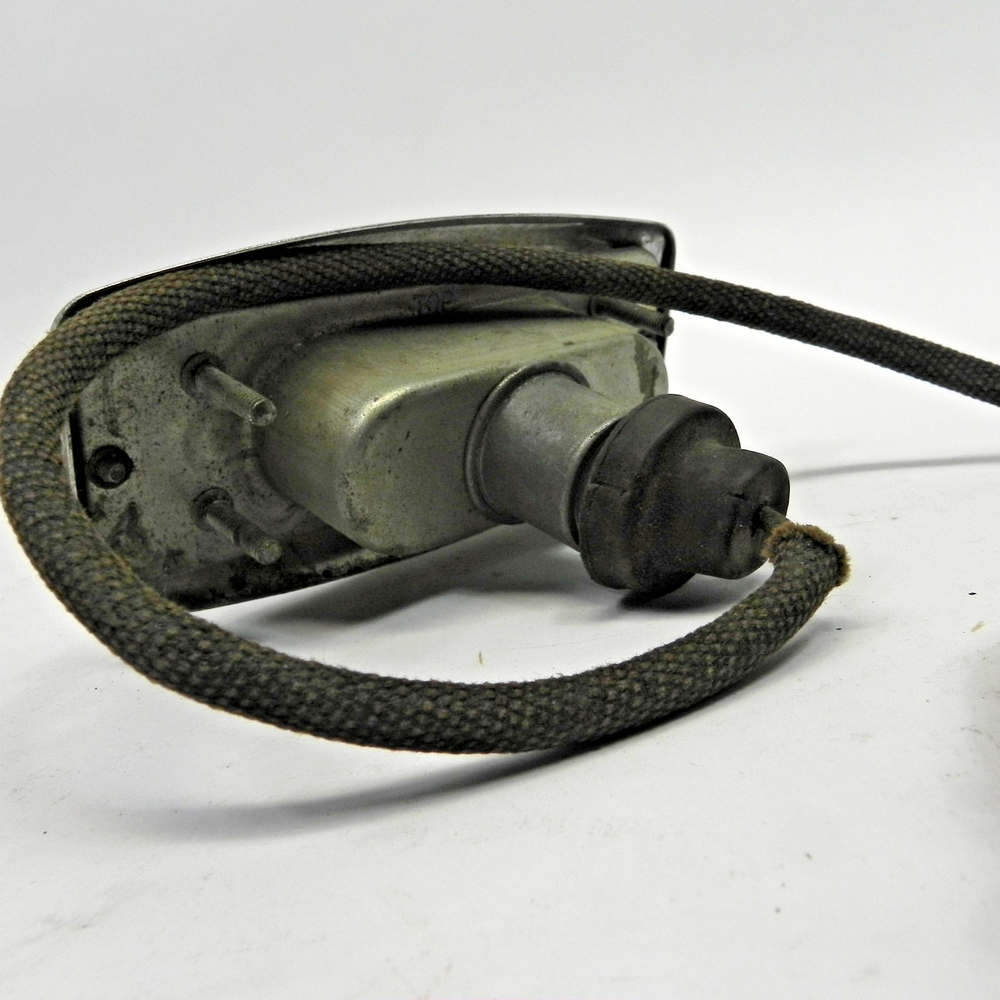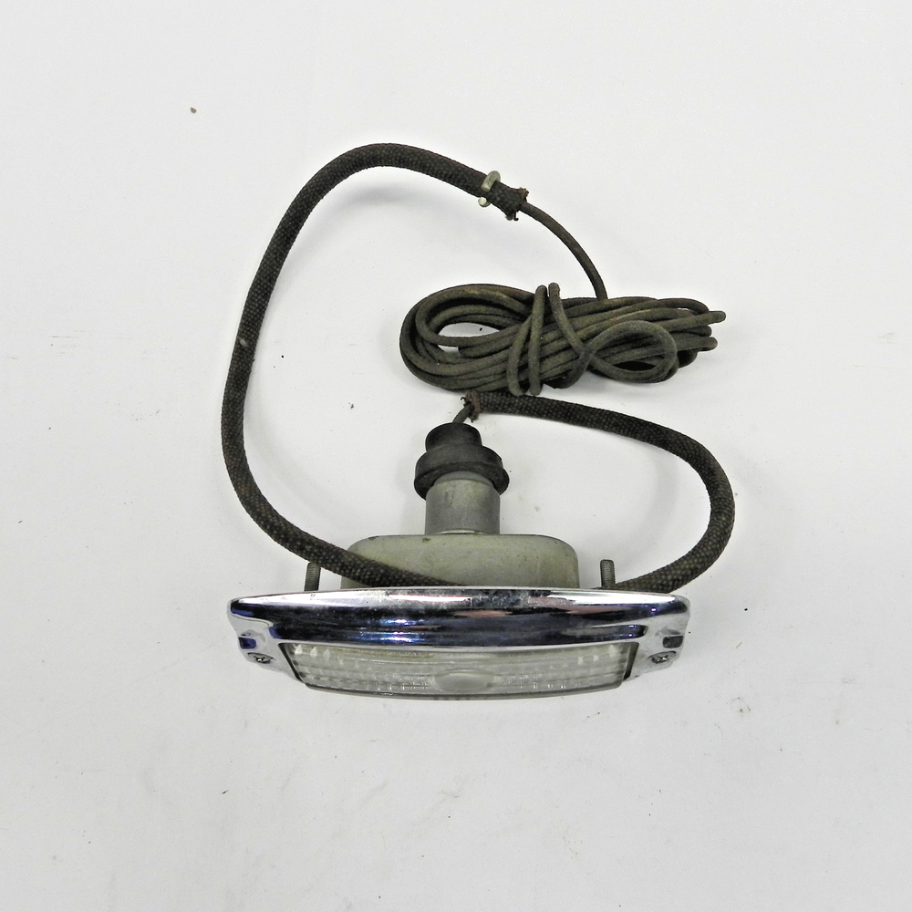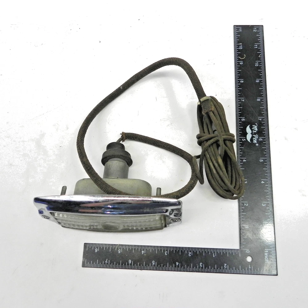 The 1947-1948 Kaiser-Frazer NOS back-up light accessory assembly with wiring is a rare vintage part made in the United States. This tail light assembly features a red incandescent light with a chrome housing, designed for mounting with screws on the rear of the vehicle. It is a unique and authentic piece for collectors or enthusiasts of classic cars looking to restore or enhance the lighting system of their vehicles.