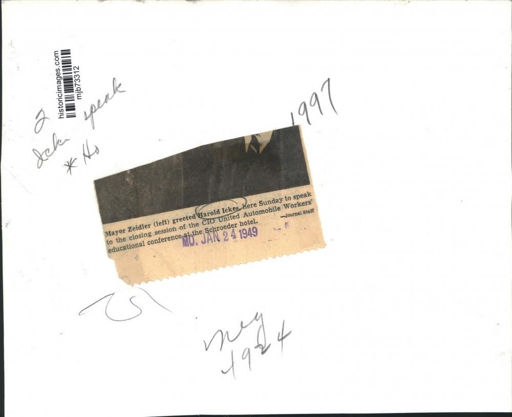 ebay template Note: Please study the images carefully to determine the condition of this vintage photograph, as it may not be in perfect condition. It may contain wrinkles, cracks, and possibly even tears due to its age and how it was handled before it got to us. A scanner may interpret colors and contrast differently than human eyes will, so it is possible that the actual photograph may be slightly darker or lighter in person. This vintage photograph is offered for sale as a collectible item and conveys no transfer of copyright. 1949 Press Photo Mayor Zeidler greeted Harold Ickes to speak at a conference This is an original press photo. Mayor Ziedler (left) greeted Harold Ickes, here Sunday to speak to the closing session of the Congress of Industrial Organizations United Automobile Workers educational conference at the Schroeder Hotel.Photo measures 9 x 7.25inches. Photo is dated 01-24-1949. PHOTO FRONT PHOTO BACK Historic Images Part Number: mjb73312 Sell Smarter with Kyozou. Inventory and Ecommerce Management