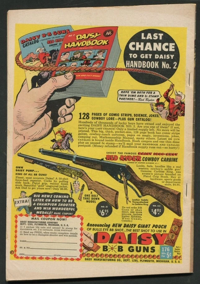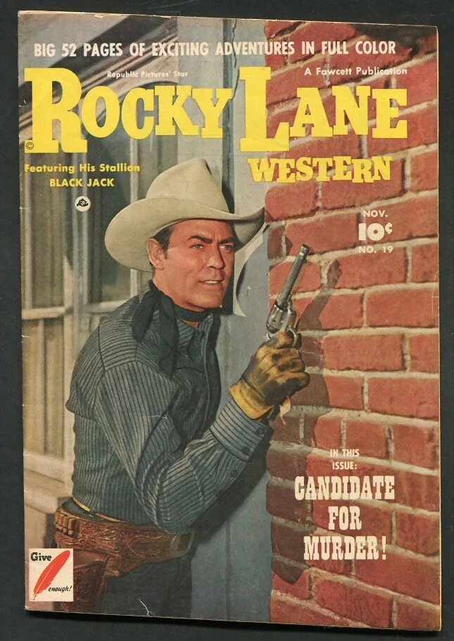 FAWCETT COMIC BOOK 1950 #19 ROCKY LANE WESTERN--COWBOY COMIC BOOK PUBLISHED IN U.S.A. FAWCETT This comic book is "1950 #19 ROCKY LANE" FAWCETT COMIC BOOK Please see scan for conditions. Graded FINE+ nice comic (IMO) pages are tan Cover is attached with no loose pages lies flat little chipping on back cover The comic book is in NICE FINE+ (IMO) (SEE SCAN) condition POSTAGE: ----Canada $4.50, U.S.A $10.00 (AIR SMALL PACKET) (NO tracking and insurance) NO OTHER INTERNATIONAL SHIPPING (Sorry for the high shipping, USA & Canada Post increased their postage) WE DO COMBINE SHIPPING
