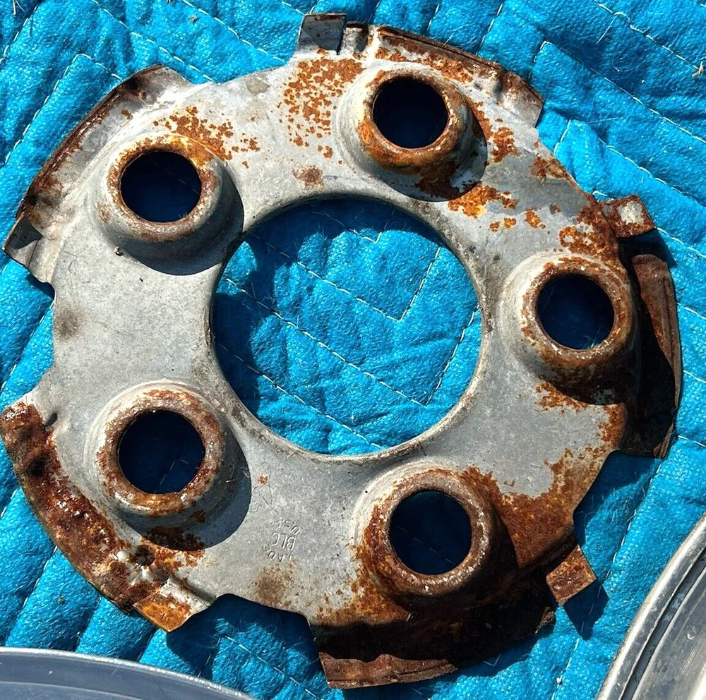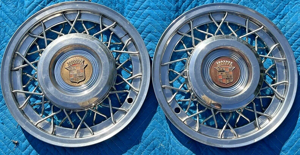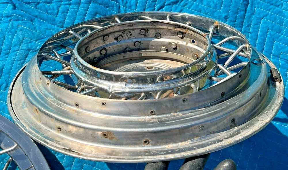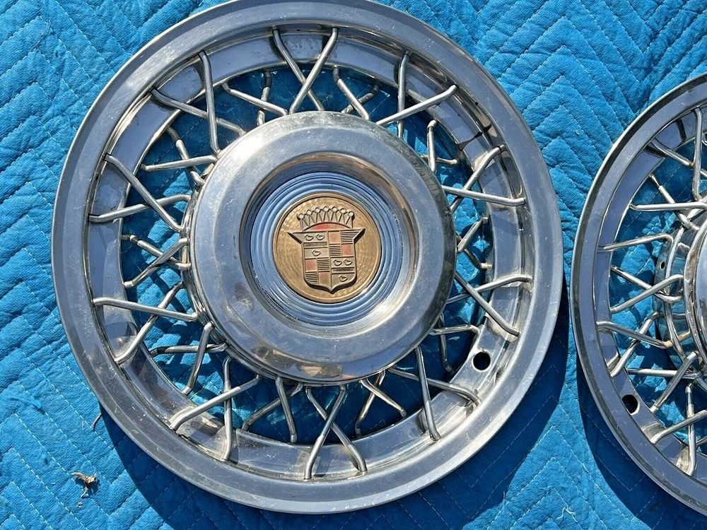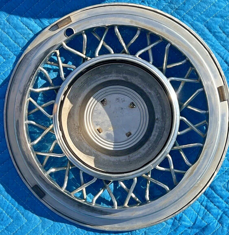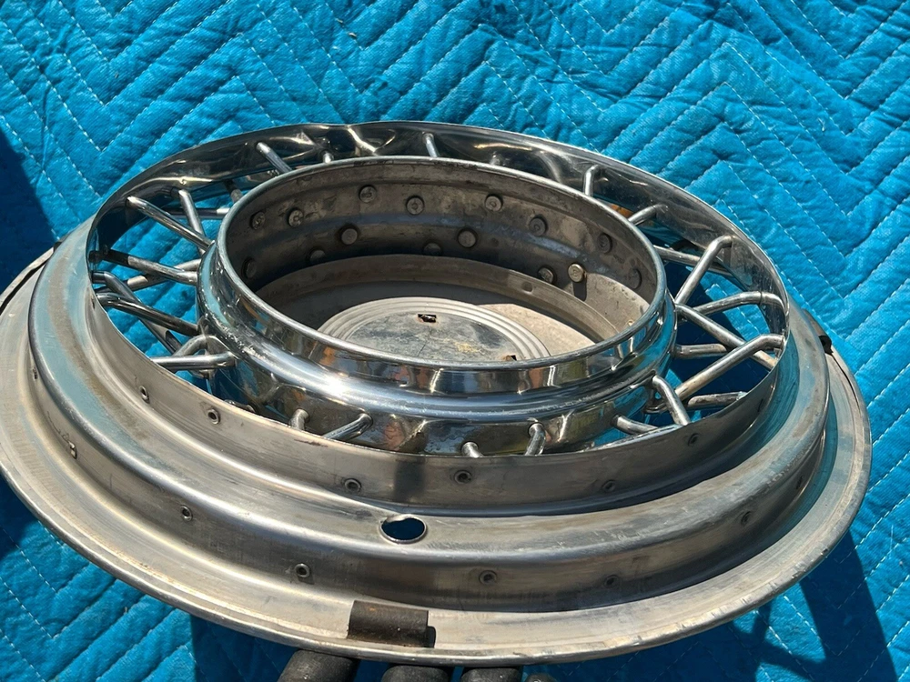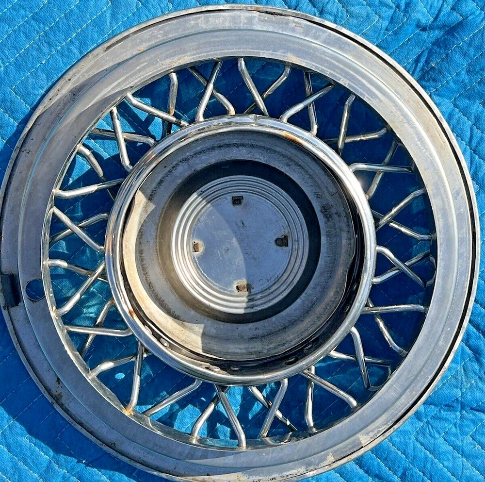 PAIR OF 15" WIRE SPOKE HUBCUPS. SOLID USED CONDITION. MISSING ONE OF THE BACKSIDE MOUNTING PLATES. THE INCLUDED PLATE COULD BE USED AS A TEMPLATE FOR FABRICATING ANOTHER. NICE CORES FOR RESTORATION. USE CLOSEUP VIEWER TO BEST DETERMINE CONDITION