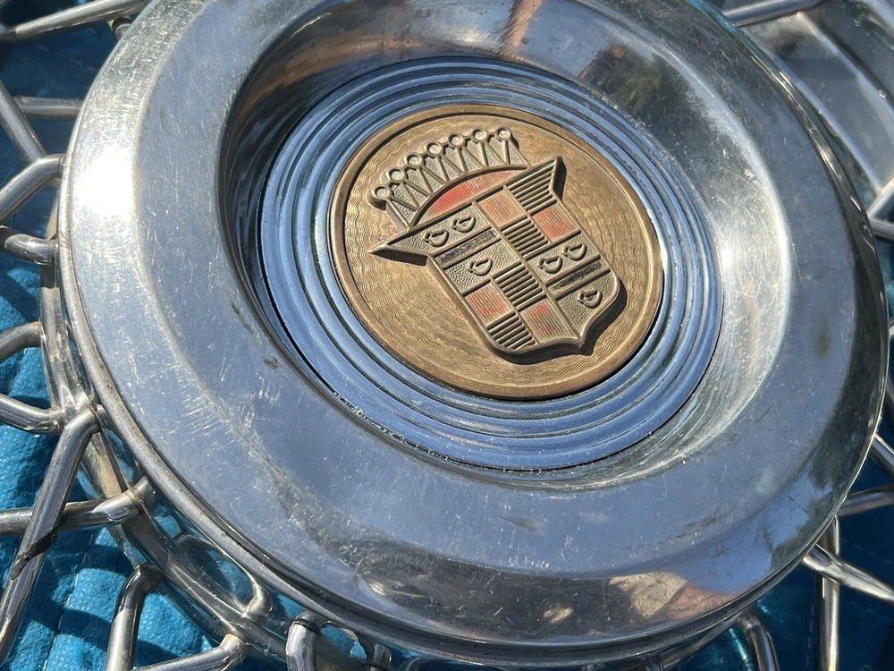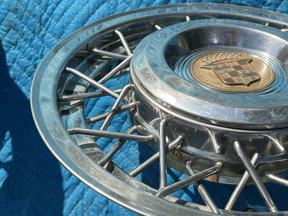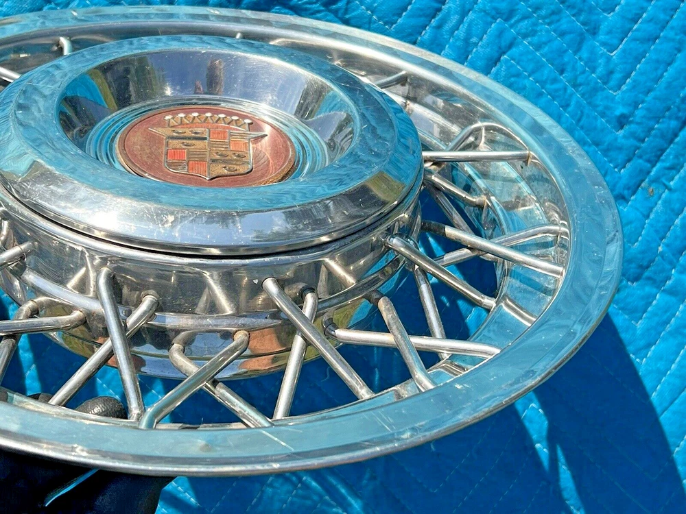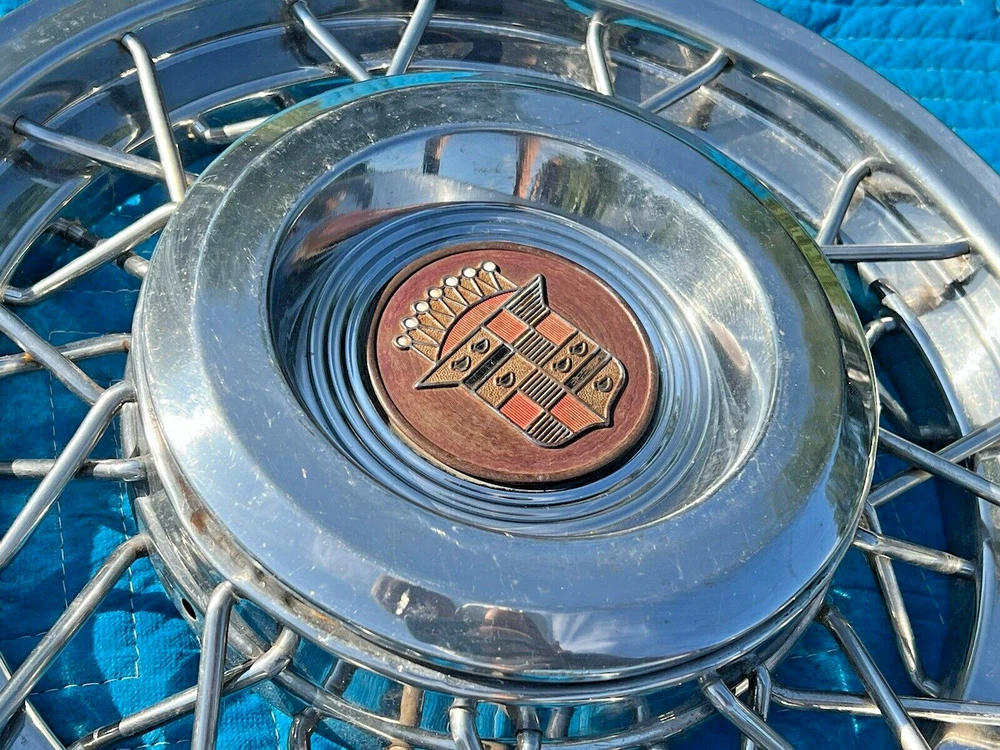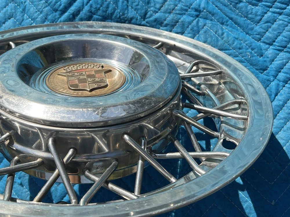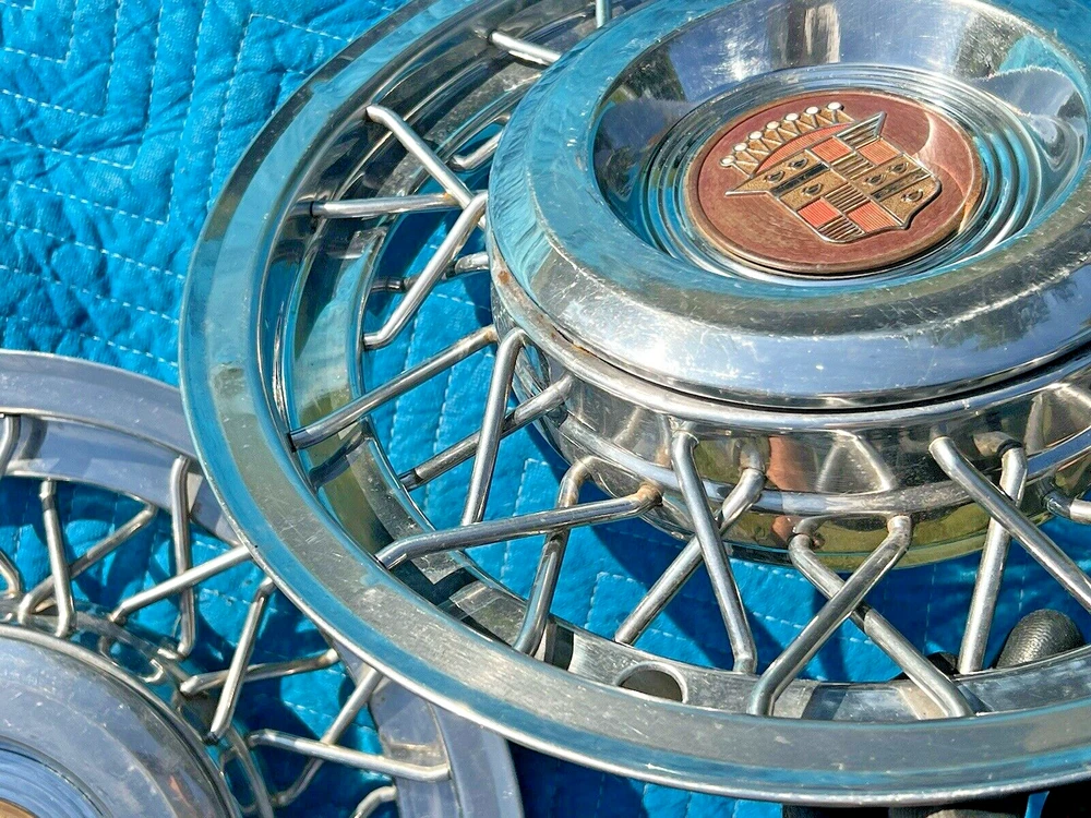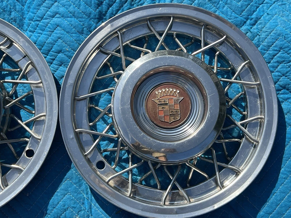 PAIR OF 15" WIRE SPOKE HUBCUPS. SOLID USED CONDITION. MISSING ONE OF THE BACKSIDE MOUNTING PLATES. THE INCLUDED PLATE COULD BE USED AS A TEMPLATE FOR FABRICATING ANOTHER. NICE CORES FOR RESTORATION. USE CLOSEUP VIEWER TO BEST DETERMINE CONDITION