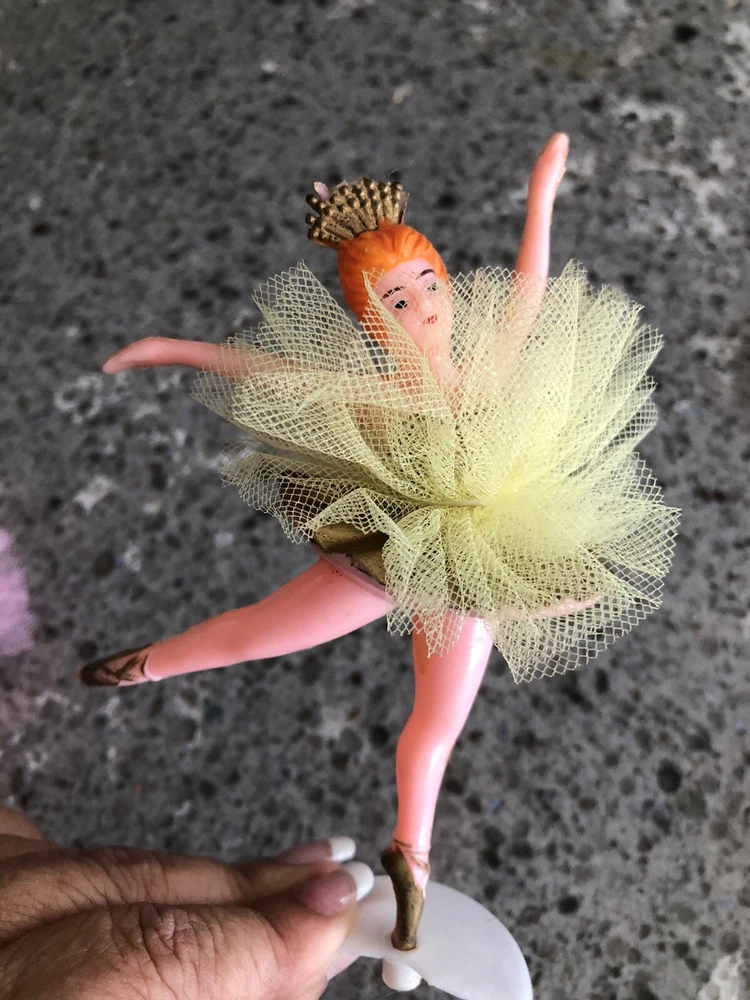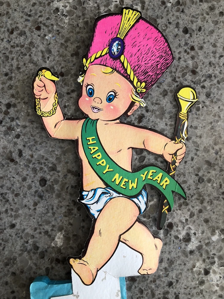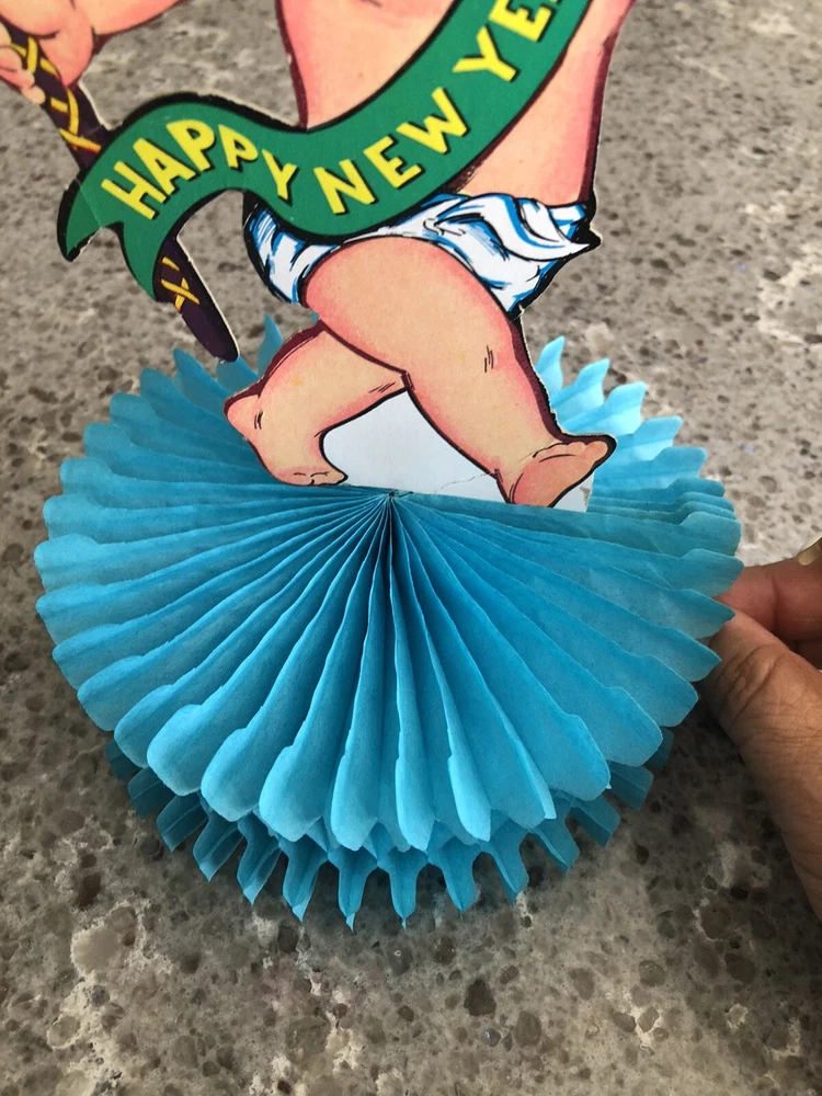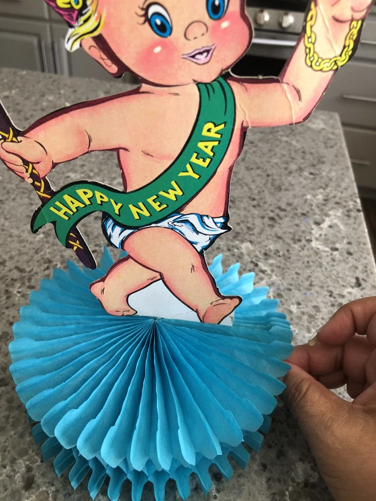 This vintage New Year's decoration features a charming die cut of a baby with a honeycomb base. The blue cardboard material was manufactured in the United States by The Beistle Co. in the 1950s. Perfect for collectors of holiday and seasonal items, this piece is a unique addition to any collection. Celebrate the arrival of a new year with this rare and adorable decoration. Also included are two vintage ballerina cake decorations. Base of ballerinas are broken.