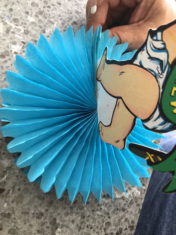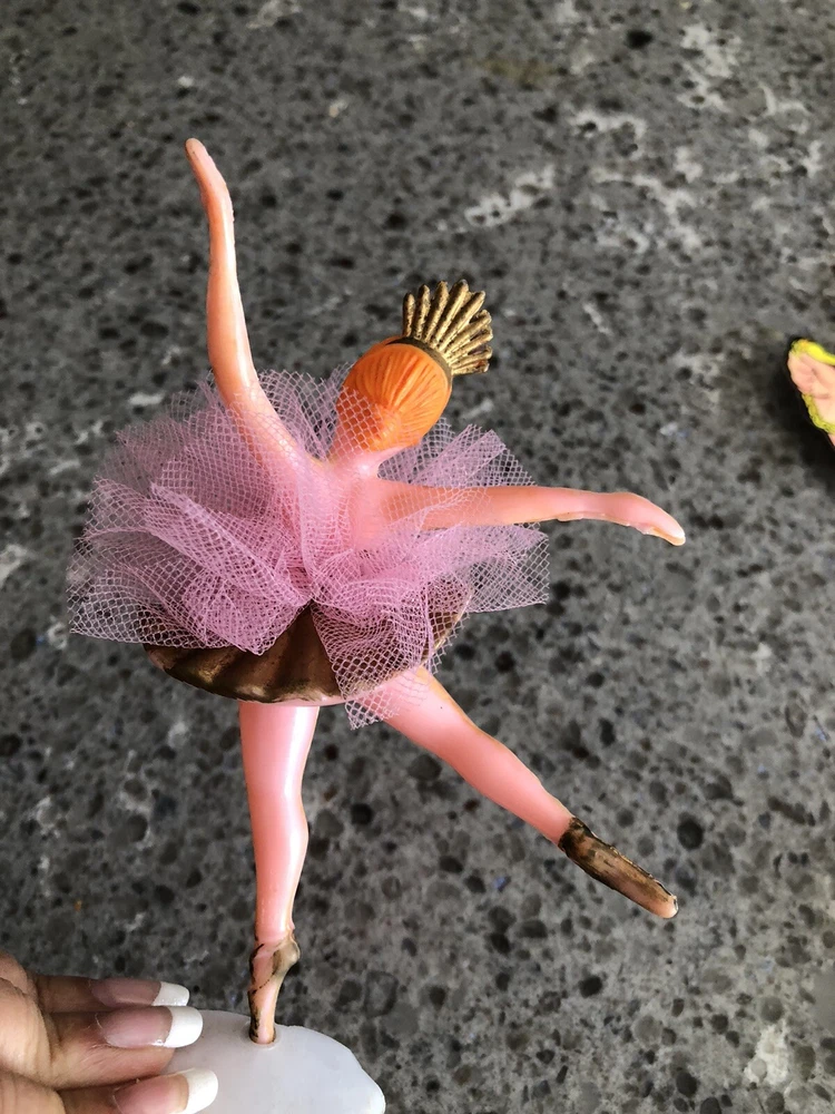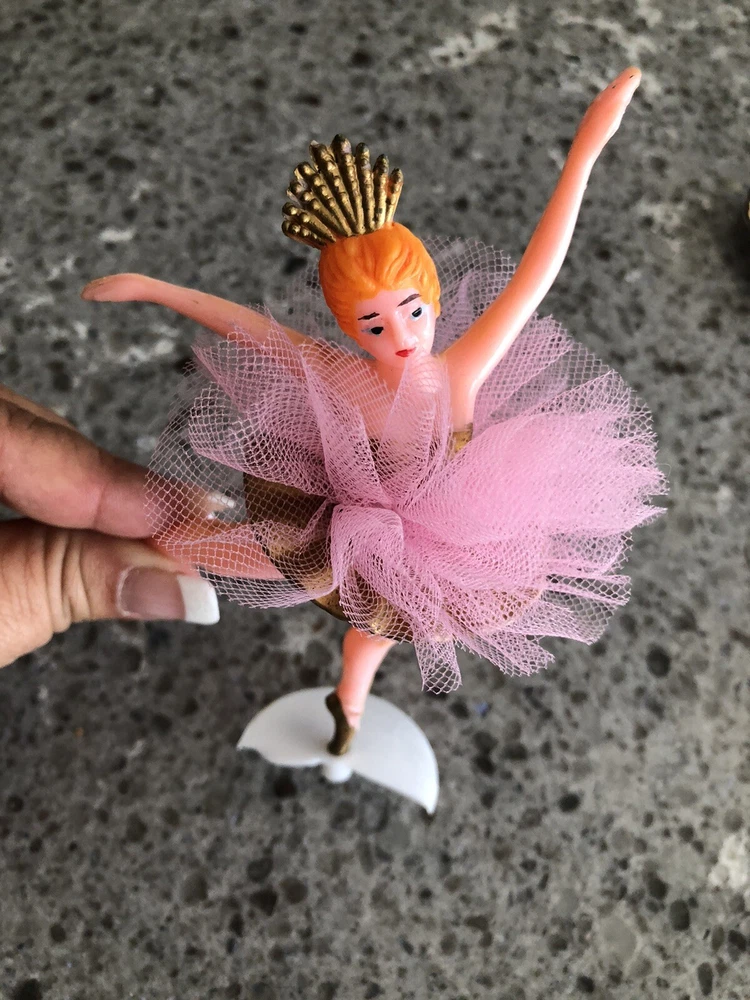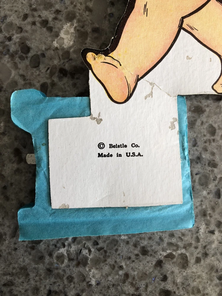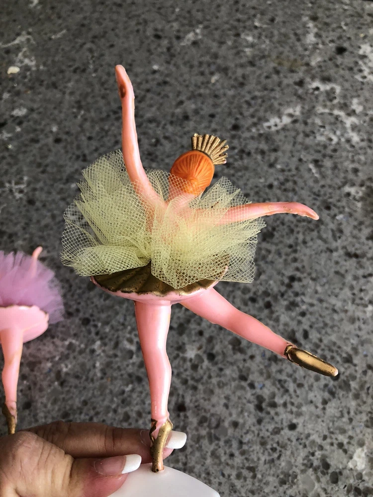 This vintage New Year's decoration features a charming die cut of a baby with a honeycomb base. The blue cardboard material was manufactured in the United States by The Beistle Co. in the 1950s. Perfect for collectors of holiday and seasonal items, this piece is a unique addition to any collection. Celebrate the arrival of a new year with this rare and adorable decoration. Also included are two vintage ballerina cake decorations. Base of ballerinas are broken.