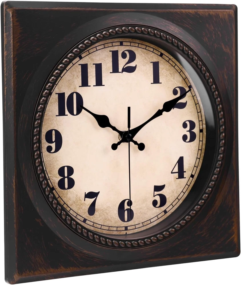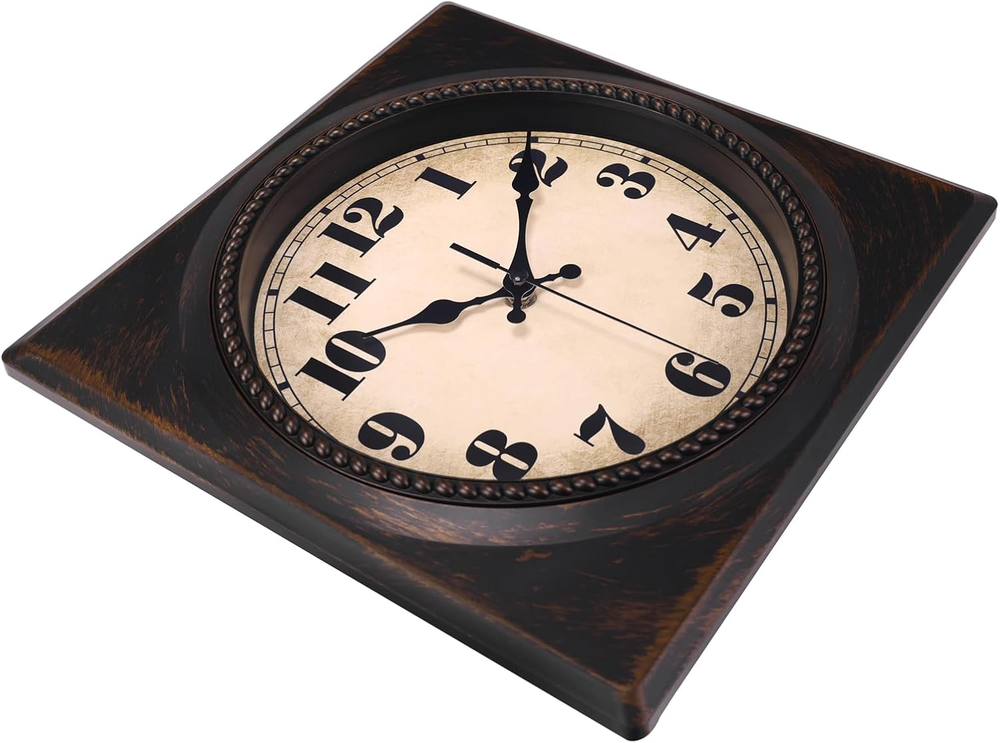 Accurate Timekeeping: Precise quartz movements guarantee accurate time.Non-ticking quiet mechanism with sweeping movement. Retro Style: Retro black-gold classic frame ,uniquely shaped vintage hands were crafted to add elegance and style.Bring back to 50's mid-century with a retro-inspired wall clock. Easy to Read: 12 inch vintage square wall clock. Large black bold numbers against light yellow brown dial creates easy viewing. Decoration:The perfect accent piece for your kitchen,dining room,livingoom,fireplace,bedroom,bathroom,office,home.Works with retro and vintage décor styles. Easy to Use: Lightweight and Easy To Hang. Powered by 1 AA battery (not included). Correct Sequence to Place battery:Insert into (+) first, then insert into (-).