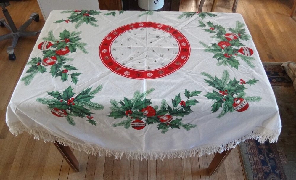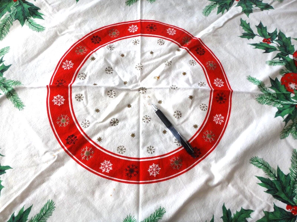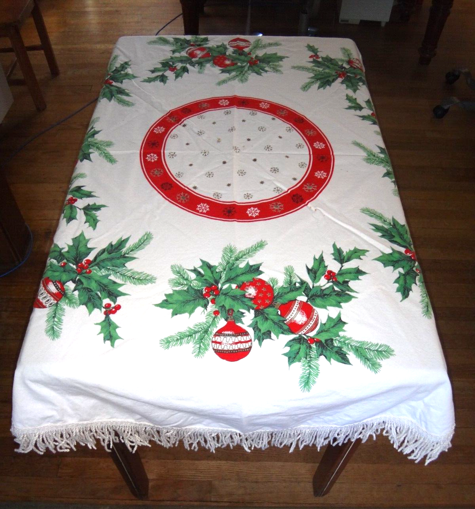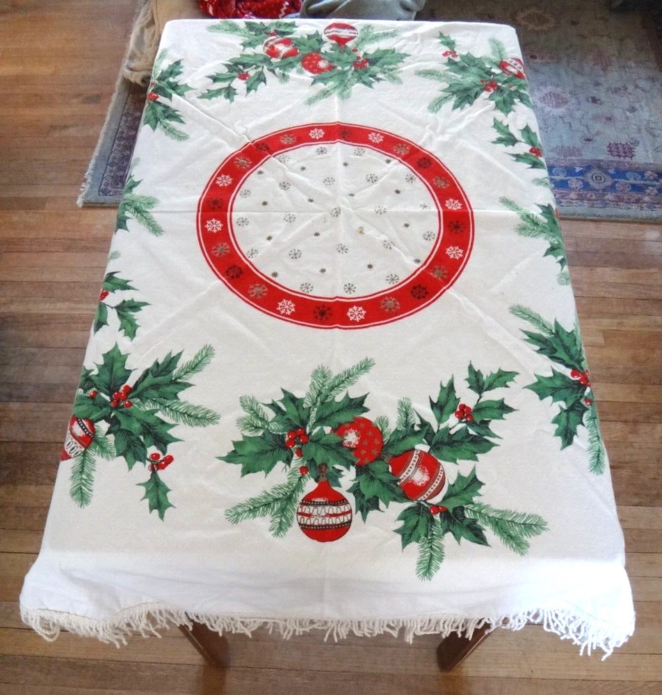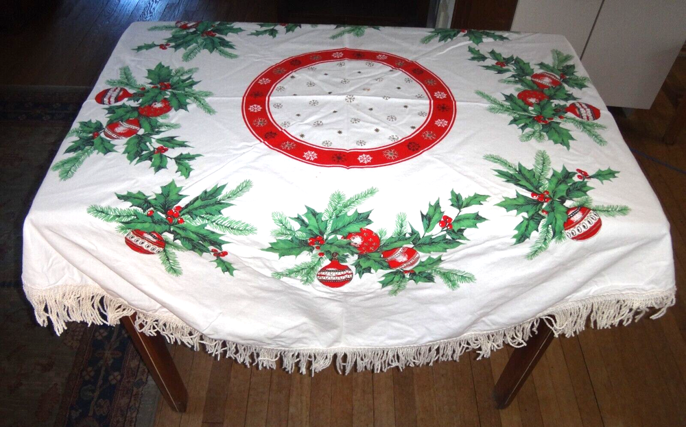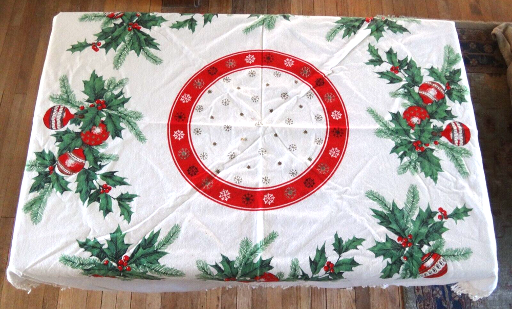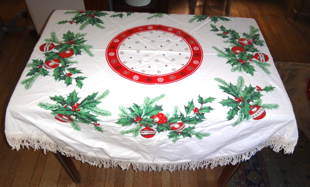ALL my items come from a SMOKE FREE home! You found my item because you're obviously looking for one and I have GOOD NEWS for you: I am on ebay PRICED TO SELL and NOT to display! My LOW LOW Buy It Now price is LESS than what other IDENTICAL or COMPARABLE items have SOLD for on ebay in the last 90 days! Want to try for an even BETTER deal? Shoot me your best offer; the worst that can happen is I decline and counteroffer, but IF YOUR OFFER IS REALISTIC AND NOT INSULTINGLY LOW my auctions are set to automatically accept "REASONABLE" offers so you might be INSTANTLY surprised! Check out my other auctions because I combine auctions to save you postage! Please note shipping costs are out of my control! I do my ABSOLUTE BEST to pack in a box which will measure and weigh the least while providing the best protection against damage in shipping. ALL carriers have increased postage costs, USPS postage is the default shipping method which in some cases will be more expensive than FedEx or UPS. The shipping estimator IS NOT ALWAYS CORRECT, so IF the postage seems high, PLEASE use the "Ask Seller a Question" button and provide your Zip Code so I can get you ACTUAL POSTAGE costs. I am happy to email you FULL-SCREEN, HIGH-RESOLUTION, pictures of all sides but you will need to provide an email address I can send them to. Conveniently located in WYCKOFF, NJ 07481, I am just 20 short miles WEST of MANHATTAN, NYC, NEW YORK CITY, and welcome local pick-ups, but I also ship WORLDWIDE! Although DRACONIAN eBay regulations prevent me from OFFERING to accept anything other than PayPal, it is YOUR RIGHT AS A BIDDER to ask me if you can pay otherwise because I offer a DISCOUNT for other types of payments! 1950's VINTAGE MCM Christmas Cotton Tablecloth with Green Holly Leaves and Pine Needles, Red, White and Gold Christmas Ball Ornaments and Snowflakes Measures 55" Round (plus 3" long fringes) I don't have a round table to use it on: The photo of it spread out was taken on a queen size bed. The table it is covering measures 25" x 40" Would also make a great Christmas Tree Skirt because the design allows a hole to be put in the center. Excellent Vintage Used Condition. I can't find any signs of use but there are a few very small spots which appear to be from storage because they line up when folded. I have NOT tried to clean it so they may come out with a professional cleaning. Pen points to them so you can see their location on the entire piece. Pix of it on the table are NOT duplicates: they show it from ALL 4 sides. Please refer to pix to determine condition.