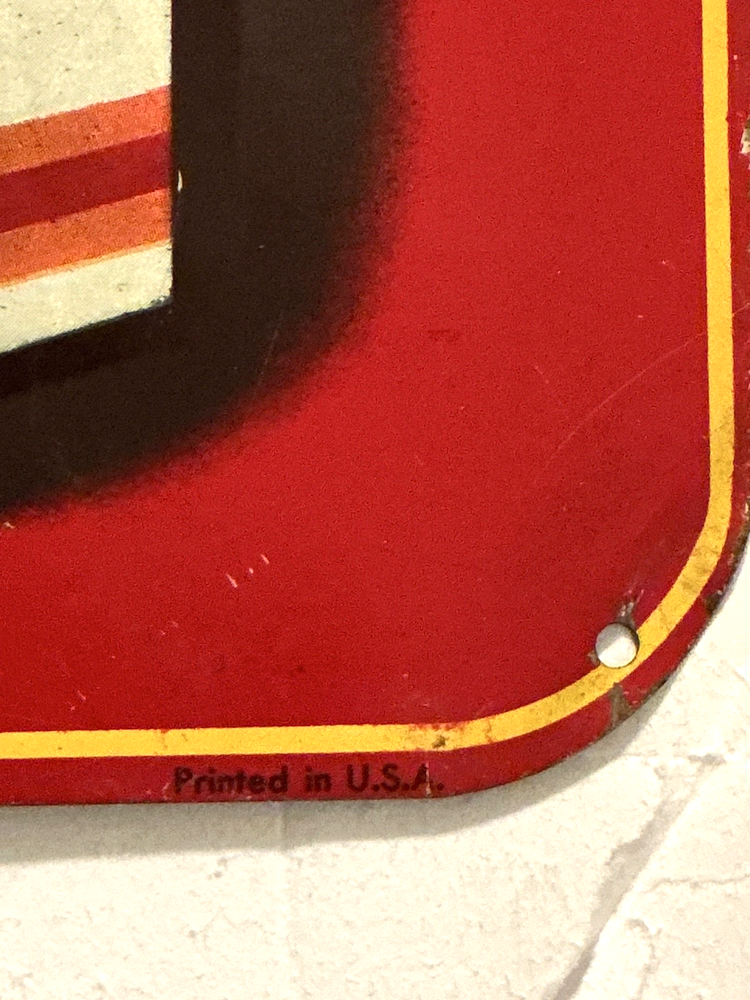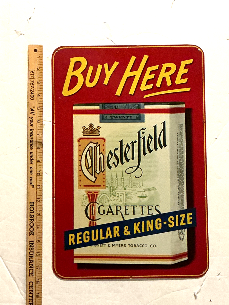 THIS LISTING IS FOR A VINTAGE 1950s-1960s SIGN IN GREAT ORIGINAL CONDITION “BUY HERE CHESTERFIELD CIGARETTES REGULAR & KING SIZE” (ADVERTISING SIGN) ITS 12” X17.5” AND MADE OUT OF TIN, ALSO MARKED MADE IN USA IN THE BOTTOM RIGHT HAND CORNER.