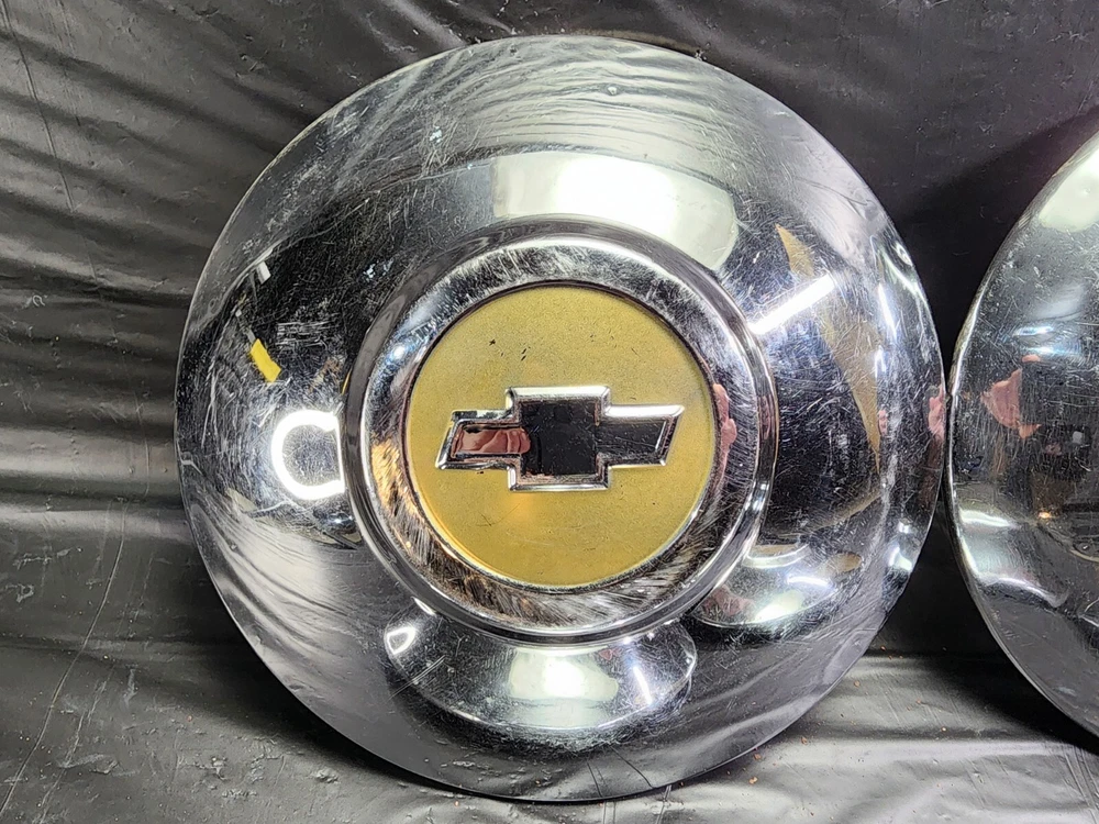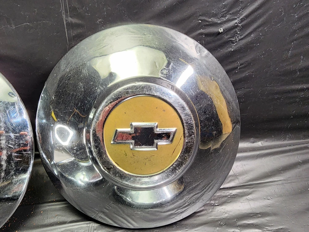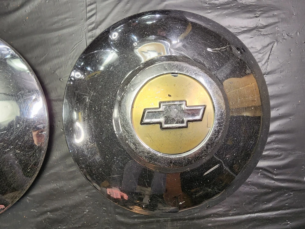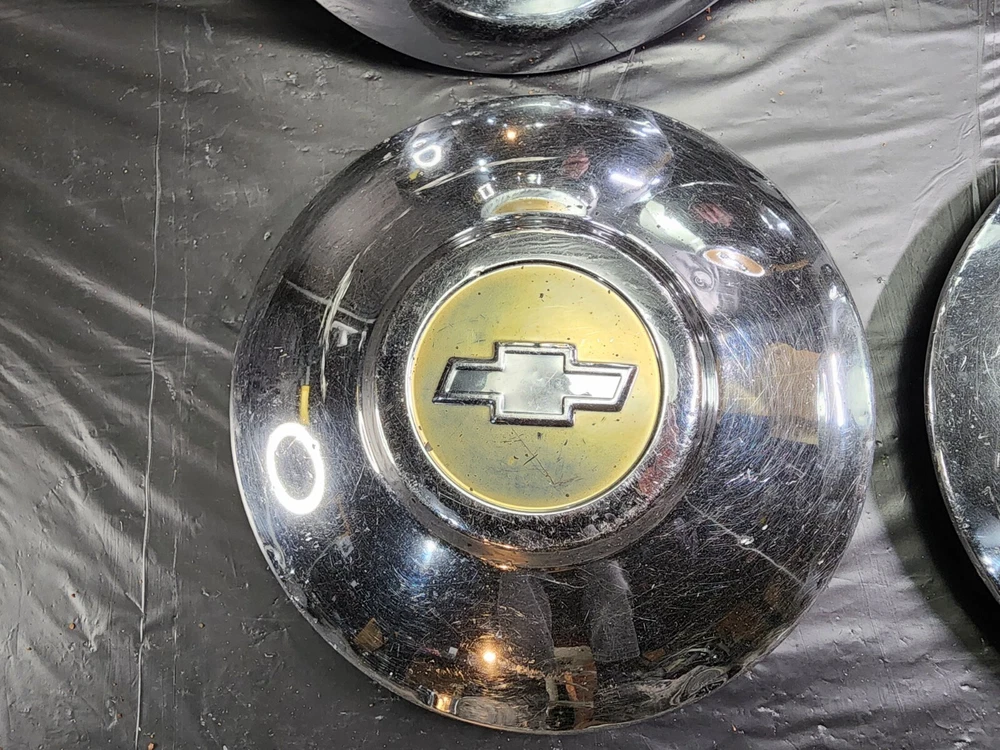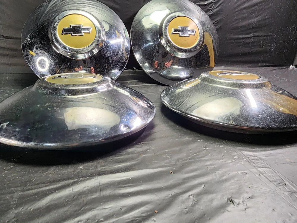 Vintage 40s 50s 60s 70s hub caps. 1950s chevy set of 4 Original OEM Factory OE hubcaps wheel covers center caps. in good condition considering their age and being used. These are Used hubcaps off of old classic cars that were driven on the road and used, so please see photos for complete condition as they are not all perfect. Most have some fading, dings, scuffing, mineral staining, etc could use a good polishing to bring em back to full shine, but otherwise in beautiful condition. Check out more of my ebay page as we are going through and listing a ton of classic / vintage hubcaps from the the 20's 30's 40's 50's 60's 70's 80's 90's 00's and up. all different makes and models such as Ford Chevy Chevrolet GM Cadillac GMC camero nova Chevelle Nomad Bel Air Mercury Corvette Mustang Oldsmobile Pontiac Lincoln Dodge Plymouth Buick Chrysler Mopar Fairlane Volkswagen Cheiftain Challanger Charger 1500 4x4 muscle car hot rod rat rod Cars and Trucks 15in 14in 16in and so much more from full sets to sets of 2 and singles, you name it check us out!