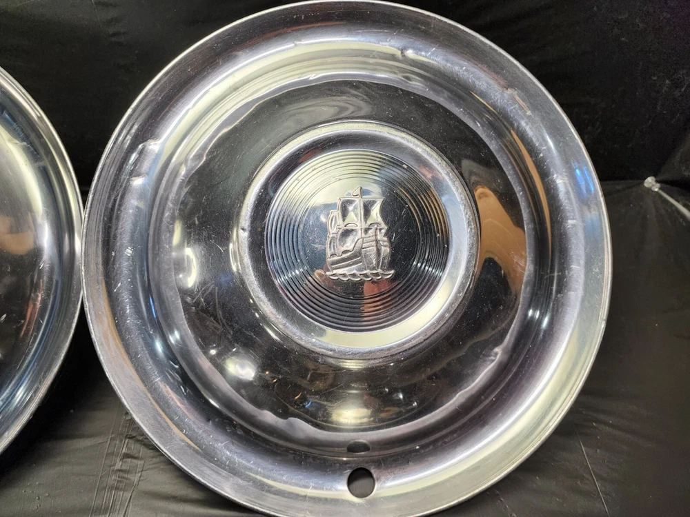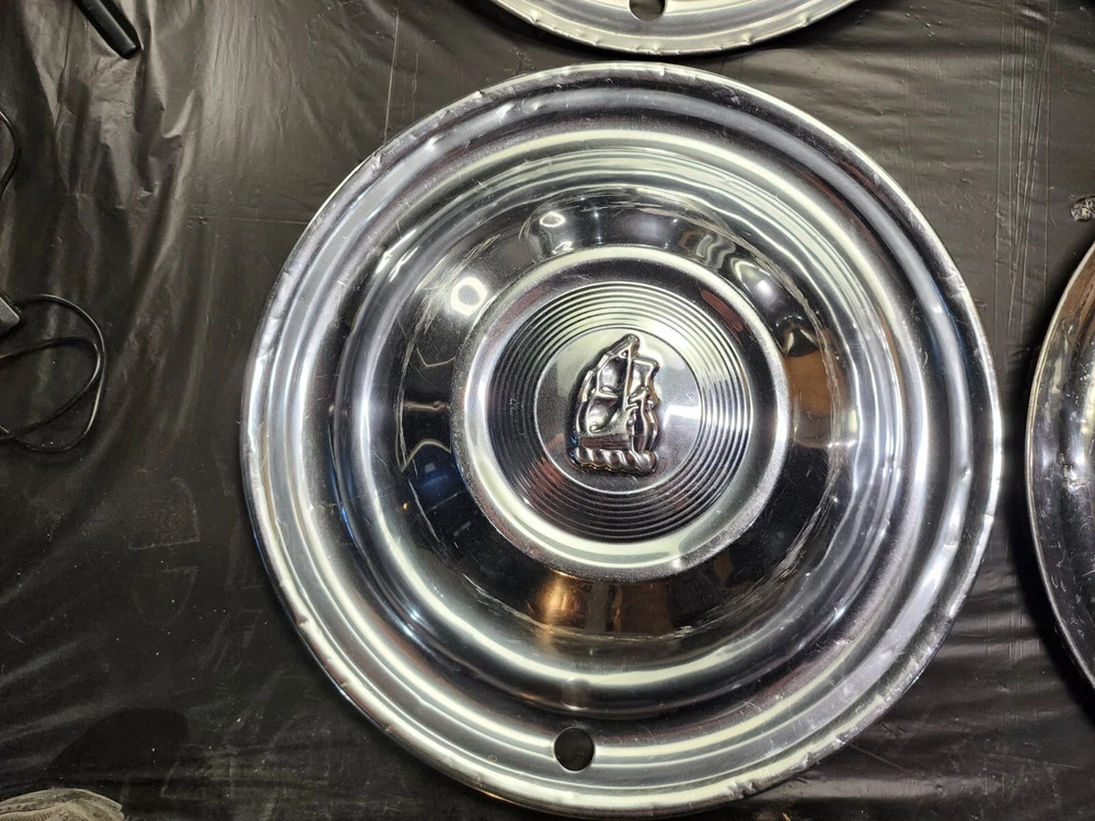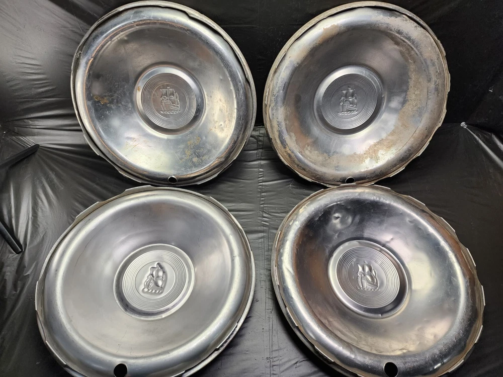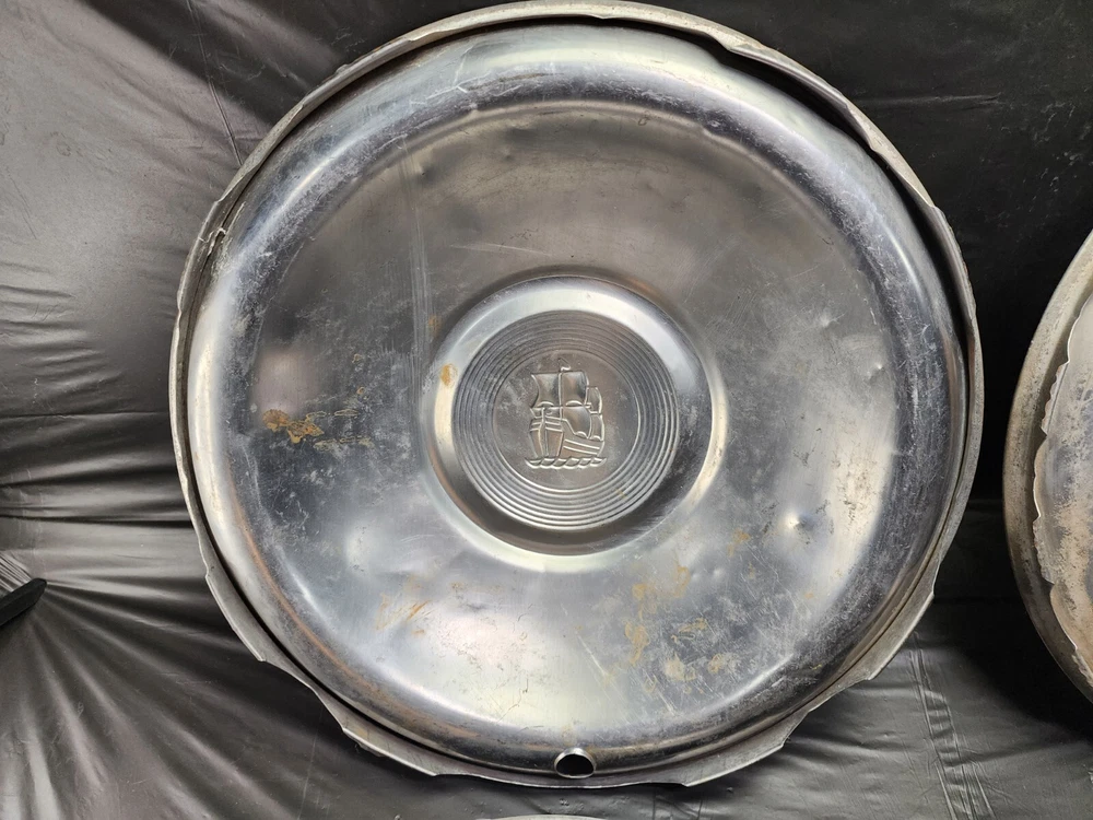 Vintage 50s 60s 70s hub caps. 1951 Plymouth Mopar set of 4 Original OEM OE hubcaps. not in the best of shape, pretty roughed up from decades of use and being on the road. would be decent for a ratrod or wall hangers. These are Used hubcaps off of old classic cars that were driven on the roadand used, so please see photos for complete condition as they are not all perfect. Most have some fading, dings, scuffing, mineral staining, etc could use a good polishing to bring em back to full shine, but otherwise in beautiful condition. Check out more of my ebay page as we are going through and listing a ton of classic / vintage hubcaps from the the 20's 30's 40's 50's 60's 70's 80's 90's 00's and up. all different makes and models such as Ford Chevy Chevrolet GM Cadillac GMC camero nova Chevelle Nomad Bel Air Mercury Corvette Mustang Oldsmobile Pontiac Lincoln Dodge Plymouth Buick Chrysler Mopar Fairlane Volkswagen Cheiftain Challanger Charger 1500 4x4 muscle car hot rod rat rod Cars and Trucks 15in 14in 16in and so much more from full sets to sets of 2 and singles, you name it check us out!