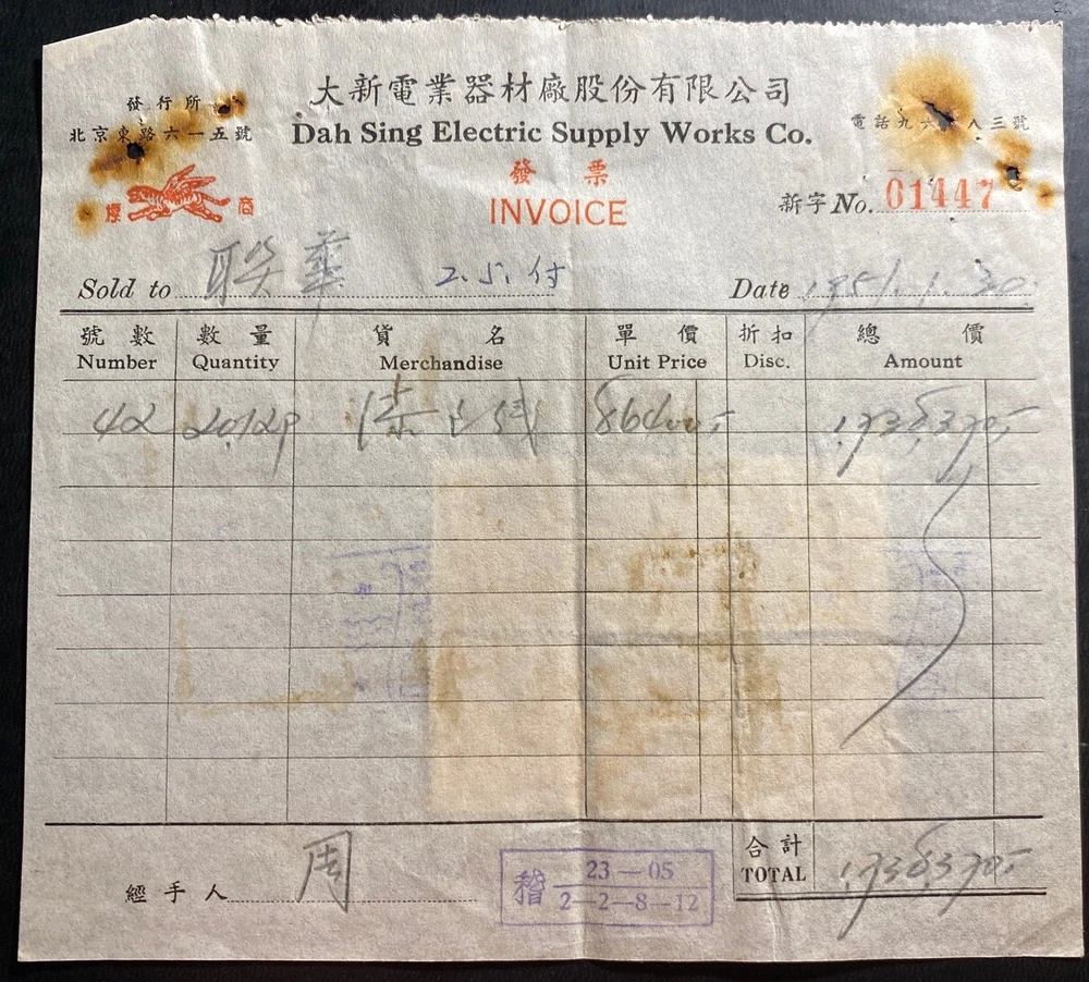 Up for auction is a beautiful revenue stamp receipt invoice cover from China . Great markings and cancels. In Good condition. Priced to sell. Postmarked in Chinese but dated in 1951. Nice postal History. Dah Sing Electric supply