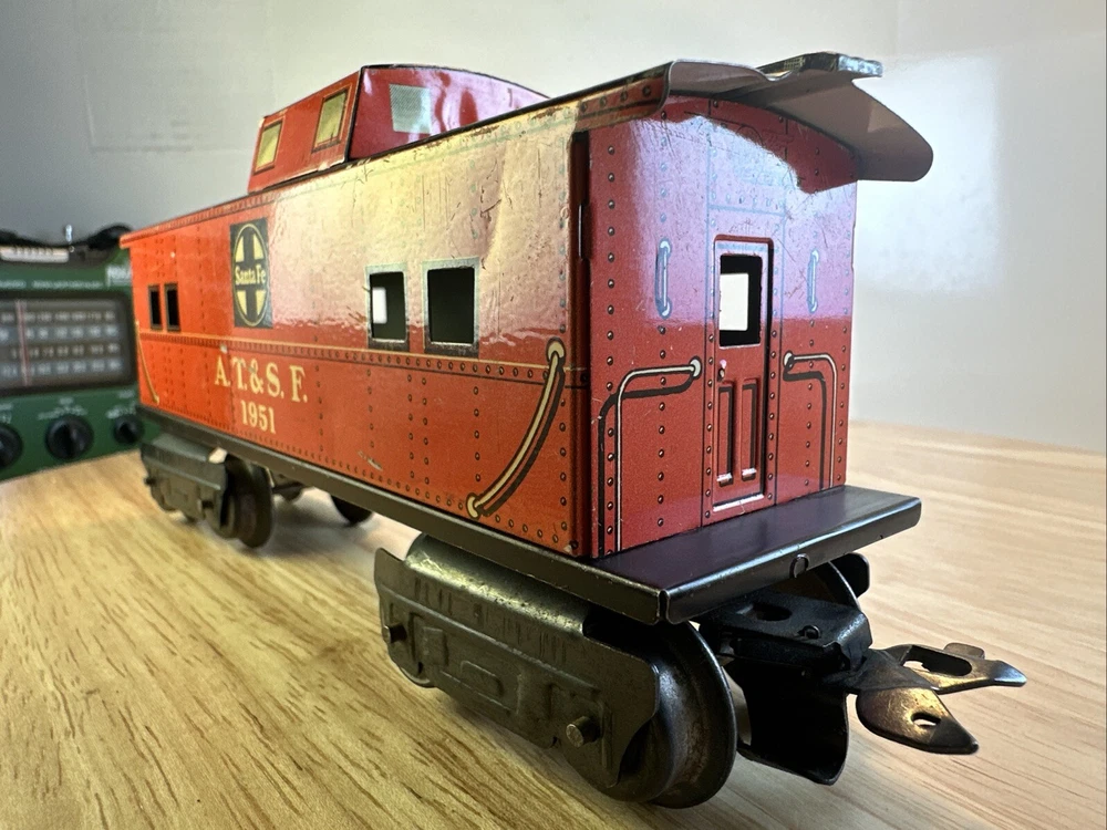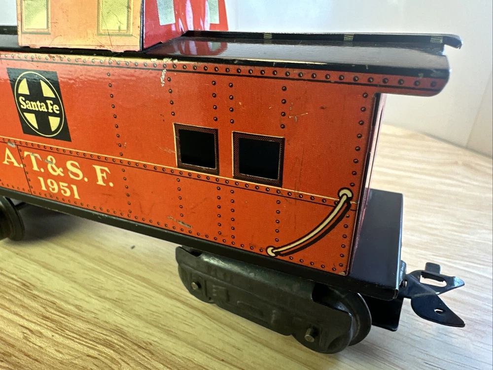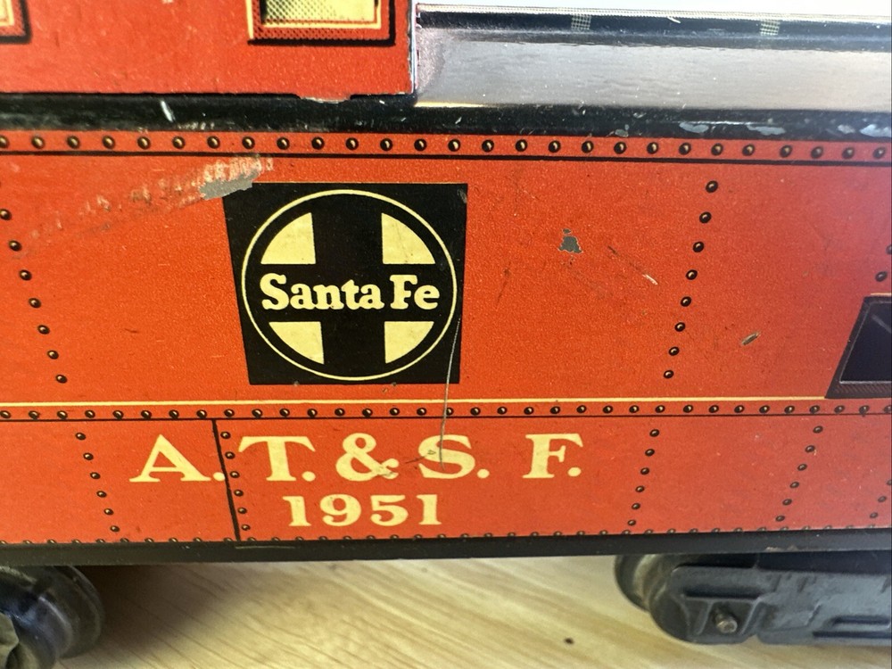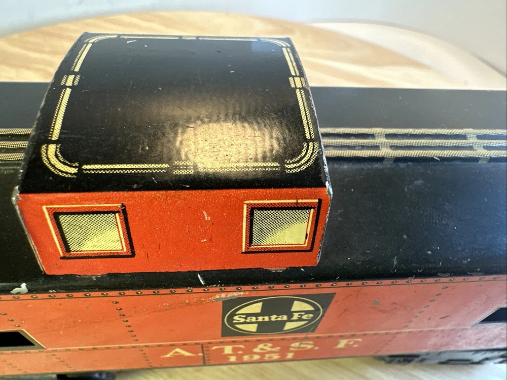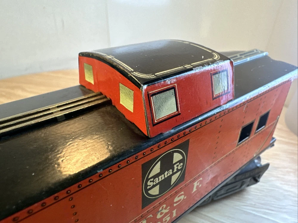 MARX O GAUGE ATSF CABOOSE 1951 Seven inch series Eight wheel design Missing one coupler ? FROM HUGE ESTATE SALE ITEM WILL BE SECURELY WRAPPED AND QUICKLY SHIPPED IN ONE BUSINESS DAY SOLD AS IS CONDITION