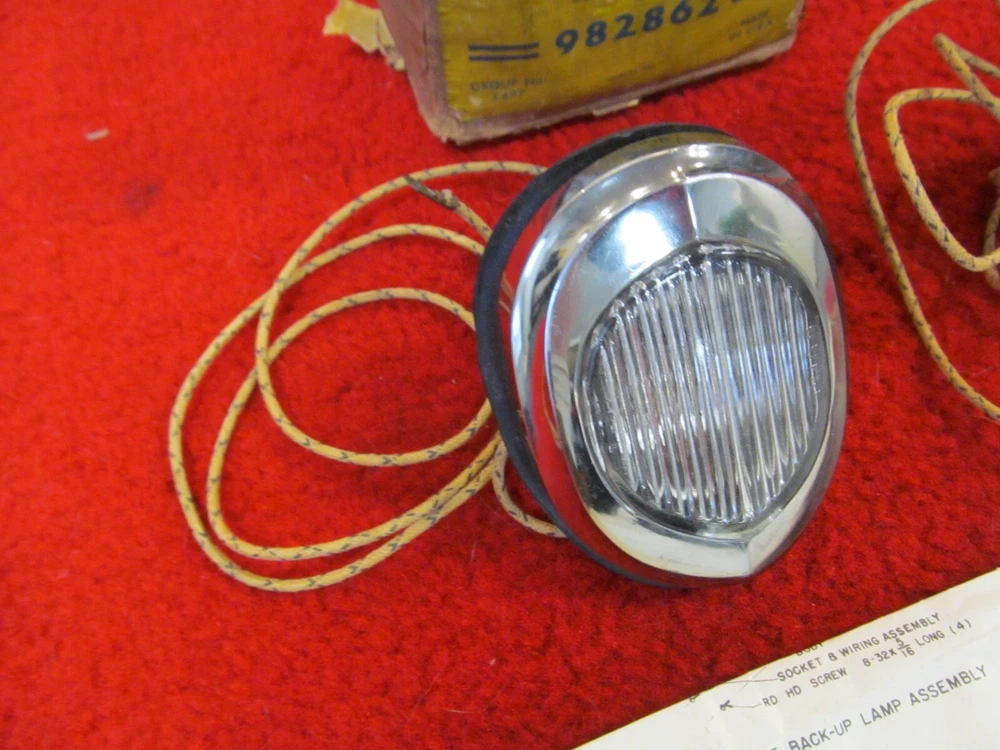 1952 Oldsmobile 88 NOS GM Accessory Backup Reverse Light Set. GM part # 982862. This is for cars that have a HT Automatic and did NOT come with back up lights. This NOS set looks incomplete-you get everything seen in pics. Gaskets are hard. Fusick Automotive Products