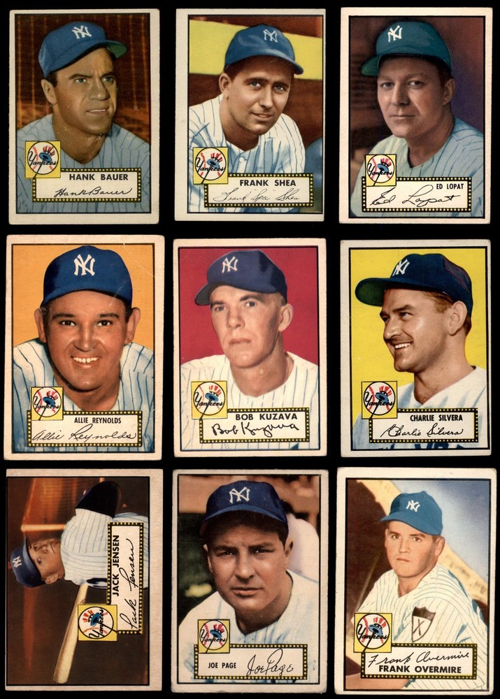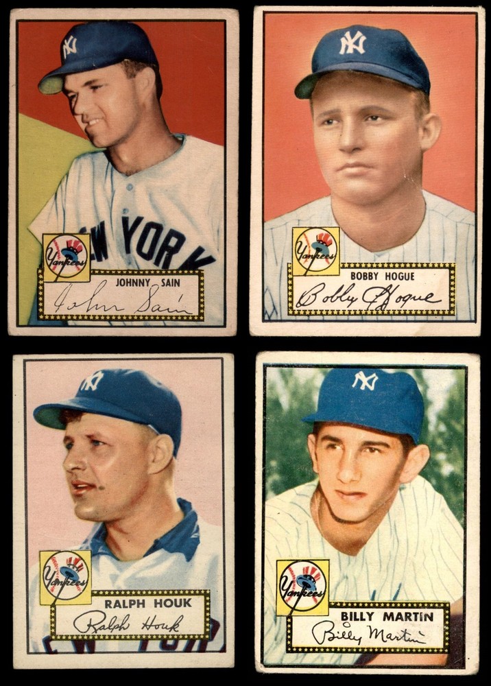 This set contains the following cards 1952 Topps #9 Bobby Hogue 2 - GOOD Front Back 1952 Topps #11 Phil Rizzuto 2 - GOOD Front Back 1952 Topps #48 COR Joe Page 1 - POOR Front Back 1952 Topps #49 COR Johnny Sain 1.5 - FAIR Front Back 1952 Topps #57 Eddie Lopat 3 - VG Front Back 1952 Topps #67 Allie Reynolds 1.5 - FAIR Front Back 1952 Topps #85 Bob Kuzava 2 - GOOD Front Back 1952 Topps #99 Gene Woodling 2 - GOOD Front Back 1952 Topps #122 Jackie Jensen 2 - GOOD Front Back 1952 Topps #128 Don Bollweg 2 - GOOD Front Back 1952 Topps #129 Johnny Mize 1.5 - FAIR Front Back 1952 Topps #155 CRM Frank Overmire 2 - GOOD Front Back 1952 Topps #168 CRM Charlie Silvera 2 - GOOD Front Back 1952 Topps #175 CRM Billy Martin 1 - POOR Front Back 1952 Topps #191 Yogi Berra 1 - POOR Front Back 1952 Topps #200 Ralph Houk 2 - GOOD Front Back 1952 Topps #202 Joe Collins 1 - POOR Front Back 1952 Topps #206 Joe Ostrowski 1.5 - FAIR Front Back 1952 Topps #214 Johnny Hopp 1 - POOR Front Back 1952 Topps #215 Hank Bauer 2 - GOOD Front Back 1952 Topps #237 Jerry Coleman 1 - POOR Front Back 1952 Topps #248 Frank Shea 3 - VG Front Back This is a 1952 Topps New York Yankees Low Number Team Set which does not include cards from the expensive high number series, cards #311-407. Set breakdown by grade: Number of Cards in Set 22 Average Grade - Weighted by Value 1.64 - FAIR Average Grade - Unweighted 1.73 - FAIR Grade Breakdown 3 - VG 2 2 - GOOD 10 1.5 - FAIR 4 1 - POOR 6 This near team set contains 22 cards out of the possible 29 cards. This is not a complete set. This set does not include the following cards: #311 Mickey Mantle, #331 Tom Morgan, #372 Gil McDougald, #373 Jim Turner, #384 Frank Crosetti, #400 Bill Dickey, #403 Bill Miller Dean's Cards offers a 100% Money Back Satisfaction Guarantee on all purchases. Just contact us within 10 days of the purchase date and we will refund your money or, when possible, replace the cards. 1952 Topps New York Yankees Low Number Team Set 1.5 - FAIR 6910618 (22 / 29 cards) If the scan in the listing says ACTUAL IMAGE, you will receive the card pictured. For cards issued after 1983, we will often use representative images and you will not receive the exact card pictured. Shipping Policy You only pay shipping on the first item. If you order multiple items on the same order, you will only be charged once for shipping. We do not combine shipping on multiple orders. To avoid multiple shipping charges we recommend using eBay's "Add to Cart" feature to check out multiple items in one transaction, or please request and allow for us to send an invoice to reflect the combined shipping charges. Canadian customers - We send all of our Canadian/International packages with tracking and cannot make any exceptions to this policy. Negotiating Prices All prices are final and we do not negotiate. This policy is to ensure that everyone knows that they are getting our best possible price. So please do not ask us to negotiate on price. Return Policy Dean's Cards has a 100% Money Back Satisfaction Guarantee on all purchases, as long as the product is returned within 30 days of receiving the product. Card Grading Each card is first reviewed by a member of our team, in order to detect any flaws that may not be visible on a scan, such as wrinkles, creases, print spots, or light stains. The vast majority of our vintage cards are professionally graded by the Dean's Cards Grading Software and include a 100% satisfaction guarantee. Our grading is on par with PSA standards when it comes to corners, centering and flaws - and tends to grade a bit tougher than PSA, on cards with a tilted image or rough edges. This grading software was developed to provide far better grading and consistency than can be achieved using the human eye. Determining the card's grade The sharpness of the corners and the degree to which a card was cut off-center determines the maximum possible grade that the card can receive. The card's grade is further reduced by any flaws or blemishes that it may have. Each card is evaluated on the following characteristics and assigned a score. Corners - Each corner of a card is individually analyzed, and then assigned a score on how square, sharp, and flawless it appears. Centering - The borders are measured, at multiple points along the edge, to determine the horizontal and vertical centering and tilt. Defects - The card is examined for imperfections, such as: size, print flaws, dings, stains, creases, or other wear which could lower its grade. Bonus for Perfect Centering - A vintage card, with near perfect centering, is given a one-half grade bonus. So when you buy one of our cards with a half-grade (e.g. 3.5 or 6.5) it will appear perfectly centered, both vertically and horizontally. Grading Criteria Worst Corner - A card can grade only as high as the worst corner will allow. Average Corner Tilt - The difference in width of a card border near the top, compared to the bottom. OCT - The sum of how far a card is Off-Center, plus its Tilt. Minimum Centering Requirements Eye Appeal - The combination of a card's centering, corners and tilt. Well-Centered - Cards that appear perfectly centered receive a bonus of one-half grade. Flaws, defects and other imperfections - can lower a card's grade. Card Backs - the above criteria is also considered, for the back of the cards, but does not inflict as severe of a penalty to its grade. Packaging Once scanned, the cards are placed in "soft" sleeves, which have an open top for easy removal. The Dean's Cards label is placed on the top back of the card sleeve. Every card you buy features a QR Code that you can scan to see your ACTUAL CARD and its grading statistics. Please note that when images are enlarged there may be instances of vertical lines running through the scans. This was caused by a "dust speck" on the scanner and can be verified by the vertical lines running into the black margins on the top and bottom of the image. About Dean and Dean's Cards Dean's Cards 