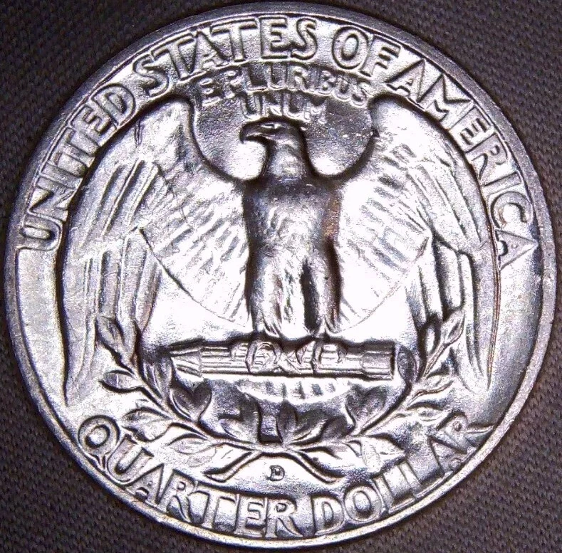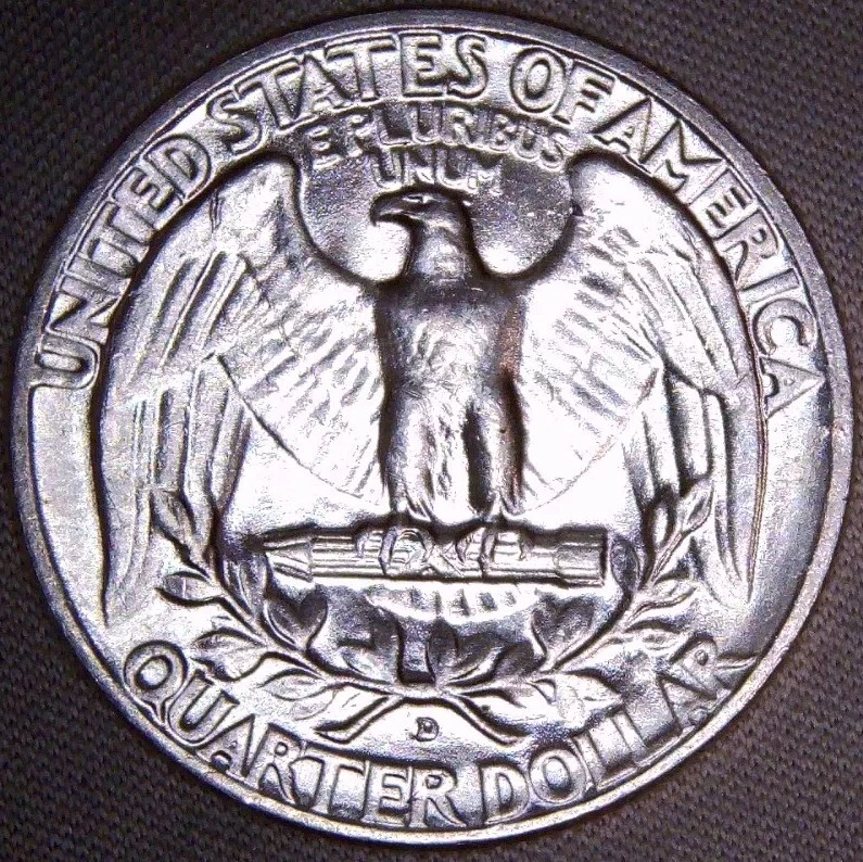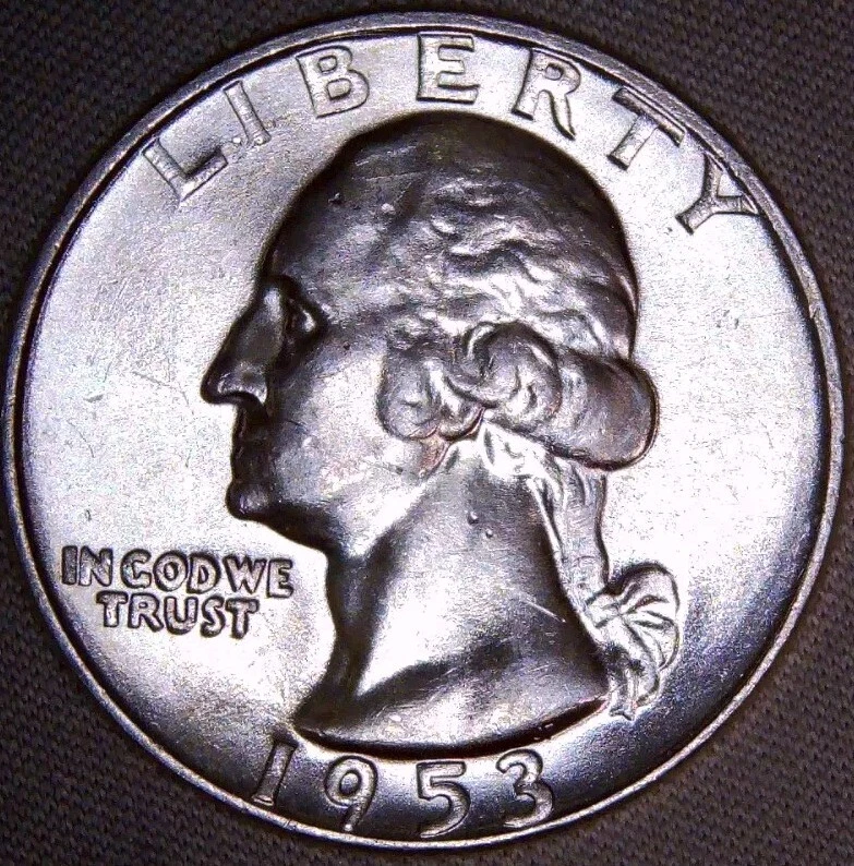 A 1953 Washington Quarter from the Denver mint, featuring a variety with the mint mark over a previous mint mark (OMM-001) and a repunched mint mark (FS-601). This uncirculated coin is composed of 90% silver and has a denomination of 25 cents.