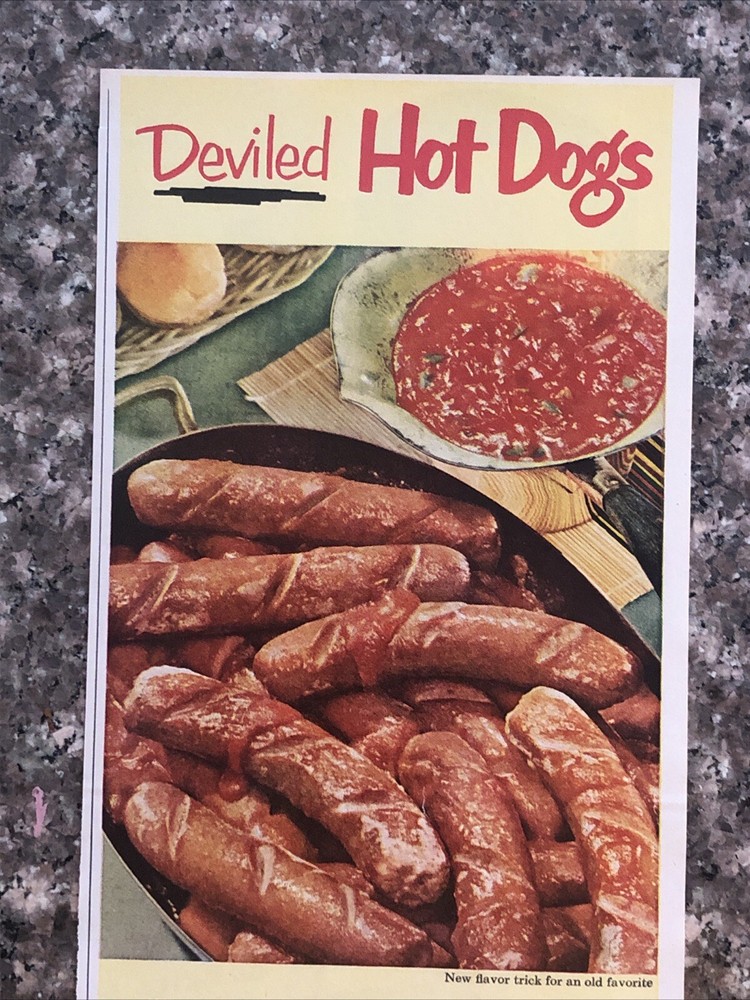 The product is a vintage magazine print ad from 1953 for French's Mustard featuring Deviled Hot Dogs made with Frenchwise Barbecue Sauce. The ad is multi-color and measures approximately 5"x12". It is an original advertisement created in the United States for French's brand.