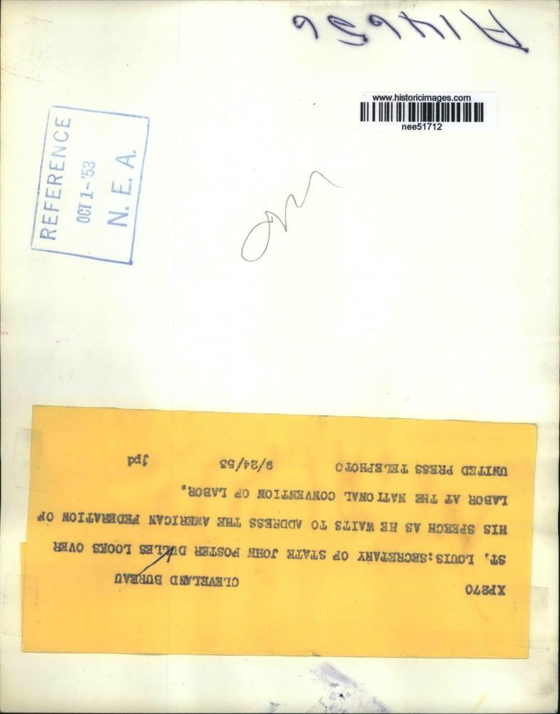 ebay template Note: Please study the images carefully to determine the condition of this vintage photograph, as it may not be in perfect condition. It may contain wrinkles, cracks, and possibly even tears due to its age and how it was handled before it got to us. A scanner may interpret colors and contrast differently than human eyes will, so it is possible that the actual photograph may be slightly darker or lighter in person. This vintage photograph is offered for sale as a collectible item and conveys no transfer of copyright. 1953 Press Photo Secretary of State John Foster Dulles - nee51712 This is an original press photo. Photo measures 7 x 9inches. Photo is dated 9-24-1953. PHOTO FRONT PHOTO BACK Historic Images Part Number: nee51712 Sell Smarter with Kyozou. Inventory and Ecommerce Management
