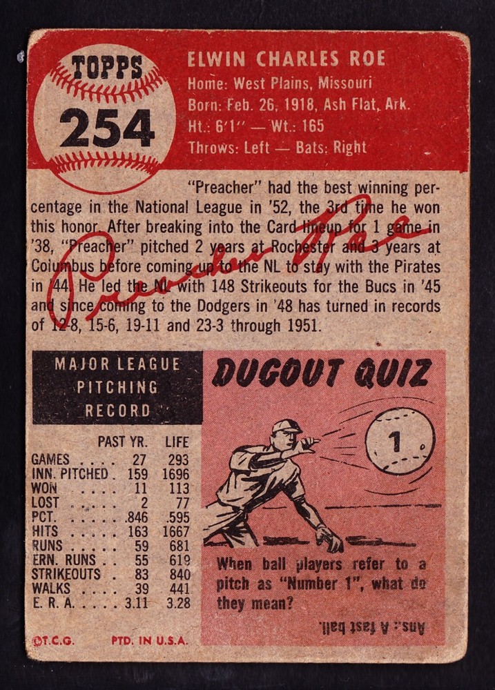 1953 TOPPS #254 PREACHER ROE BROOKLYN DODGERS . CARD HAS VERY SMALL VERY LIGHT CORNER CREASE. FREE SHIPPING. Inventory #210119