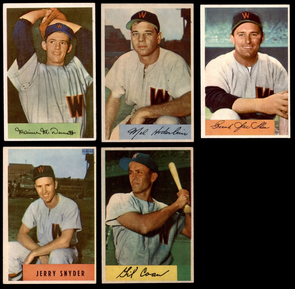 This set contains the following cards 1954 Bowman #8 Jim Busby 4 - VG/EX Front Back 1954 Bowman #24 Bob Porterfield 6 - EX/MT Front Back 1954 Bowman #40 Gil Coan 4 - VG/EX Front Back 1954 Bowman #56 Mickey McDermott 4 - VG/EX Front Back 1954 Bowman #72 Eddie Yost 4 - VG/EX Front Back 1954 Bowman #88 Tom Umphlett 4 - VG/EX Front Back 1954 Bowman #104 Frank Shea 5 - EX Front Back 1954 Bowman #120 Mel Hoderlein 4 - VG/EX Front Back 1954 Bowman #136 Clyde Vollmer 6 - EX/MT Front Back 1954 Bowman #152 Mickey Vernon 5 - EX Front Back 1954 Bowman #168 Ed Fitzgerald 4 - VG/EX Front Back 1954 Bowman #180 Joe Tipton 5 - EX Front Back 1954 Bowman #200 Connie Marrero 4 - VG/EX Front Back 1954 Bowman #216 ALL Jerry Snyder 3 - VG Front Back This 1954 Bowman Washington Senators Team Set contains the 1954 Bowman Senators baseball cards and makes a great gift for any Senators fan. ?With an inventory of over 15,000 team sets, Dean's Cards has Team Sets & Near Team Sets for just about every team, in multiple conditions, for all sports, for most major sets issued between 1909 and 1979. Both Topps & Bowman issued baseball card sets in 1954., and while a few players had cards in both sets, most only appeared in one. For the collector to get all of the 1954 baseball cards for a particular team, he should purchase both the 1954 Topps and 1954 Bowman Team sets.