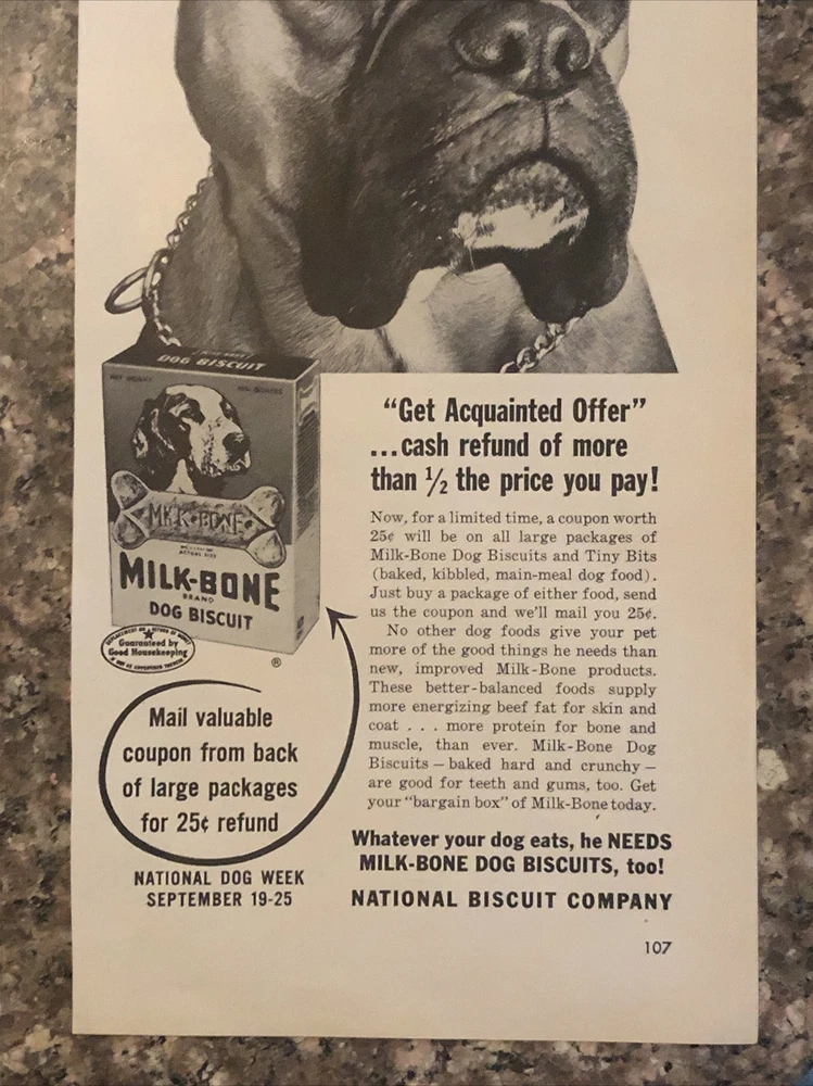 Theme: Pets Date of Creation: 1954 Color: Black & White Brand: Milk-Bone Type of Advertising: Magazine Print Ad Original/Reproduction: Original Country/Region of Manufacture: United States