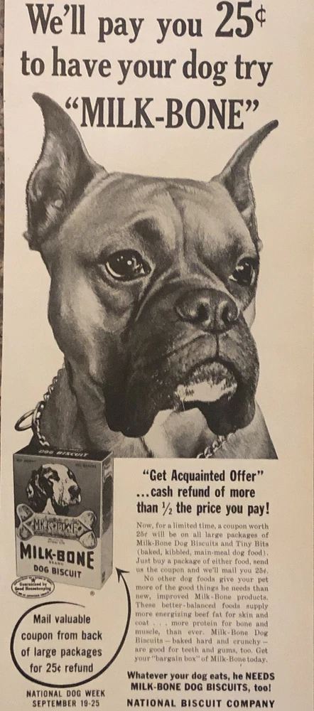 1954 Milk-Bone Dog Biscuit We Pay Your Dog To Try Boxer Treat VTG 1950s PRINT AD