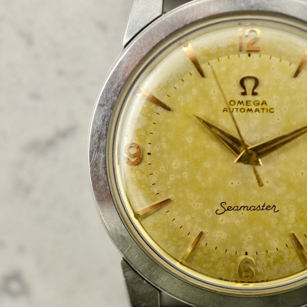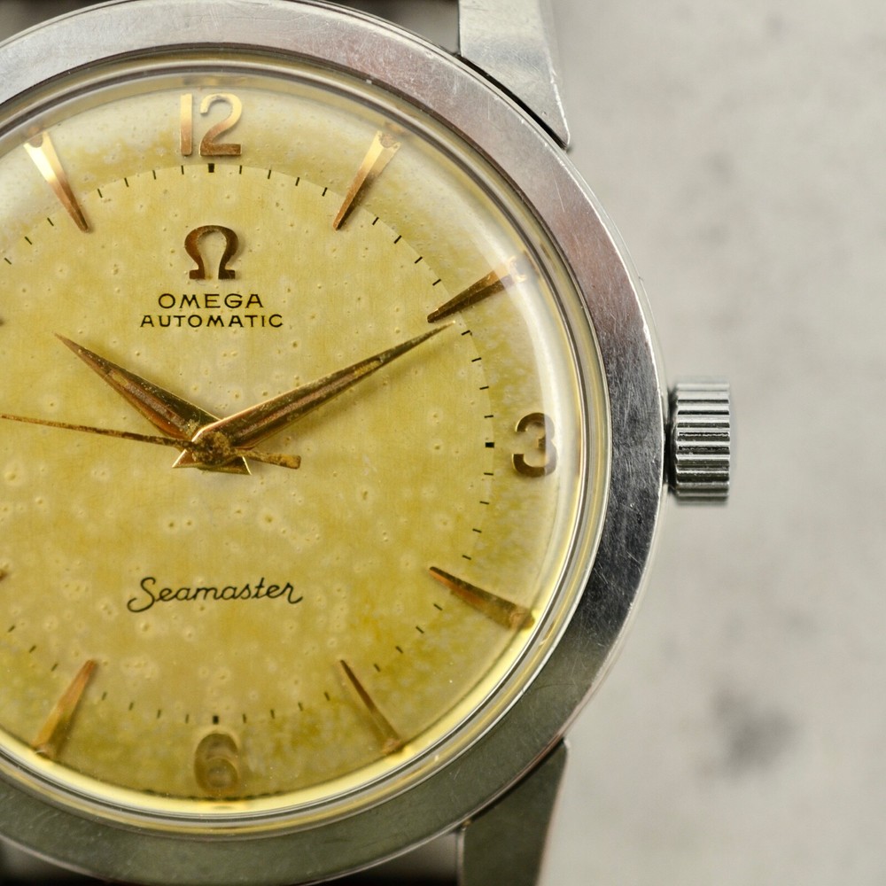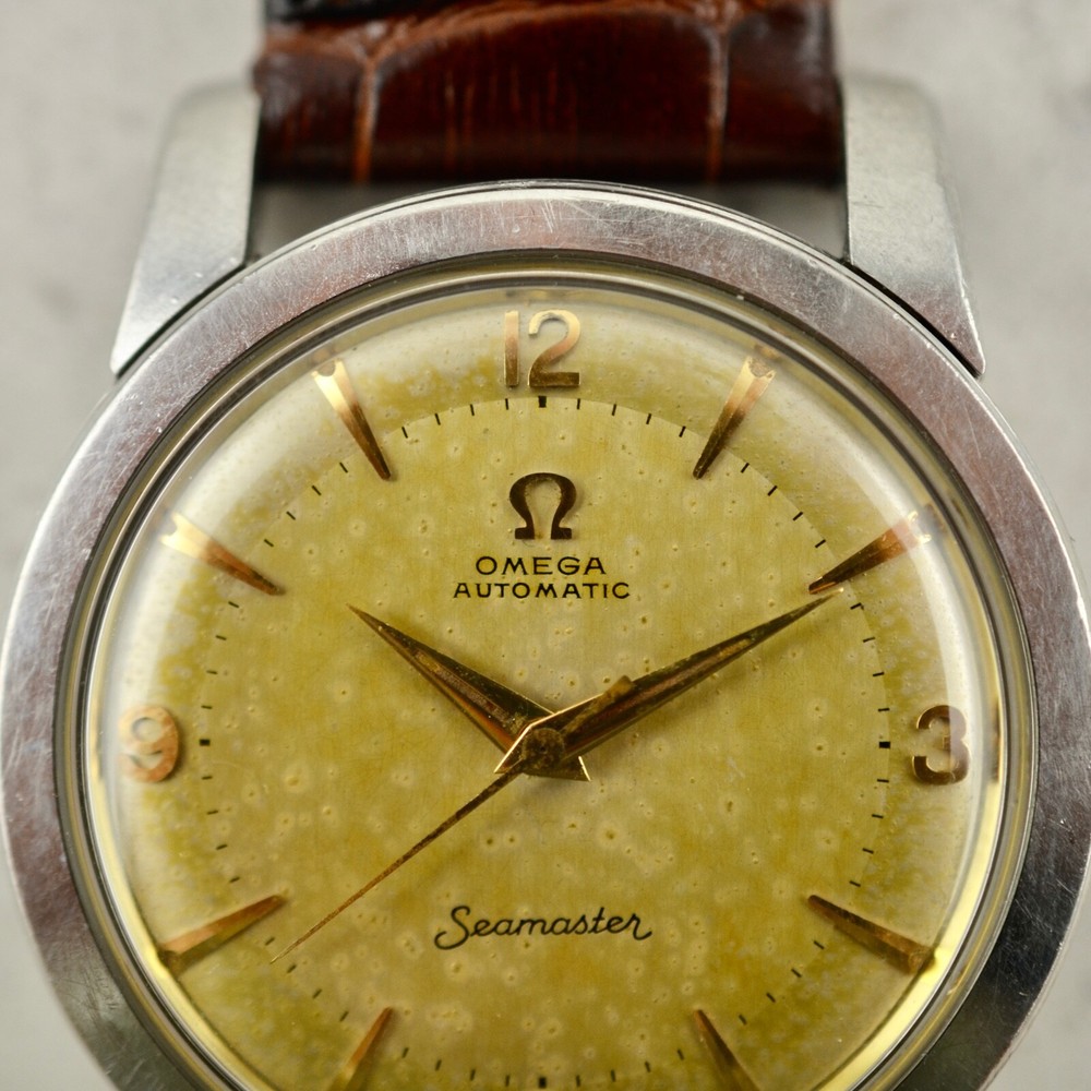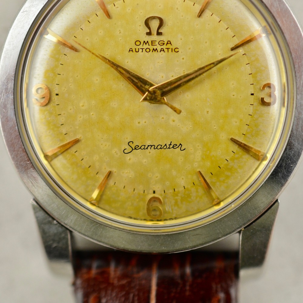 Omega Seamaster Automatic, tropical dial, ref. 2767-3 SC, in steel A rare and fine Omega Automatic Seamaster, reference 2767-3 SC. Stainless steel case, snap-on back, 34mm diameter, "Seamaster-Waterproof" etching, oversized downturned lugs. Case maintains the original factory finish. Original two-tone tropical aged Explorer dial with applied gold arrow markers, arabic numerals to quarters and luminous plots, in very good condition. Applied gold "Ω" logo with printed "Omega Automatic" below 12 o'clock and "Seamaster" print above 6 o'clock. Original gold toned dauphine hands with luminous infill. Replacement crown. Replacement plexi-crystal. Omega Caliber Ω 354 automatic winding movement, recently serviced and in good running order. Brand New Leather band with steel buckle. Terms and Conditions of Sale Condition and Authenticity: At Mister Wolf Time, your undivided trust is of the upmost importance to our continued success. We provide a full guarantee for authenticity of all items offered for sale, or your money will be returned in full. All items go through a multi-point inspection, examining their authenticity and condition, before being offered for sale. Watches and accessories are sold on an as-is basis, due to their vintage and often fragile nature. No warranty or guarantee is provided for the long-term functionality of any timepiece or accessory sold. All items are our own stock, and do not belong to dealers or external third parties. We do not offer a consignment or re-sale service. We do not offer any in-house restoration, however can recommend local service agents and representatives upon request. Shipping and Handling: We are proud to offer all products available for shipping worldwide. Items will only be shipped, once cleared payment has been received in full. Once payment has been received in full, please allow for 1 business day for dispatch. All orders will be shipped using Australia Post Express mail with signature within Australia, and EMS with signature Internationally. Other courier services (DHL & FedEx) can be arranged at the buyer’s expense. The buyer will assume full responsibility over any associated risks, once the parcel has been dispatched. Pick up is not available at this time. All items are professionally packaged to avoid damage whilst in transit. Mister Wolf Time is not directly responsible for any loss or damage incurred through transit. In the event an item is lost, buyers will be refunded after an insurance claim has been both approved and paid. All International buyers will assume full responsibility for fees, duties or taxes imposed on them by local customs authorities. The buyer will assume full responsibility over the item, if this event takes place. No refunds will be issued for items seized by customs, unless they are returned within 14 days of receipt and in the same condition as when dispatched. All parcels will be shipped with full disclosure of the purchase price. Cancellations, Returns and Refunds All items offered for sale include a detailed description as well as a range of high-resolution photos. Should further clarification be required for any item, please contact us prior to purchasing. If an item does not meet the buyer’s satisfaction and legitimate reasoning is provided, you may contact us to arrange a return within 3-days of receiving the item. I tems may not be returned at the end of this 3-day inspection period. All costs associated with the return of an item are at the responsibility of the buyer. A refund will be issued upon safe receipt and inspection of the item. Refunds will not be issued for items which have been tampered with or are not in their original state. At this time, items are offered for sale on our website, through our social media and eBay store. Should an issue arise over the successful purchaser of an item, Mister Wolf Time will issue ownership to the first buyer to pay for the item. GST Australian buyers are subject to the payment of GST, which is included within the purchase price. Payment Policy We are happy to accept PayPal, Bank Transfer and Credit/Debit Card.