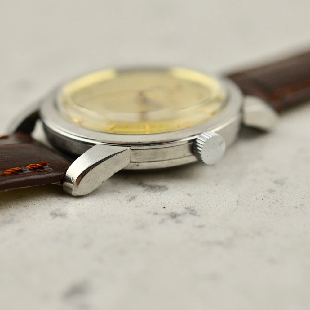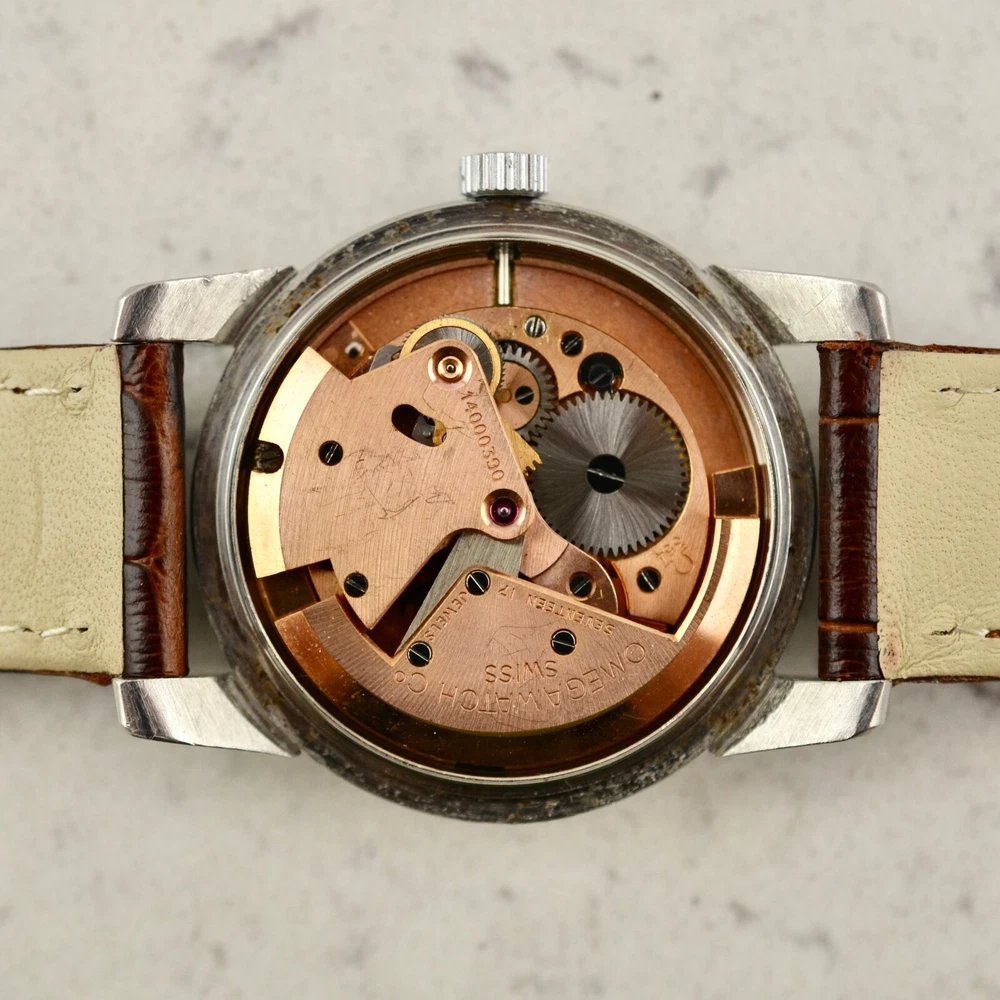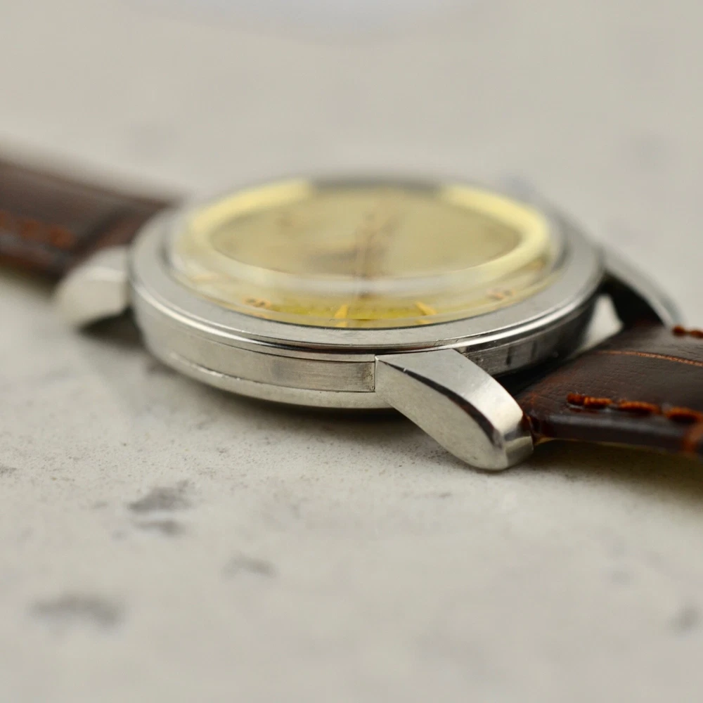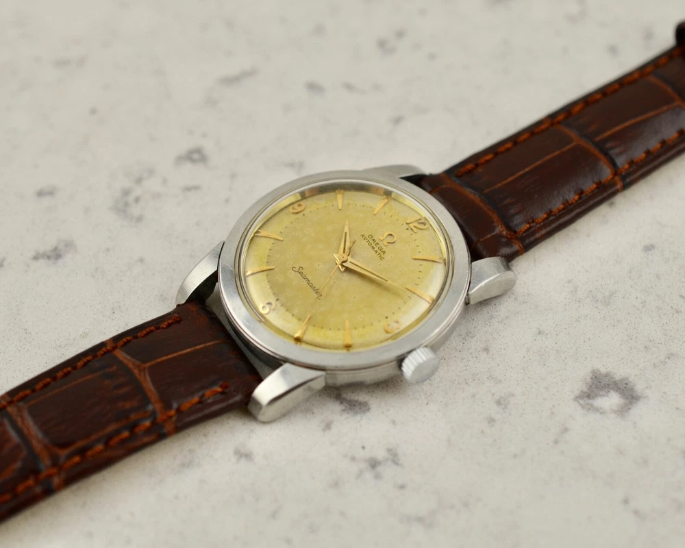 Omega Seamaster Automatic, tropical dial, ref. 2767-3 SC, in steel A rare and fine Omega Automatic Seamaster, reference 2767-3 SC. Stainless steel case, snap-on back, 34mm diameter, "Seamaster-Waterproof" etching, oversized downturned lugs. Case maintains the original factory finish. Original two-tone tropical aged Explorer dial with applied gold arrow markers, arabic numerals to quarters and luminous plots, in very good condition. Applied gold "Ω" logo with printed "Omega Automatic" below 12 o'clock and "Seamaster" print above 6 o'clock. Original gold toned dauphine hands with luminous infill. Replacement crown. Replacement plexi-crystal. Omega Caliber Ω 354 automatic winding movement, recently serviced and in good running order. Brand New Leather band with steel buckle. Terms and Conditions of Sale Condition and Authenticity: At Mister Wolf Time, your undivided trust is of the upmost importance to our continued success. We provide a full guarantee for authenticity of all items offered for sale, or your money will be returned in full. All items go through a multi-point inspection, examining their authenticity and condition, before being offered for sale. Watches and accessories are sold on an as-is basis, due to their vintage and often fragile nature. No warranty or guarantee is provided for the long-term functionality of any timepiece or accessory sold. All items are our own stock, and do not belong to dealers or external third parties. We do not offer a consignment or re-sale service. We do not offer any in-house restoration, however can recommend local service agents and representatives upon request. Shipping and Handling: We are proud to offer all products available for shipping worldwide. Items will only be shipped, once cleared payment has been received in full. Once payment has been received in full, please allow for 1 business day for dispatch. All orders will be shipped using Australia Post Express mail with signature within Australia, and EMS with signature Internationally. Other courier services (DHL & FedEx) can be arranged at the buyer’s expense. The buyer will assume full responsibility over any associated risks, once the parcel has been dispatched. Pick up is not available at this time. All items are professionally packaged to avoid damage whilst in transit. Mister Wolf Time is not directly responsible for any loss or damage incurred through transit. In the event an item is lost, buyers will be refunded after an insurance claim has been both approved and paid. All International buyers will assume full responsibility for fees, duties or taxes imposed on them by local customs authorities. The buyer will assume full responsibility over the item, if this event takes place. No refunds will be issued for items seized by customs, unless they are returned within 14 days of receipt and in the same condition as when dispatched. All parcels will be shipped with full disclosure of the purchase price. Cancellations, Returns and Refunds All items offered for sale include a detailed description as well as a range of high-resolution photos. Should further clarification be required for any item, please contact us prior to purchasing. If an item does not meet the buyer’s satisfaction and legitimate reasoning is provided, you may contact us to arrange a return within 3-days of receiving the item. I tems may not be returned at the end of this 3-day inspection period. All costs associated with the return of an item are at the responsibility of the buyer. A refund will be issued upon safe receipt and inspection of the item. Refunds will not be issued for items which have been tampered with or are not in their original state. At this time, items are offered for sale on our website, through our social media and eBay store. Should an issue arise over the successful purchaser of an item, Mister Wolf Time will issue ownership to the first buyer to pay for the item. GST Australian buyers are subject to the payment of GST, which is included within the purchase price. Payment Policy We are happy to accept PayPal, Bank Transfer and Credit/Debit Card.