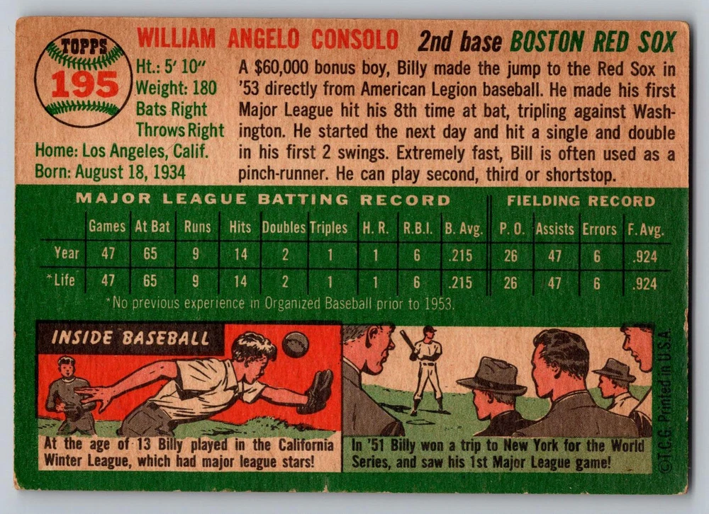 1954 Topps #195 Bill Consolo Boston Red Sox Rookie This card is in Very Good condition. Please carefully review the images before placing a bid. If you have any questions about the card, feel free to send us a message. Shipping 1 card: $3.00 2-3 cards: $4.00 4 or more cards: $5.00 FAQ Invoices: Invoices are sent every evening around 10 p.m. ET. Please wait to pay until you receive a new invoice. Combined shipping: We combine shipping on multiple orders to save you money . Payment: Payment is due within 7 days of auction ending. NON-PAYING Buyers are blocked from future business. Auctions: New auctions typically begin every weekday around 6 p.m. ET and run for 10 days Shipping methods: All orders are shipped via either eBay Standard Envelope or USPS Ground Advantage. Orders over $20 are usually shipped with USPS Ground Advantage. Always no reserve and low opening bid.