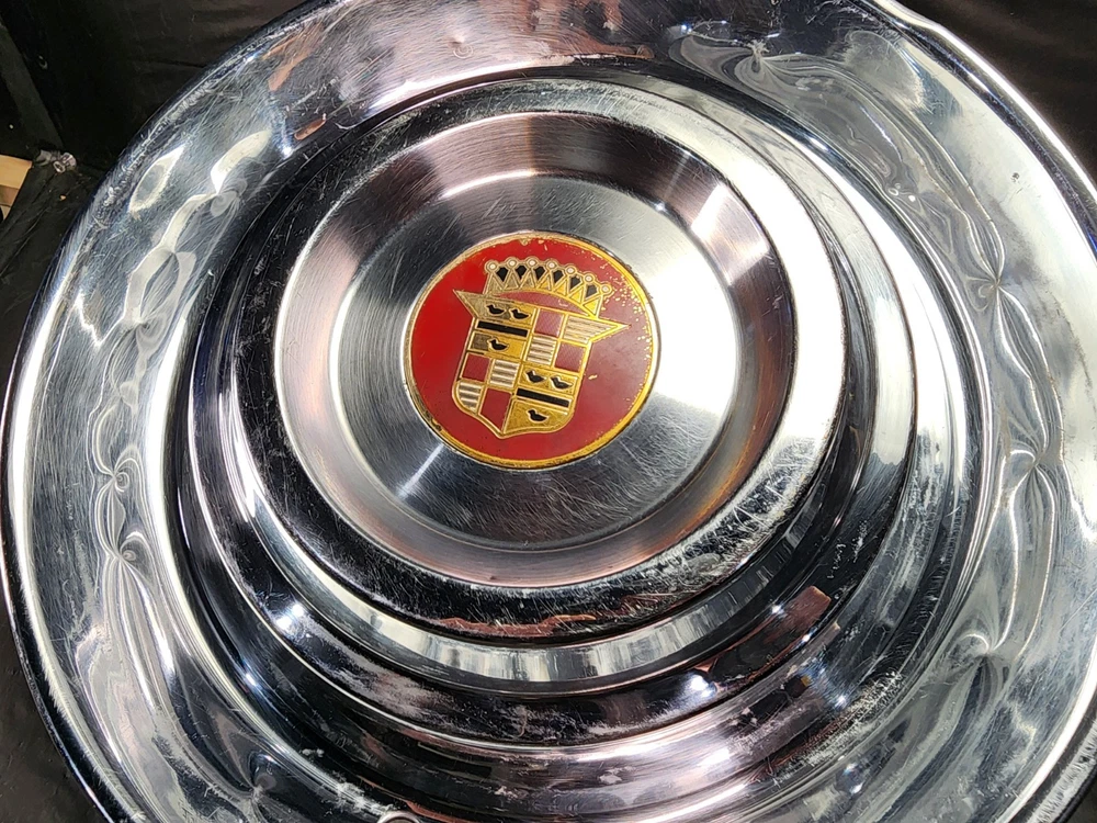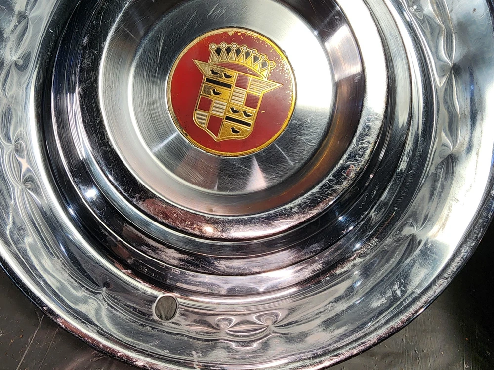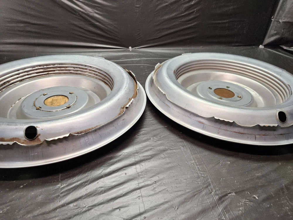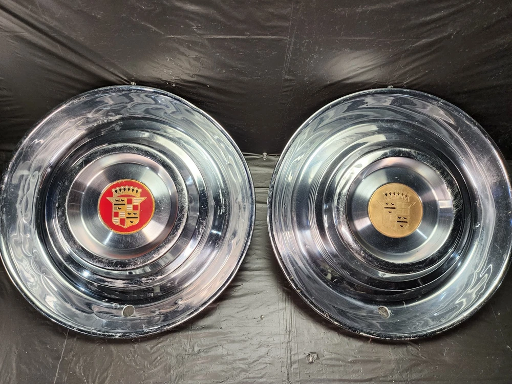 Vintage 40s 50s 60s 70s hub caps. 1954 1955 Cadillac pair of 2 Original OEM Factory OE hubcaps wheel covers center caps. in good condition considering their age and being used. These are Used hubcaps off of old classic cars that were driven on the road and used, so please see photos for complete condition as they are not all perfect. Most have some fading, dings, scuffing, mineral staining, etc could use a good polishing to bring em back to full shine, but otherwise in beautiful condition. Check out more of my ebay page as we are going through and listing a ton of classic / vintage hubcaps from the the 20's 30's 40's 50's 60's 70's 80's 90's 00's and up. all different makes and models such as Ford Chevy Chevrolet GM Cadillac GMC camero nova Chevelle Nomad Bel Air Mercury Corvette Mustang Oldsmobile Pontiac Lincoln Dodge Plymouth Buick Chrysler Mopar Fairlane Volkswagen Cheiftain Challanger Charger 1500 4x4 muscle car hot rod rat rod Cars and Trucks 15in 14in 16in and so much more from full sets to sets of 2 and singles, you name it check us out!
