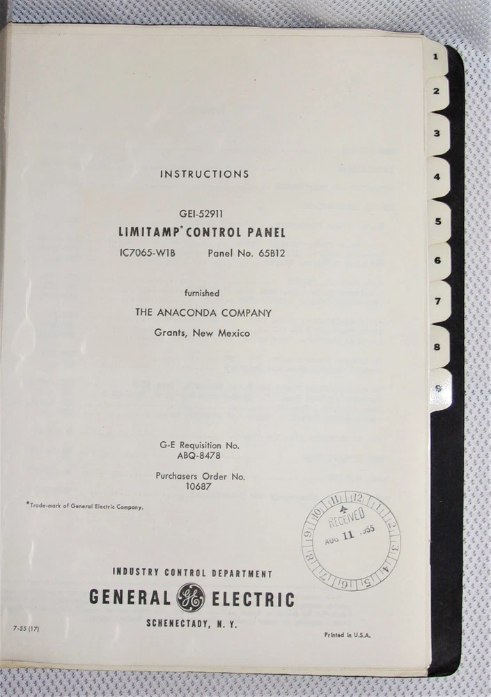 1955 GE Limitamp Control Panel Manual / GE 1950's Air Circuit Breaker Manual 1955 GE Limitamp Control Panel Manual AND GE 1950's Air Circuit Breaker Manual Anaconda Copper Mining Co. Grants, New Mexico Bound in soft leather-like material Limitamp Control Panel Manual IC7065-W16 Panel No. 65B12 General Electric Company June, 1955 Very good condition for its age. Pages clean and tight. The contents of this manual include: Description Installation Operation and Maintenance Device Instructions Panel Drawing List Panel Outline Panel Diagram And some blueprints This manual has tabs numbered 1-9 Approx. 60 pages, 2 envelopes, and a few blueprints. 11.5" x 9.5" Air Circut Breaker Manual Type AK-1-50-1 Manually Operated General Electric Company 1950 Very good condition for its age. Clean and tight pages. The contents of this manual include: Introduction Recieving, Handling, and Storage Installation Operation Maintenance Basic Breaker Components Protective Devices Miscellaneous Renewal Parts Approx. 25 pages 11.5" x 9.5" The pictures that are provided are for your convenience and are of the exact item being sold. Please examine all of the available pictures well before making any purchases. Please ask any questions before purchase. Thanks! Powered by SixBit's eCommerce Solution