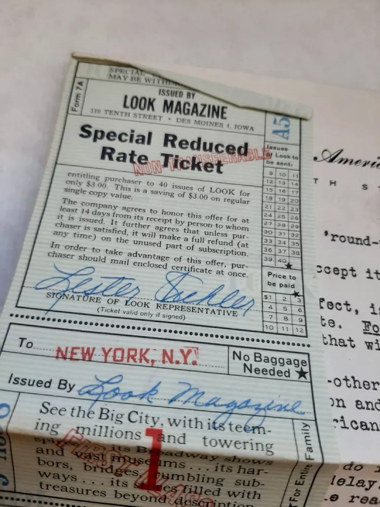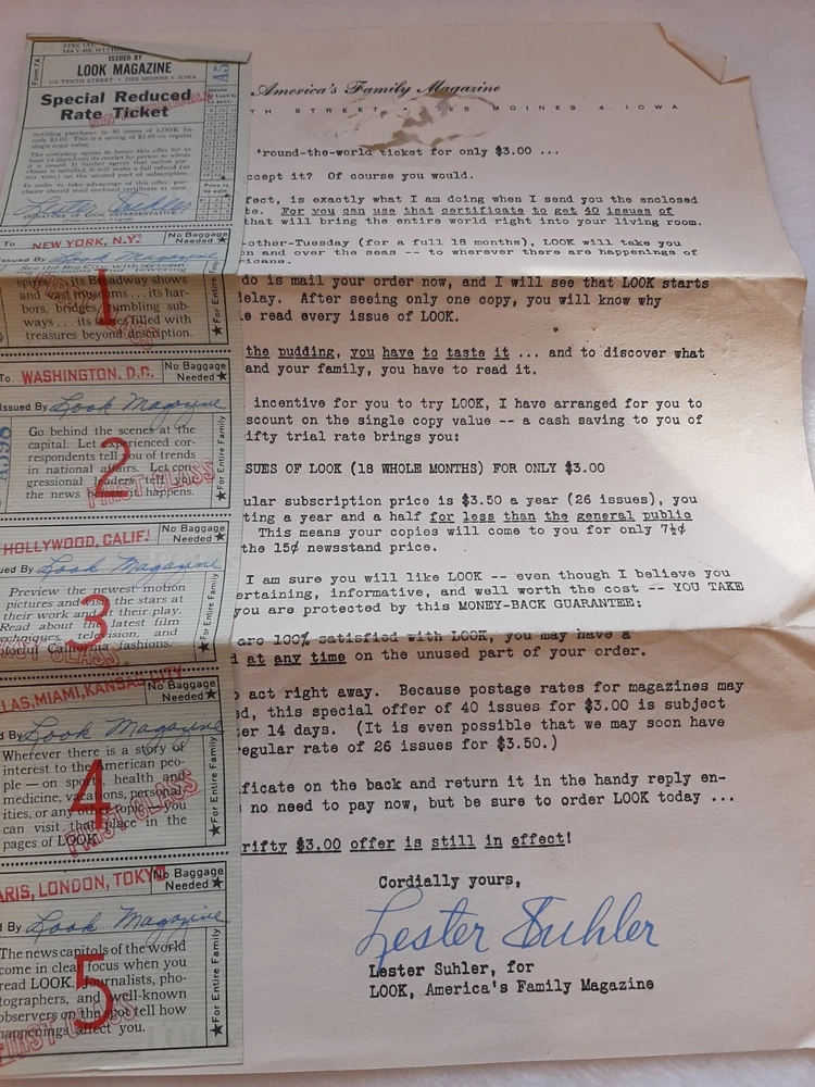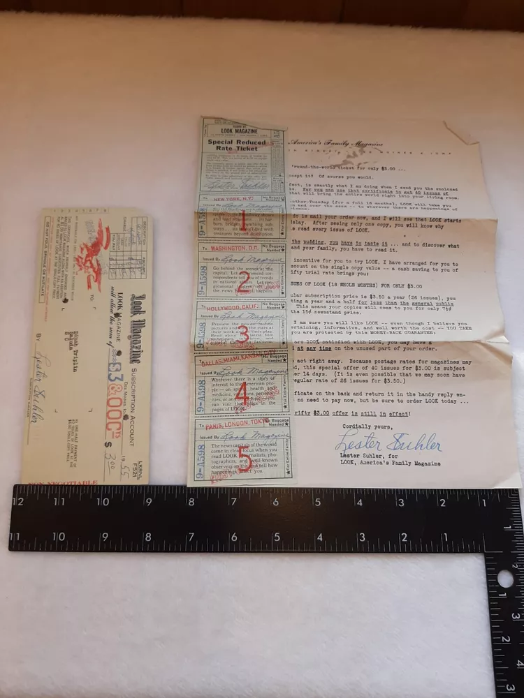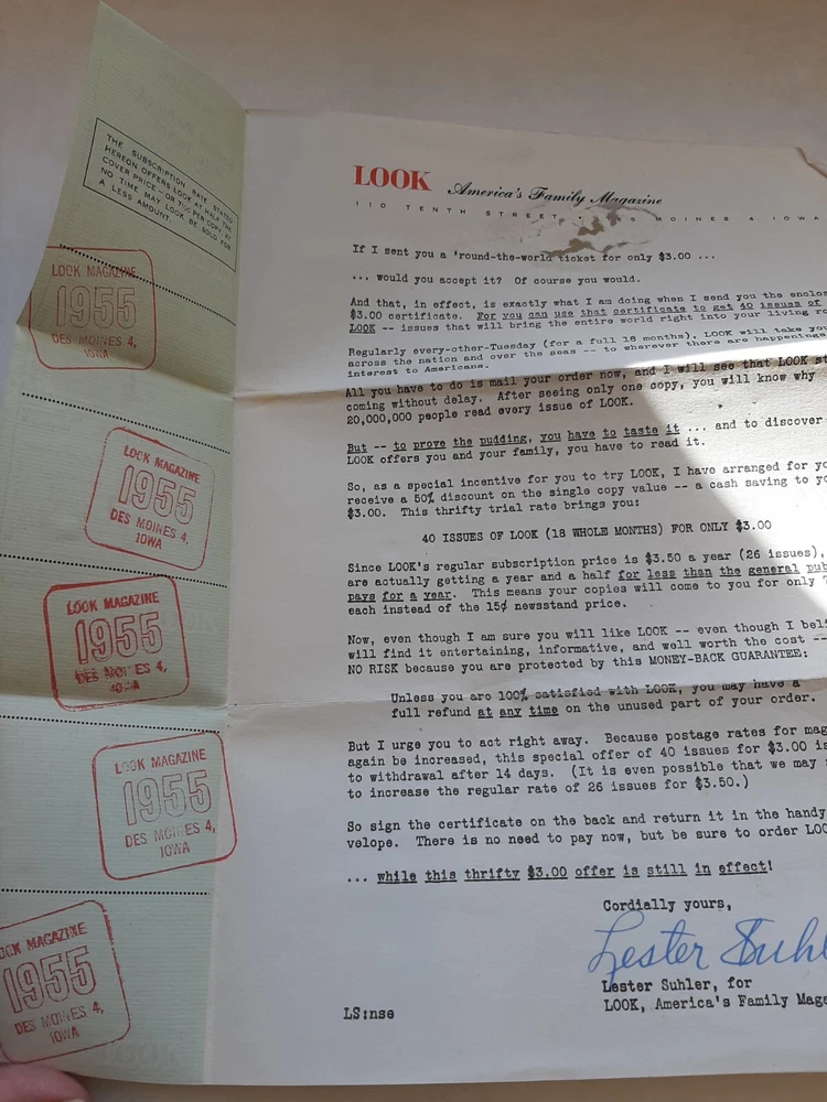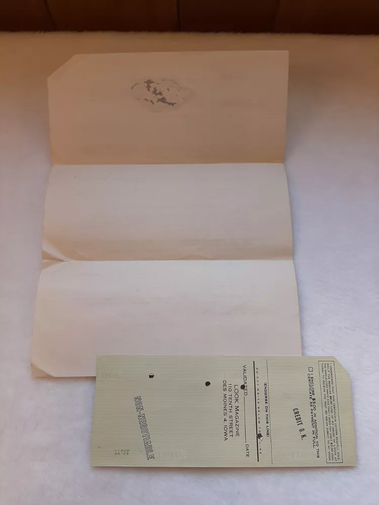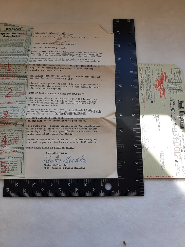 1955 Look Magazine Novelty Bank Check Discount Coupon Subscription Letter Vintage In good pre-owned condition may show signs of wear from use/handling/storage/display. Please view all pics for condition/details/flaws/issues. SOLD AS IS There is damage & folds to the paper please see all photos for details. There is/maybe marks/spots/dirt/debris please see photos 1-14, there is/maybe paint loss/sticker loss please see photos 1-14, there is lite discoloration please see photos 1-14, there are surface scratches to item please see photos 1-14, please see all photos for condition/issues/details.