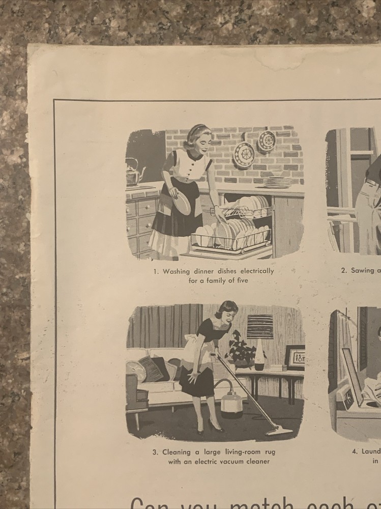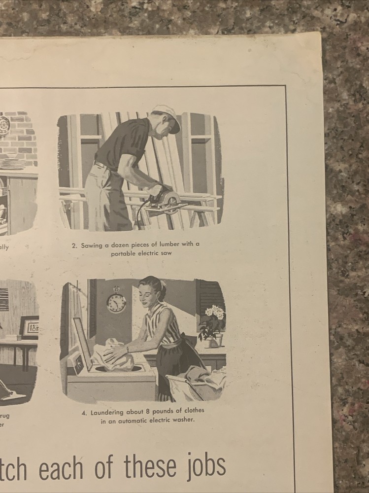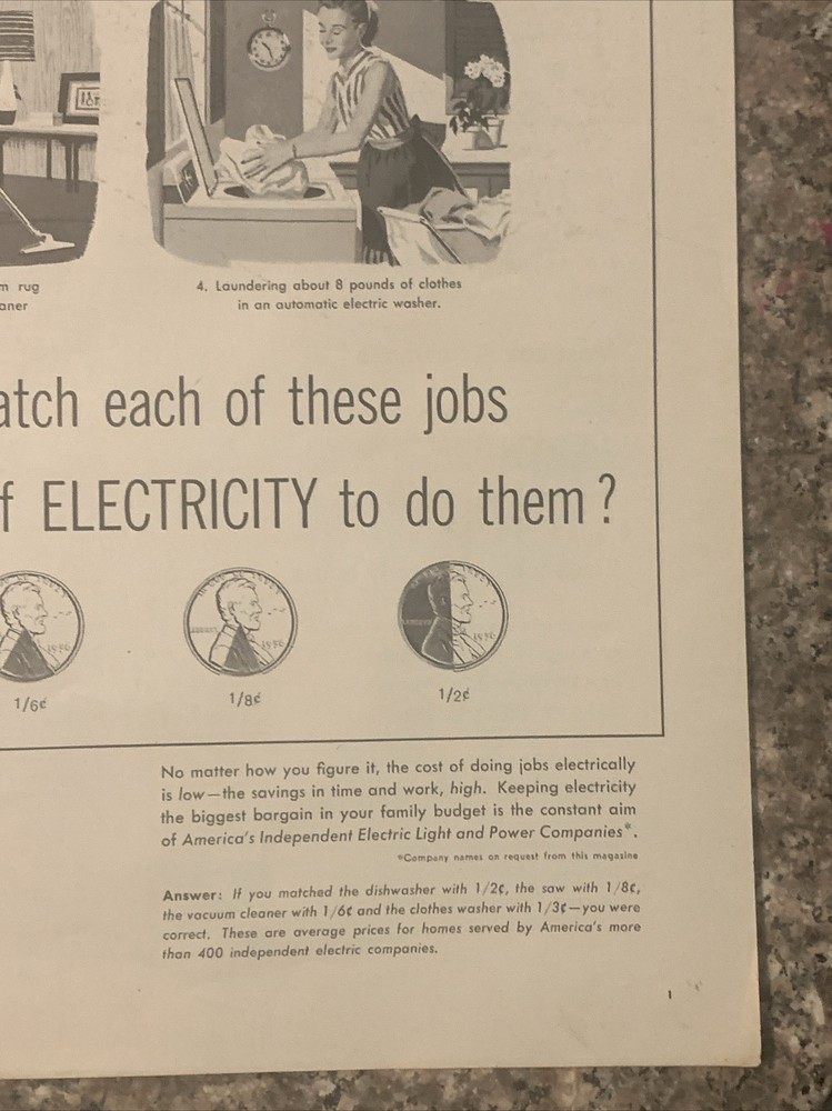 This vintage 1956 magazine print ad features America's Independent Electric Light & Power Companies and the benefits of household electricity. The black and white design showcases the company's history and culture. Original approximate 10”x14” vintage magazine print ad.