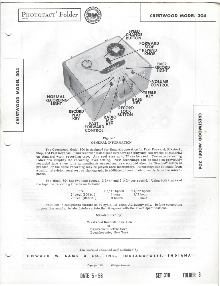 1956 CRESTWOOD 304 REEL To REEL Tape Recorder Photofact Instruction MANUAL - 12 pages, with instructions, photos, parts list, schematics, etc. Condition: - Good used condition, with minor storage wear. - Please see all photos, thanks.