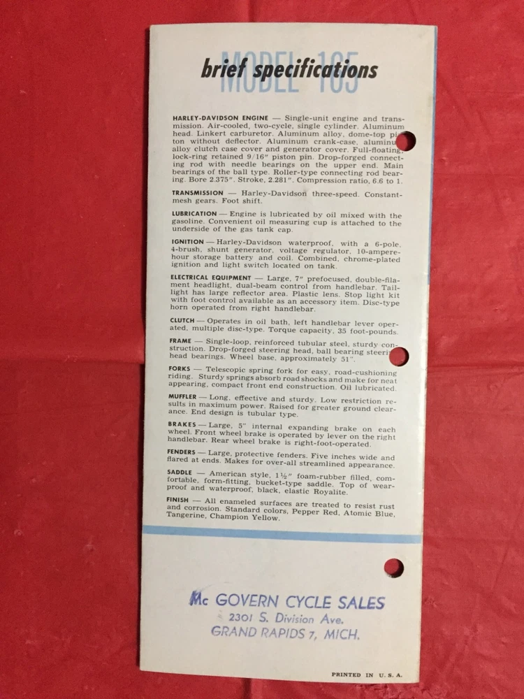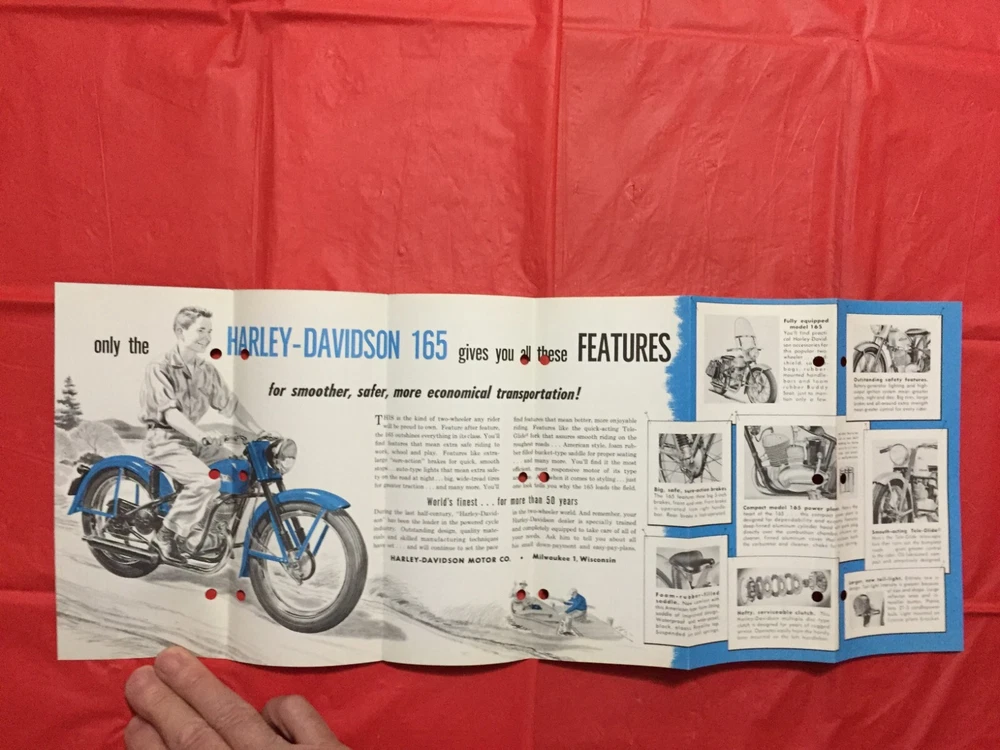 ITEM:::: This Listing is for an original 1956 HARLEY-DAVIDSON "MODEL '165' & FEATURES" Motorcycle Dealer Sales Brochure/Folder..... ... DIMENSIONS:::: About 8 1/2 by 3 3/4 inches and there are 12 pages with covers ...... CONDITION:::: The general overall condition is VG..... Punch holes,,,,, Stamp.. ... .. (Please refer to pictures & e-mail for details). ......... ABREVIATIONS:::: E=Excellent with no issues..... VG = Very Good with very lite issues..... G/VG = Good to Very Good with lite issues..... G + = Good+ with lite to moderate issues..... G = Good with moderate issues..... G - = Good- with moderate+ issues..... F/G = Fair to Good with quite a few issues..... F = Fair with many issues..... P = Poor with lots of issues..... Please let the pictures help you decide condition because they are an integral part of the description! Please e-mail with questions...... I will combine shipping & you will only pay $6.98 for shipping no matter how many items you accumulate! You can take up to 30 days to accumulate Items for combined shipping. Please drop me a note after your 1st win letting me know that you intend to wait to pay so that you can take advantage of combined shipping...... I will ship your Package to the address that you have registered on EBAY---Ergo, I will ship to the address that is on the shipping label when I print it from EBAY---Please do not ask me to ship to any other address---I will not do it! My goal is 100% satisfaction! I will refund 100% of your costs if you are not satisfied! Thanks for visiting!