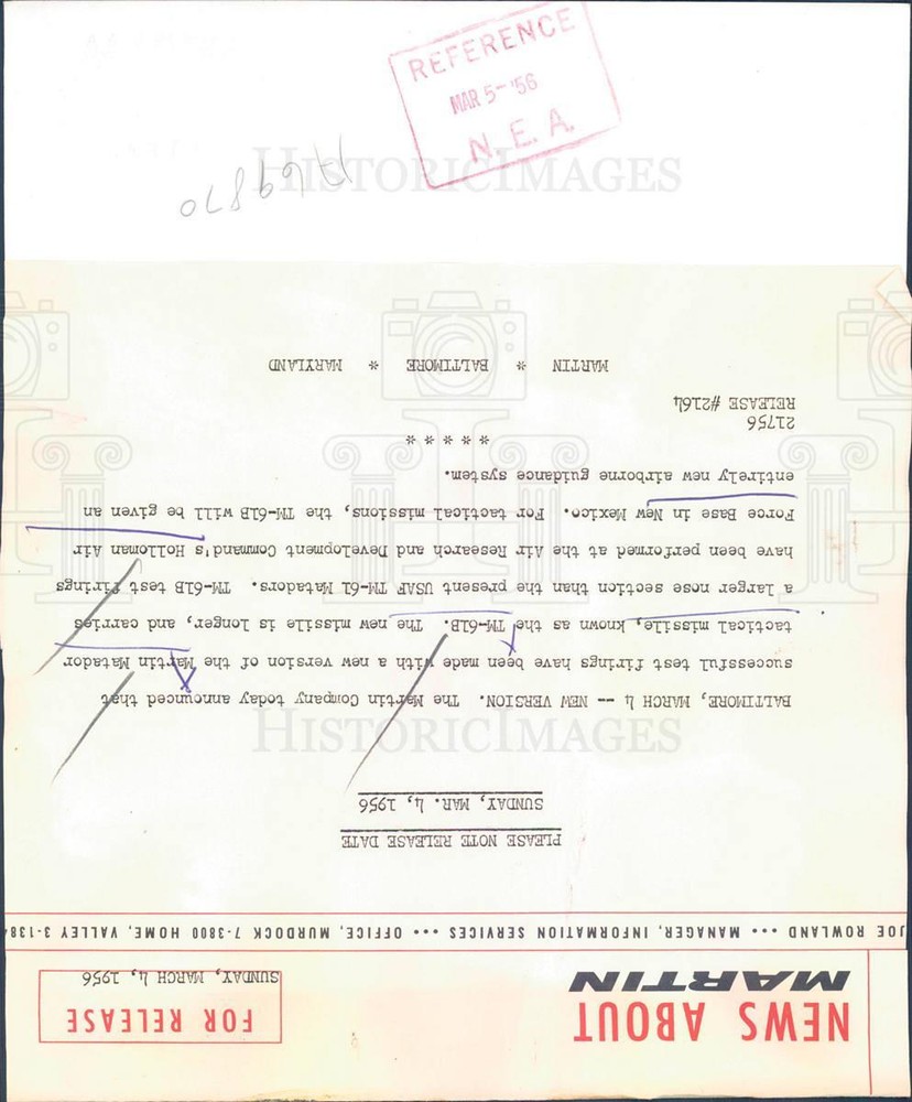 ebay template Note: Please study the images carefully to determine the condition of this vintage photograph, as it may not be in perfect condition. It may contain wrinkles, cracks, and possibly even tears due to its age and how it was handled before it got to us. A scanner may interpret colors and contrast differently than human eyes will, so it is possible that the actual photograph may be slightly darker or lighter in person. This vintage photograph is offered for sale as a collectible item and conveys no transfer of copyright. 1956 Press Photo Holloman AFB NM Martin Matador Tactical Missile TM-61B This is an original vintage 8 x 10 press photo of Holloman AFB NM Martin Matador Tactical Missile TM-61B being tested at the Air Research and Development Command. Photographer Unknown. Dated 3/4/1956. The following stamps are on the back of the photo: NEA;Martin PHOTO FRONT PHOTO BACK Historic Images Part Number: RF-ner9965 Sell Smarter with Kyozou. Inventory and Ecommerce Management