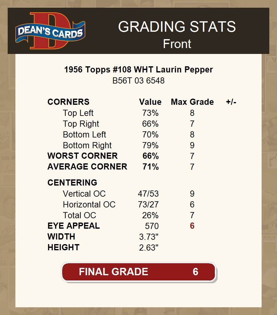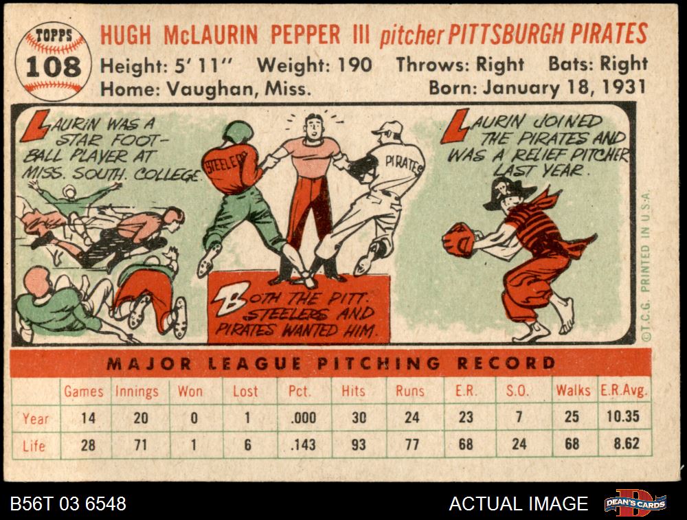 1956 Topps #108 Laurin Pepper White Back Pirates RARE VARIATION 6 - EX/MT If the scan in the listing says ACTUAL IMAGE, you will receive the card pictured. For cards issued after 1983, we will often use representative images and you will not receive the exact card pictured. Shipping Policy You only pay shipping on the first item. If you order multiple items on the same order, you will only be charged once for shipping. We do not combine shipping on multiple orders. To avoid multiple shipping charges we recommend using eBay's "Add to Cart" feature to check out multiple items in one transaction, or please request and allow for us to send an invoice to reflect the combined shipping charges. Canadian customers - We send all of our Canadian/International packages with tracking and cannot make any exceptions to this policy. Negotiating Prices All prices are final and we do not negotiate. This policy is to ensure that everyone knows that they are getting our best possible price. So please do not ask us to negotiate on price. Return Policy Dean's Cards has a 100% Money Back Satisfaction Guarantee on all purchases, as long as the product is returned within 30 days of receiving the product. Card Grading Each card is first reviewed by a member of our team, in order to detect any flaws that may not be visible on a scan, such as wrinkles, creases, print spots, or light stains. The vast majority of our vintage cards are professionally graded by the Dean's Cards Grading Software and include a 100% satisfaction guarantee. Our grading is on par with PSA standards when it comes to corners, centering and flaws - and tends to grade a bit tougher than PSA, on cards with a tilted image or rough edges. This grading software was developed to provide far better grading and consistency than can be achieved using the human eye. Determining the card's grade The sharpness of the corners and the degree to which a card was cut off-center determines the maximum possible grade that the card can receive. The card's grade is further reduced by any flaws or blemishes that it may have. Each card is evaluated on the following characteristics and assigned a score. Corners - Each corner of a card is individually analyzed, and then assigned a score on how square, sharp, and flawless it appears. Centering - The borders are measured, at multiple points along the edge, to determine the horizontal and vertical centering and tilt. Defects - The card is examined for imperfections, such as: size, print flaws, dings, stains, creases, or other wear which could lower its grade. Bonus for Perfect Centering - A vintage card, with near perfect centering, is given a one-half grade bonus. So when you buy one of our cards with a half-grade (e.g. 3.5 or 6.5) it will appear perfectly centered, both vertically and horizontally. Grading Criteria Worst Corner - A card can grade only as high as the worst corner will allow. Average Corner Tilt - The difference in width of a card border near the top, compared to the bottom. OCT - The sum of how far a card is Off-Center, plus its Tilt. Minimum Centering Requirements Eye Appeal - The combination of a card's centering, corners and tilt. Well-Centered - Cards that appear perfectly centered receive a bonus of one-half grade. Flaws, defects and other imperfections - can lower a card's grade. Card Backs - the above criteria is also considered, for the back of the cards, but does not inflict as severe of a penalty to its grade. Packaging Once scanned, the cards are placed in "soft" sleeves, which have an open top for easy removal. The Dean's Cards label is placed on the top back of the card sleeve. Every card you buy features a QR Code that you can scan to see your ACTUAL CARD and its grading statistics. Please note that when images are enlarged there may be instances of vertical lines running through the scans. This was caused by a "dust speck" on the scanner and can be verified by the vertical lines running into the black margins on the top and bottom of the image. About Dean and Dean's Cards Dean's Cards Makes Card Collecting - Fast, Easy And Fun. Dean's Cards was founded in 2002 and has become the leading online seller of vintage sports cards and non-sports cards. Our inventory has grown to more than a million vintage cards and we have a staff of 15-20 employees and a 8500 sq. ft. office space in Cincinnati, Ohio.