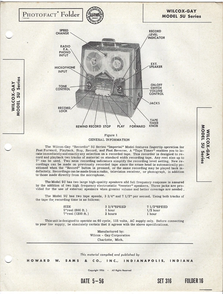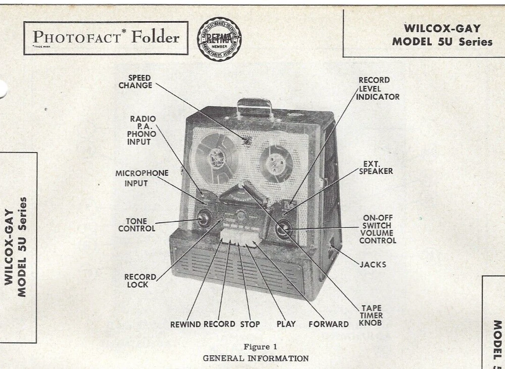 1956 WILCOX-GAY 5U Recordio REEL To REEL Tape Recorder Photofact MANUAL Vintage - 14 pages, with instructions, photos, parts list, schematics, etc. Condition: - Good used condition, with minor storage wear. - Please see all photos, thanks.
