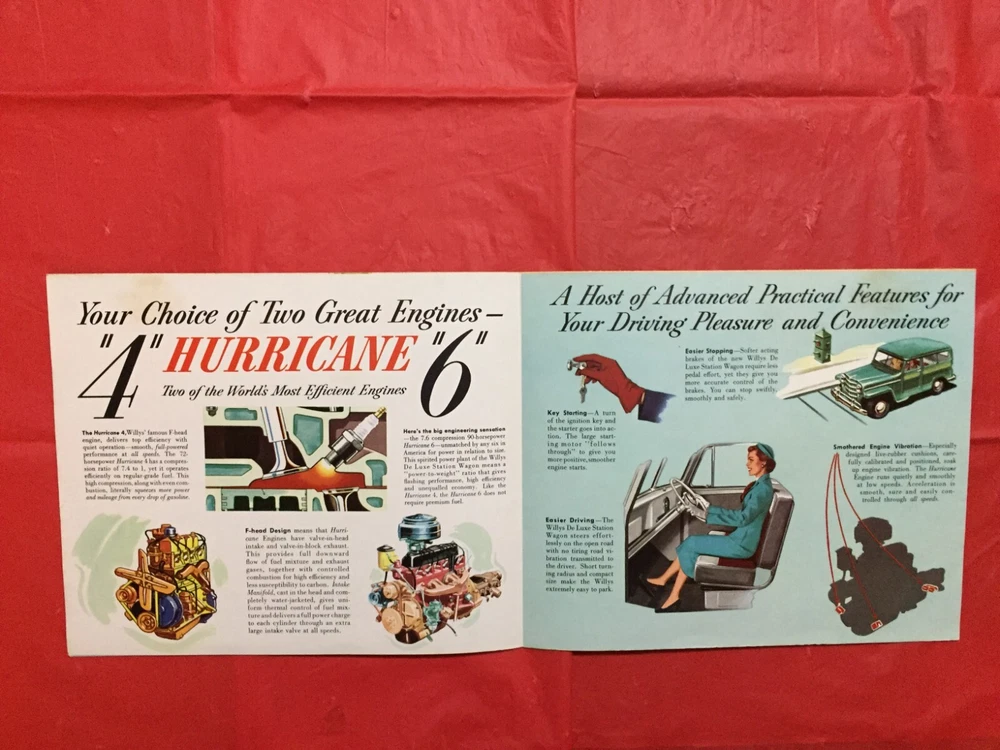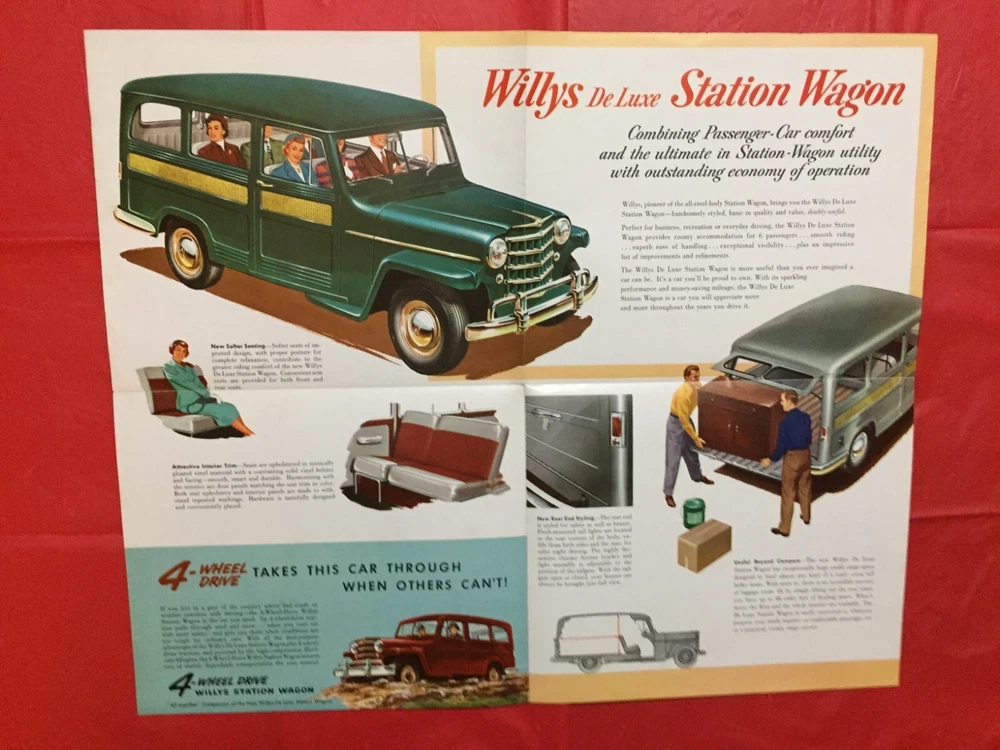 ITEM:::: This Listing is for an original 1956 WILLYS "DE LUXE STATION WAGON" Truck Car Dealer Sales Brochure/Foldout.. ..... DIMENSIONS:::: About 9 by 7 1/2 inches and there are 8 pages with covers ....... CONDITION:::: The Condition is generally mostly G/VG..... Stamp.... ... (Please refer to pictures & e-mail for details). ......... ABREVIATIONS:::: E=Excellent with no issues..... VG = Very Good with very lite issues..... G/VG = Good to Very Good with lite issues..... G + = Good+ with lite to moderate issues..... G = Good with moderate issues..... G - = Good- with moderate+ issues..... F/G = Fair to Good with quite a few issues..... F = Fair with many issues..... P = Poor with lots of issues..... Please let the pictures help you decide condition because they are an integral part of the description! Please e-mail with questions...... I will combine shipping & you will only pay $6.98 for shipping no matter how many items you accumulate! You can take up to 30 days to accumulate Items for combined shipping. Please drop me a note after your 1st win letting me know that you intend to wait to pay so that you can take advantage of combined shipping...... I will ship your Package to the address that you have registered on EBAY---Ergo, I will ship to the address that is on the shipping label when I print it from EBAY---Please do not ask me to ship to any other address---I will not do it! My goal is 100% satisfaction! I will refund 100% of your costs if you are not satisfied! Thanks for visiting!