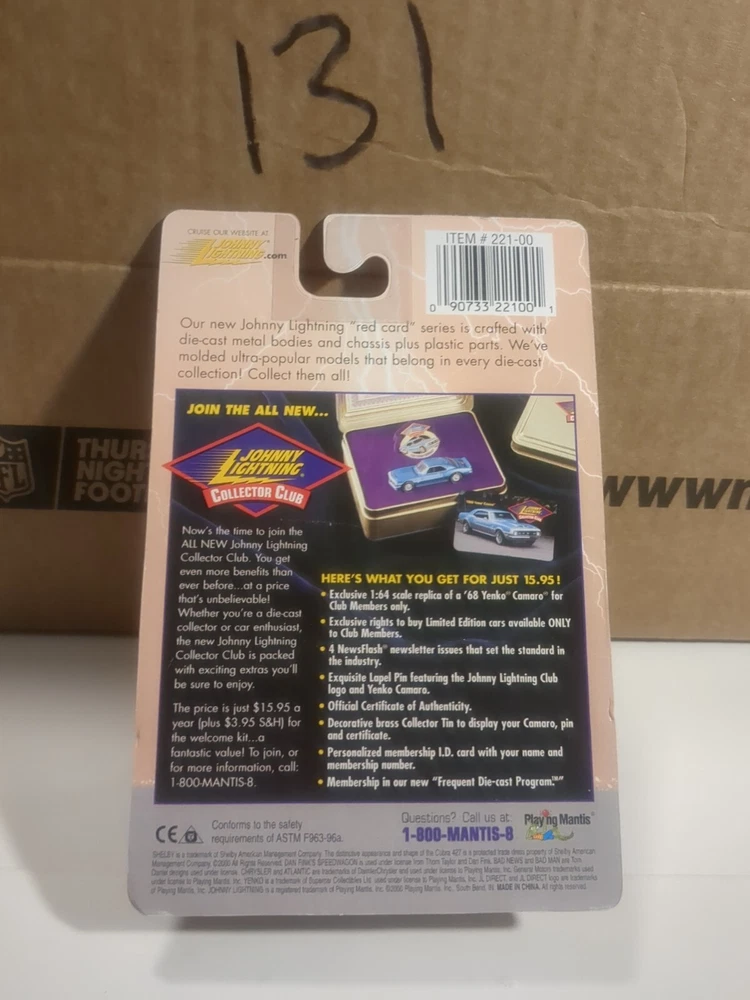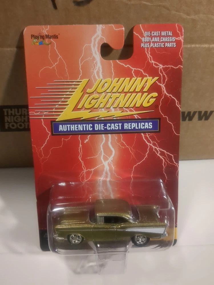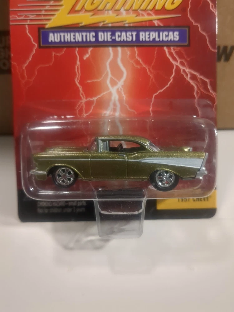 This is a stunning 1957 Chevy die-cast replica from Johnny Lightning's Authentic Die-Cast Replicas series. The car is beautifully crafted with intricate details and a vibrant gold color. It's a special edition model and comes in an unopened box, making it a great addition to any collection. The 1:64 scale car is made of high-quality diecast material and features a Chevy model from 1957. The vehicle make and type are clear, and the year of manufacture is 2000. This model is perfect for collectors or anyone who appreciates beautiful die-cast replicas. See pics for condition issues,, crease on card