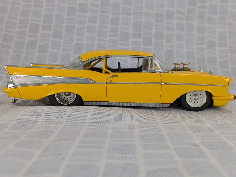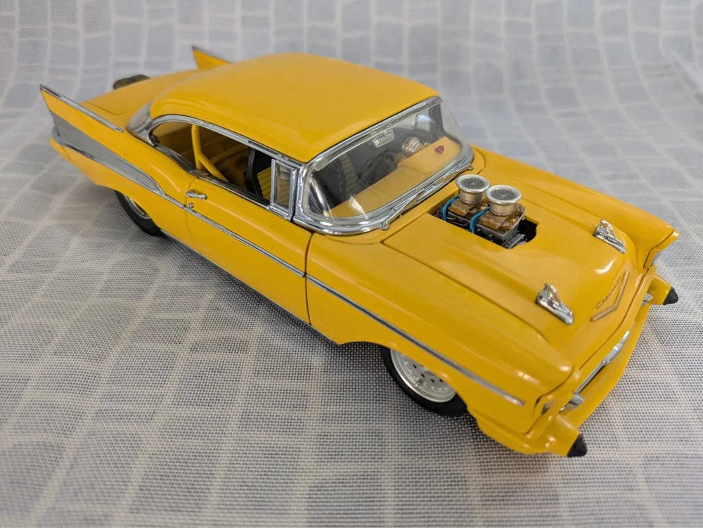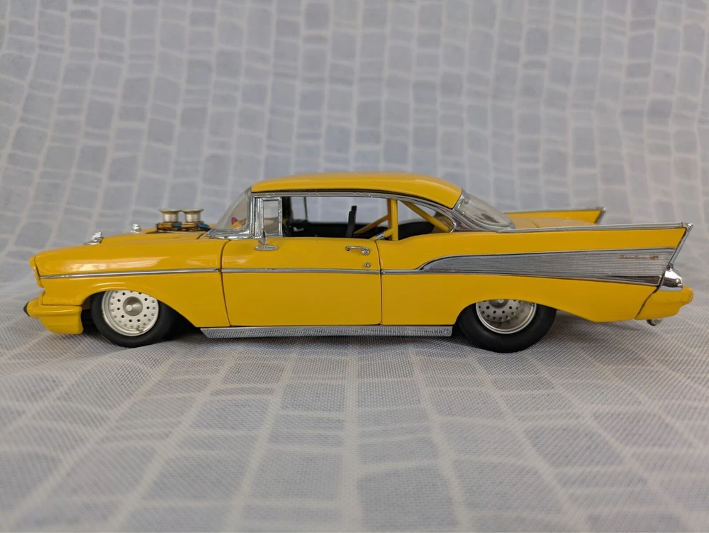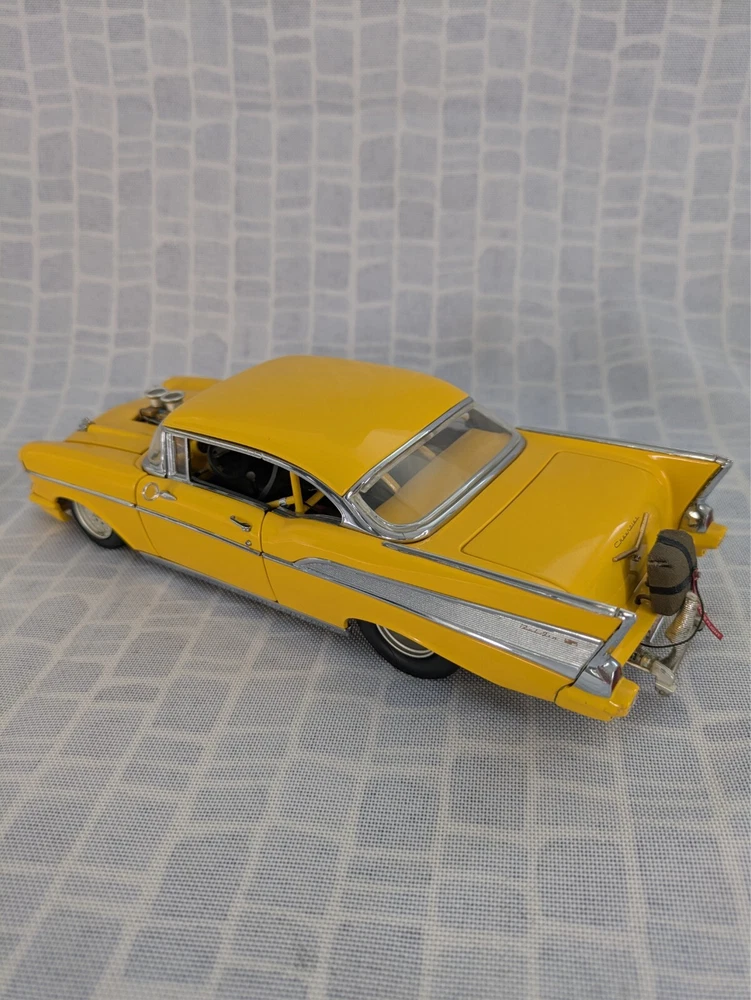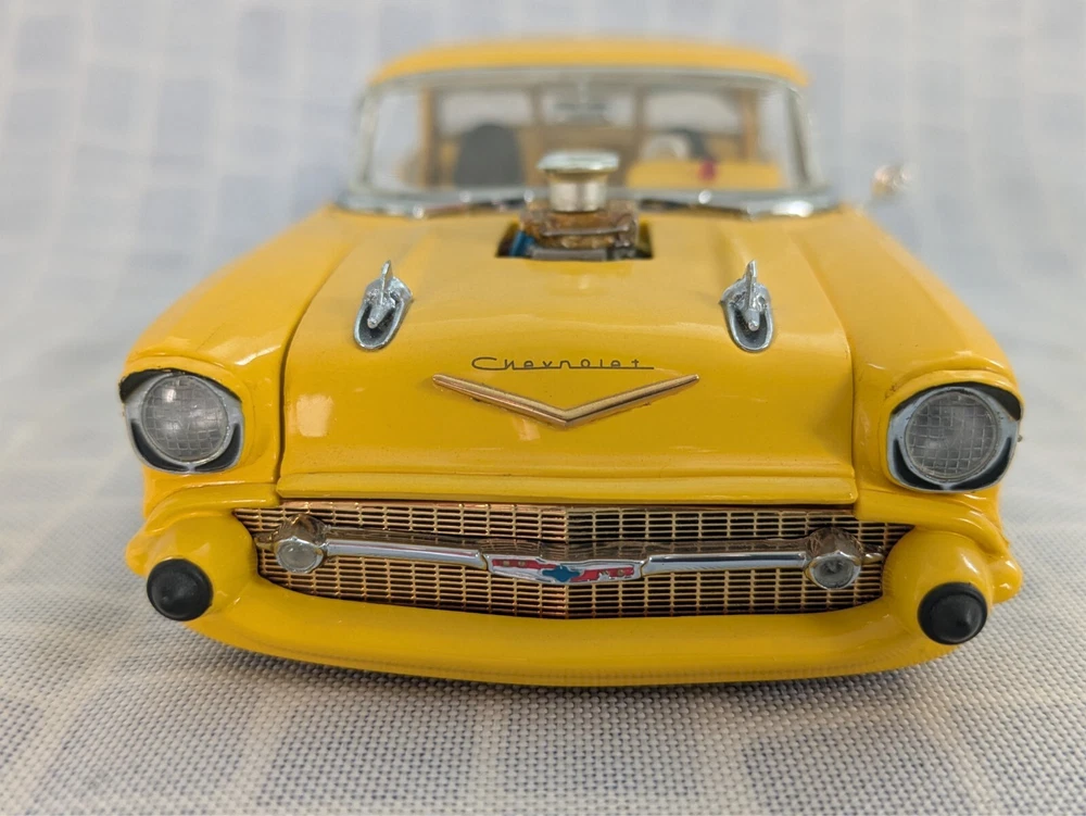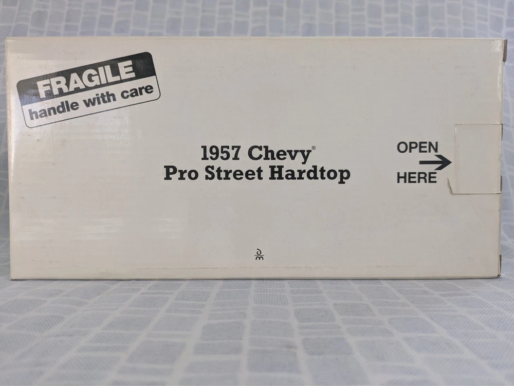 This is from my late father in law's die cast collection. It is a die cast model of a 1957 Chevy Pro Street Hardtop car. It is missing the air cleaner cover that attaches to the hood. It is a 1:24 scale model made with the detail and quality that the Danbury Mint is known for. This model has lived in the box since purchase in a smoke free home. Thanks for looking.