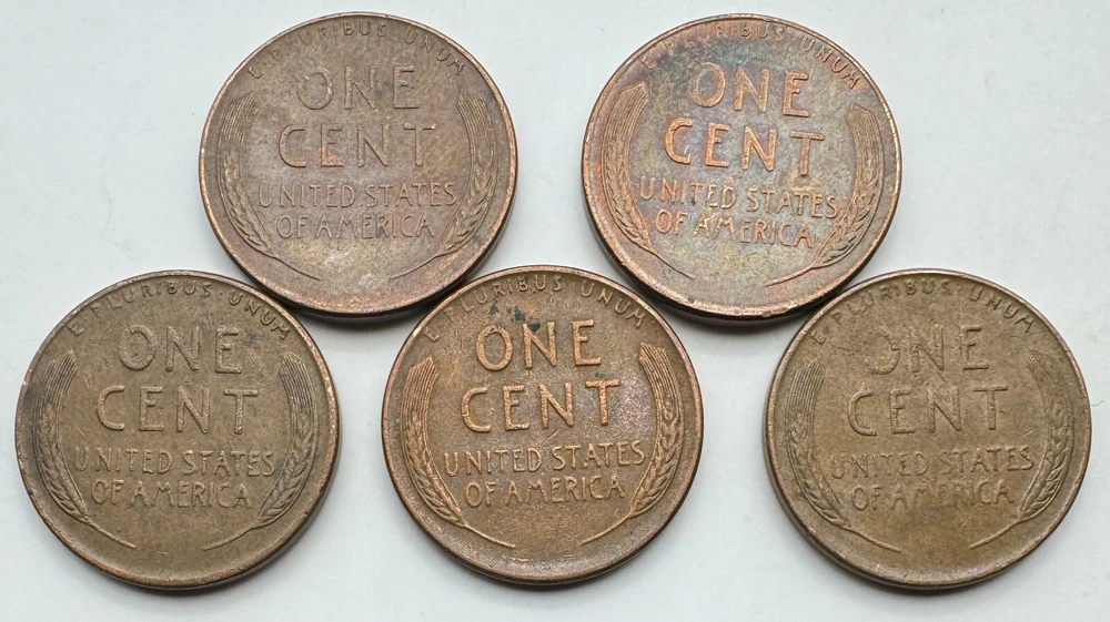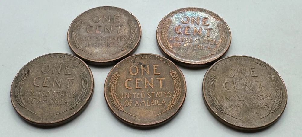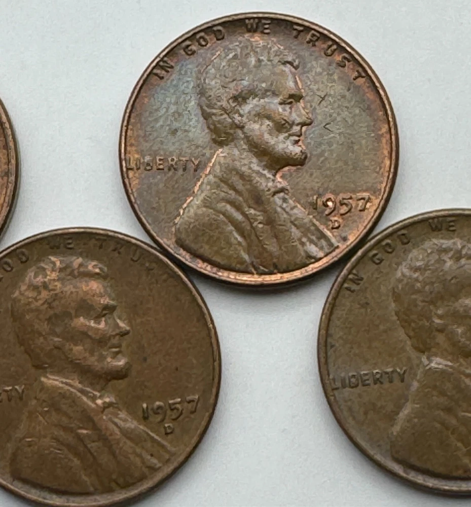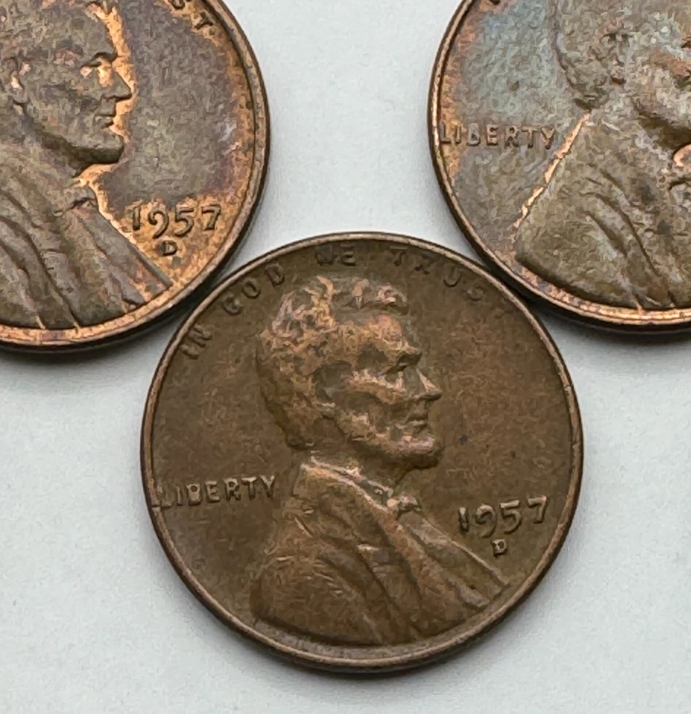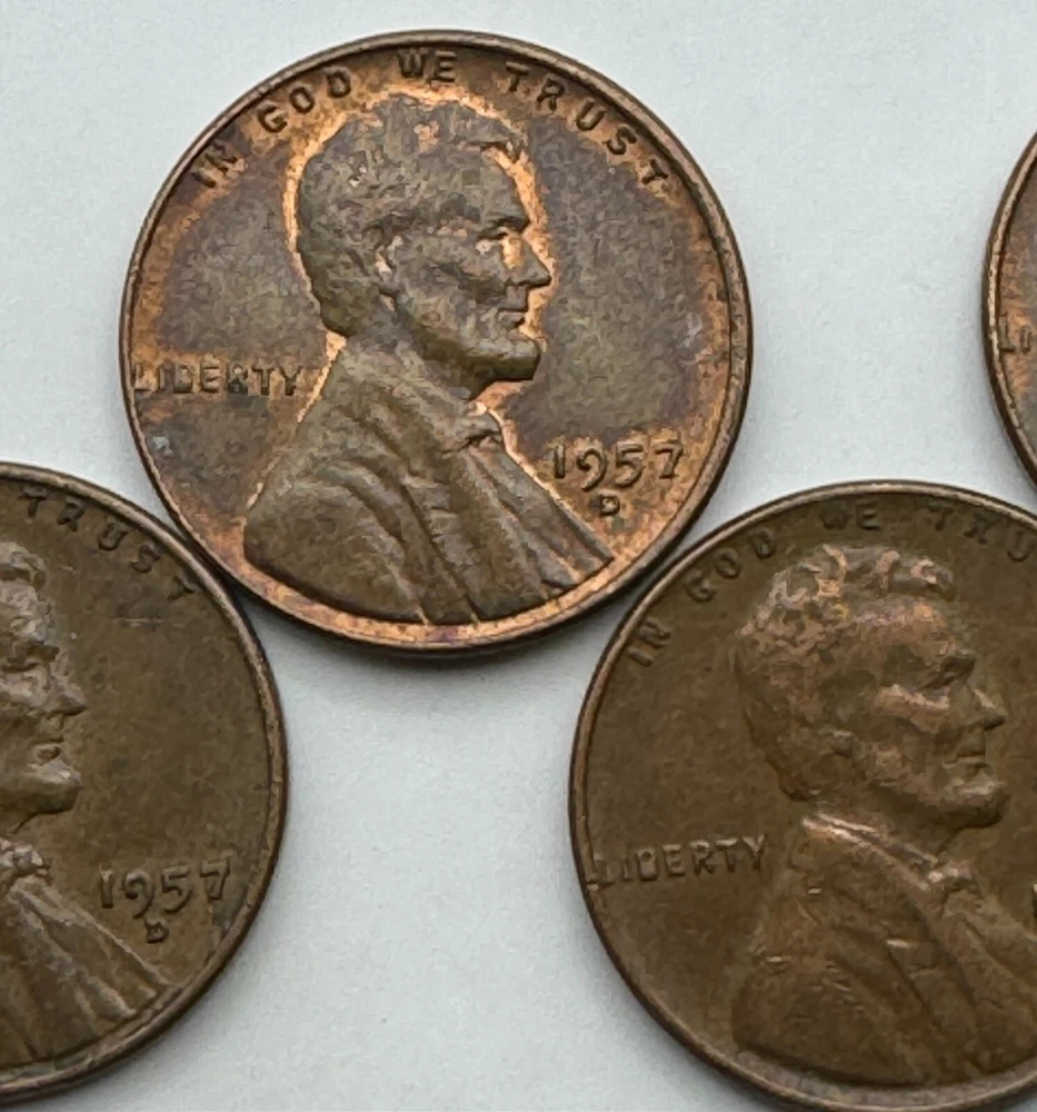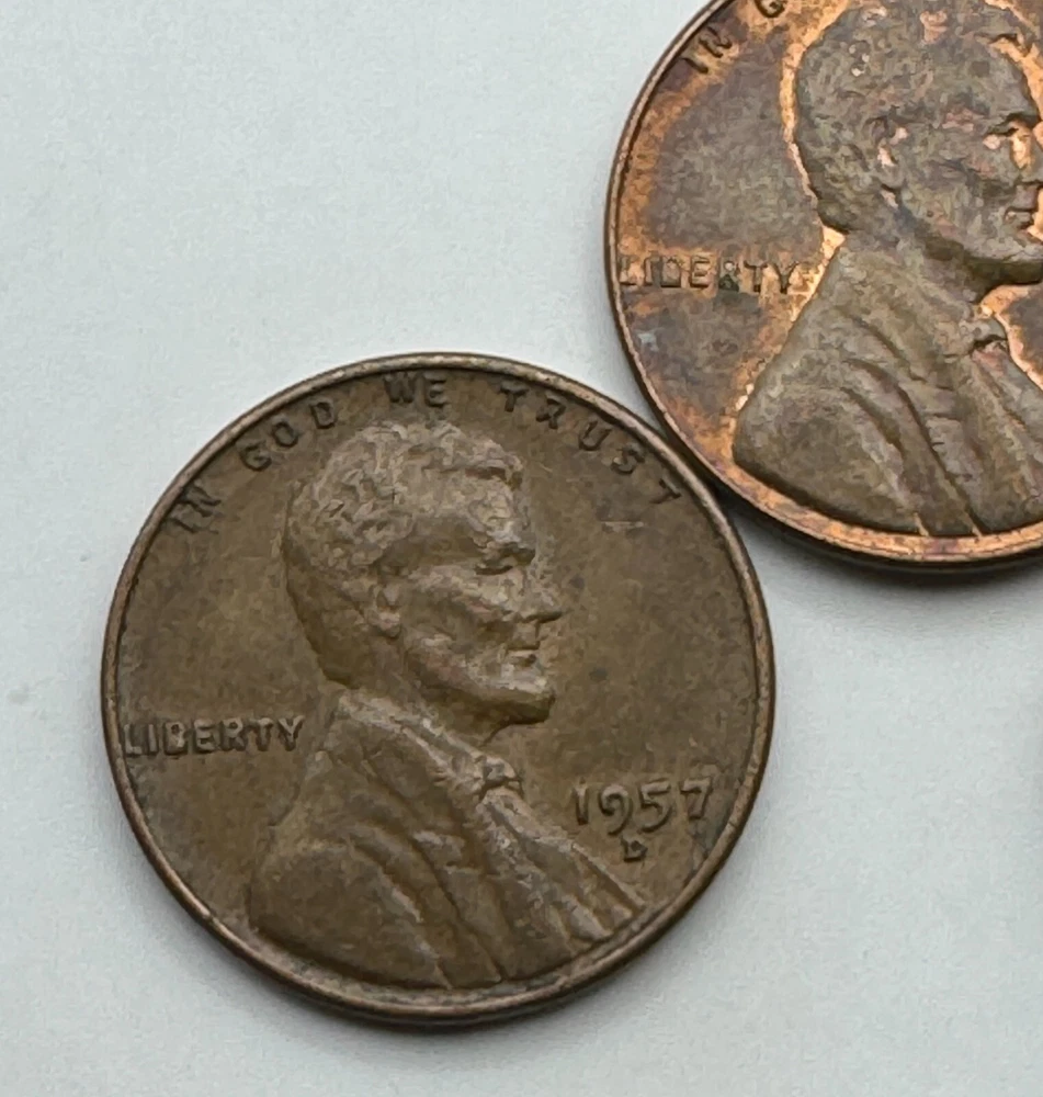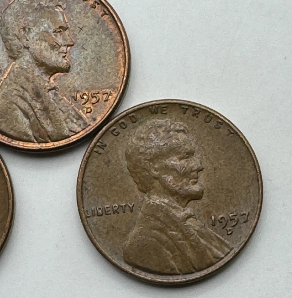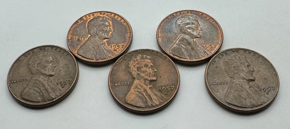 1957 - D Lincoln Wheat Cent x 5 - 1C - Die Chip - Filled B - Penny - Ships Free All 5 coins included. All 5 have a partially filled in B on the obverse of the coin. Photos are of actual item being sold. No stock photos are used. Please message with questions prior to ordering. Shipping will be eBay Standard Envelope.