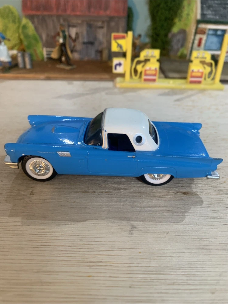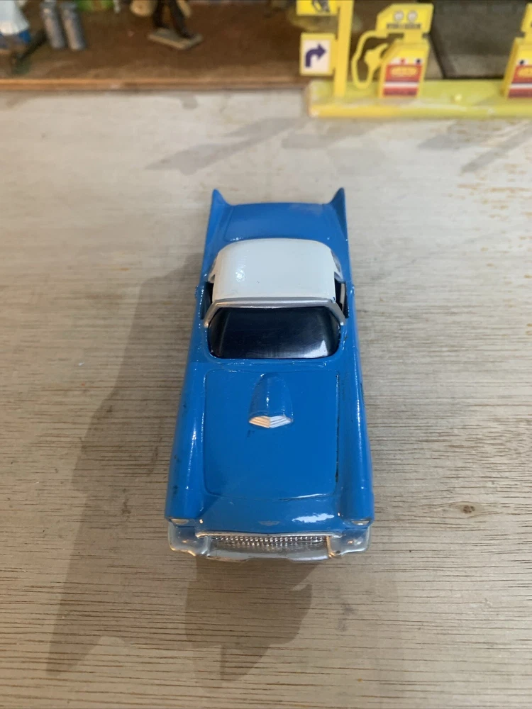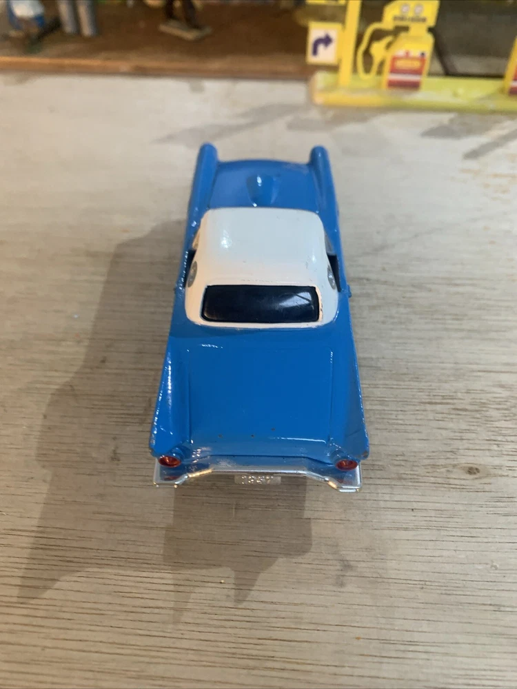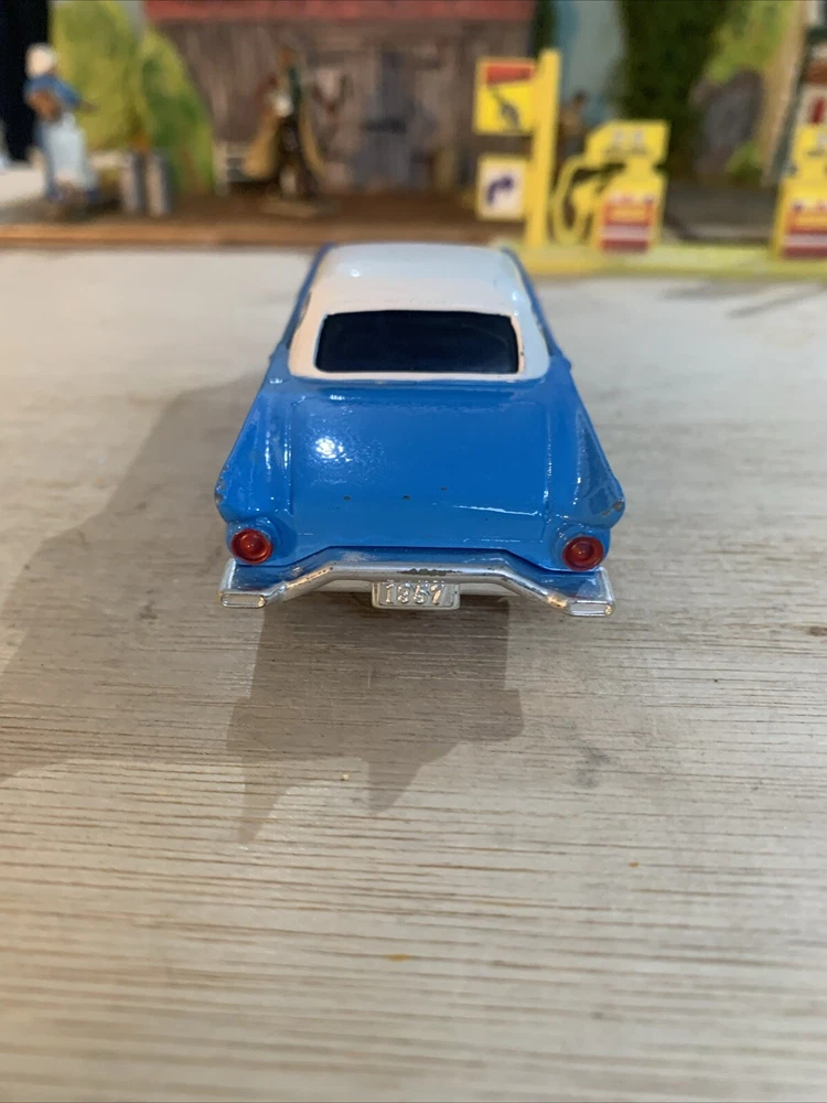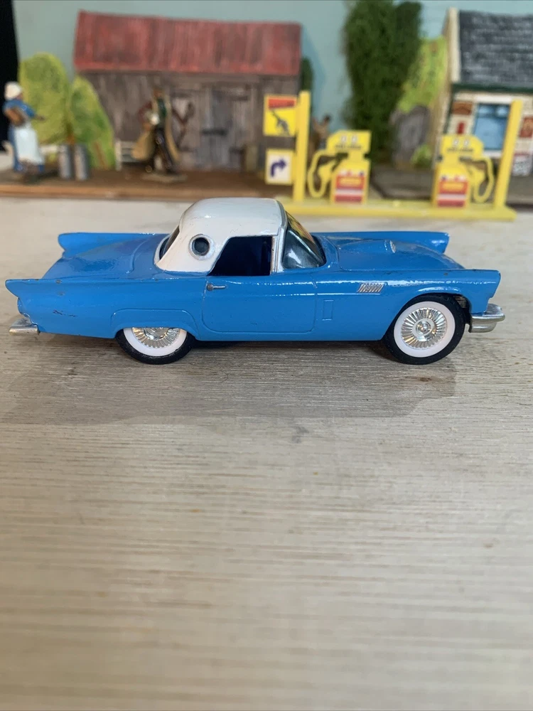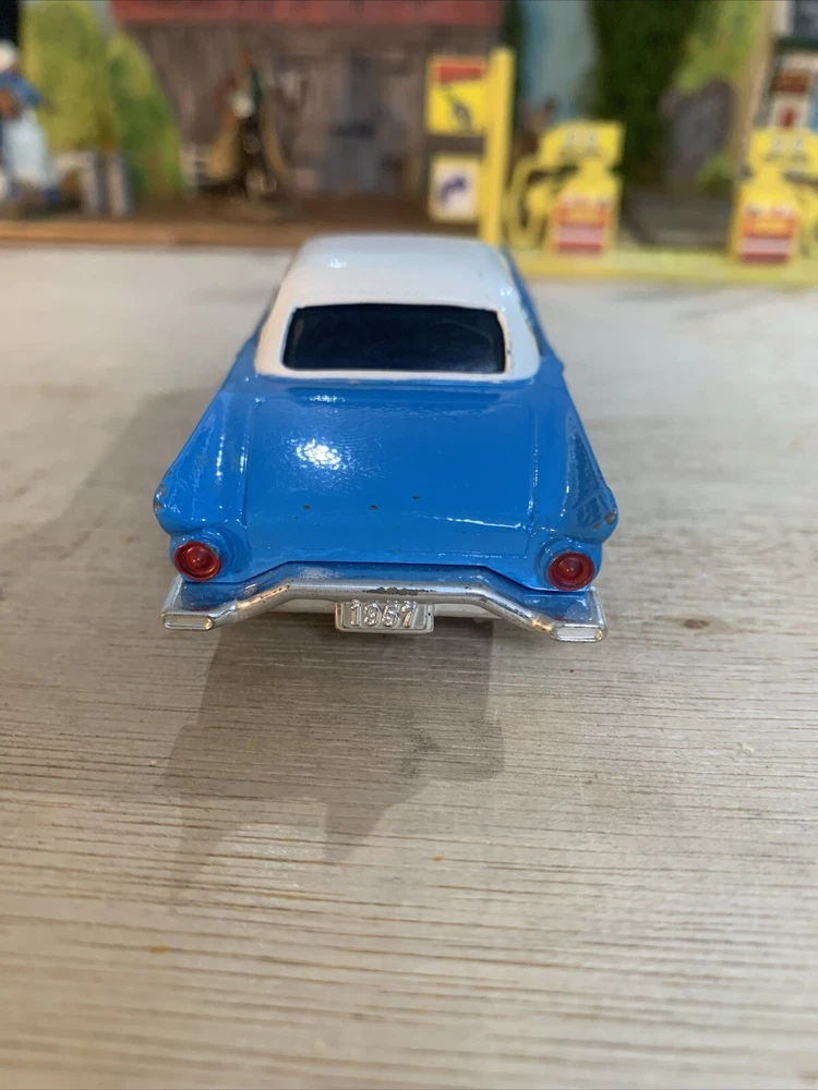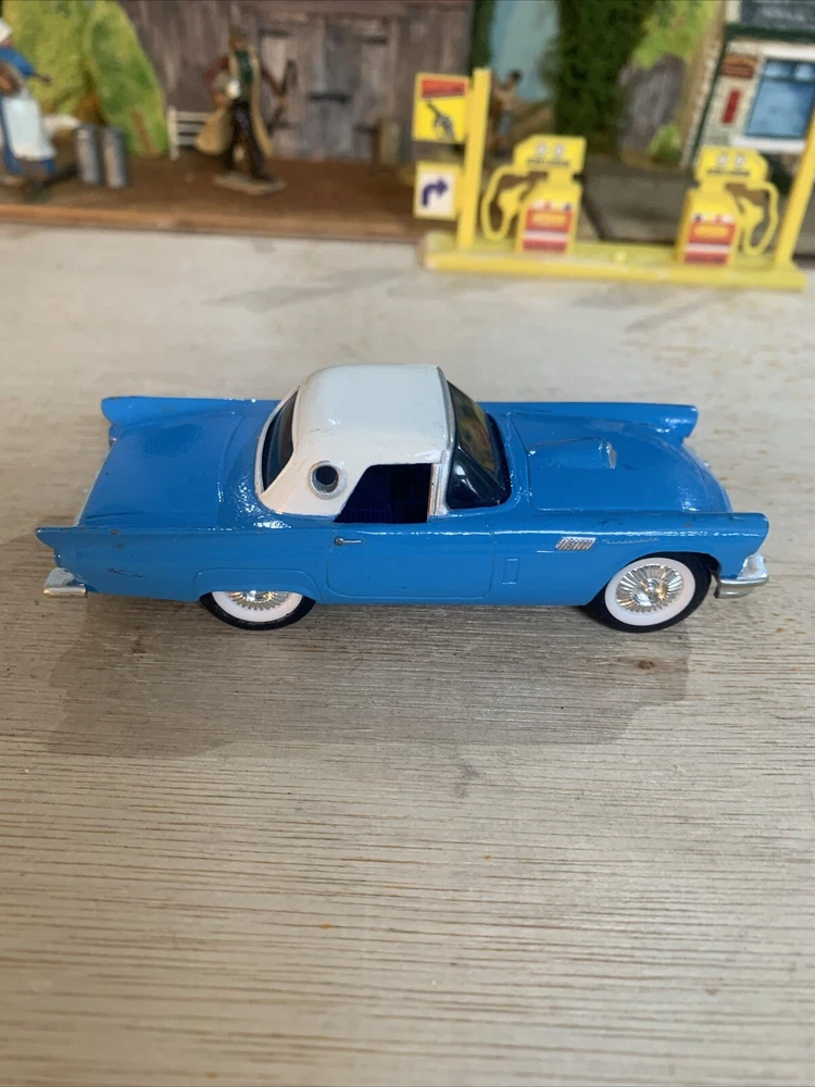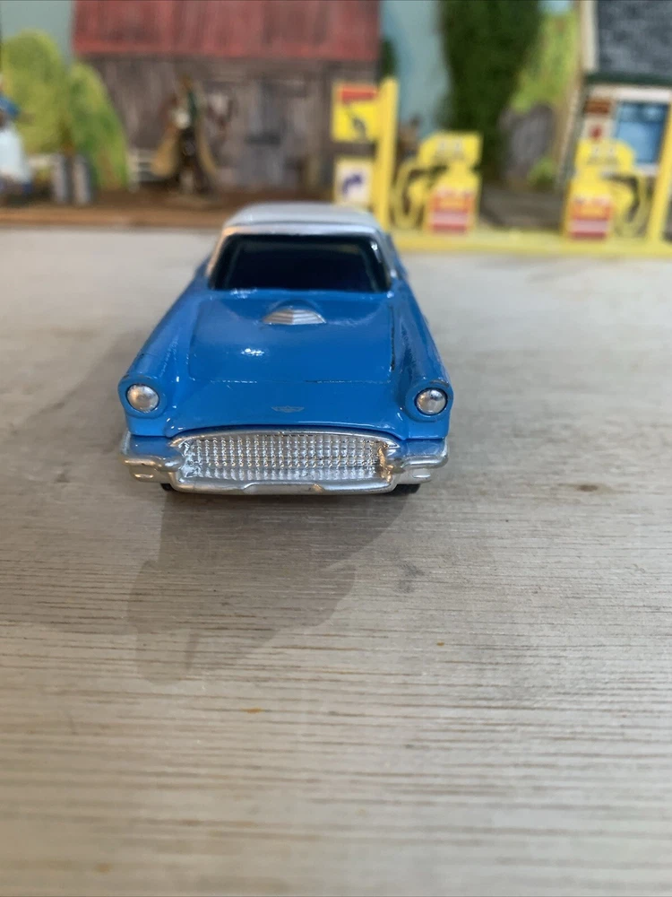 This 1:43 scale diecast model is a 1957 Ford Thunderbird in dark blue, manufactured by ERTL in 1989. Part of the ERTL Vintage Vehicles series, this vintage sports car replica is a detailed rendition of the classic Ford model. Perfect for collectors and enthusiasts of vintage vehicles, this die-cast metal model accurately depicts the 1957 Thunderbird in a striking dark blue colour. Used condition see photos