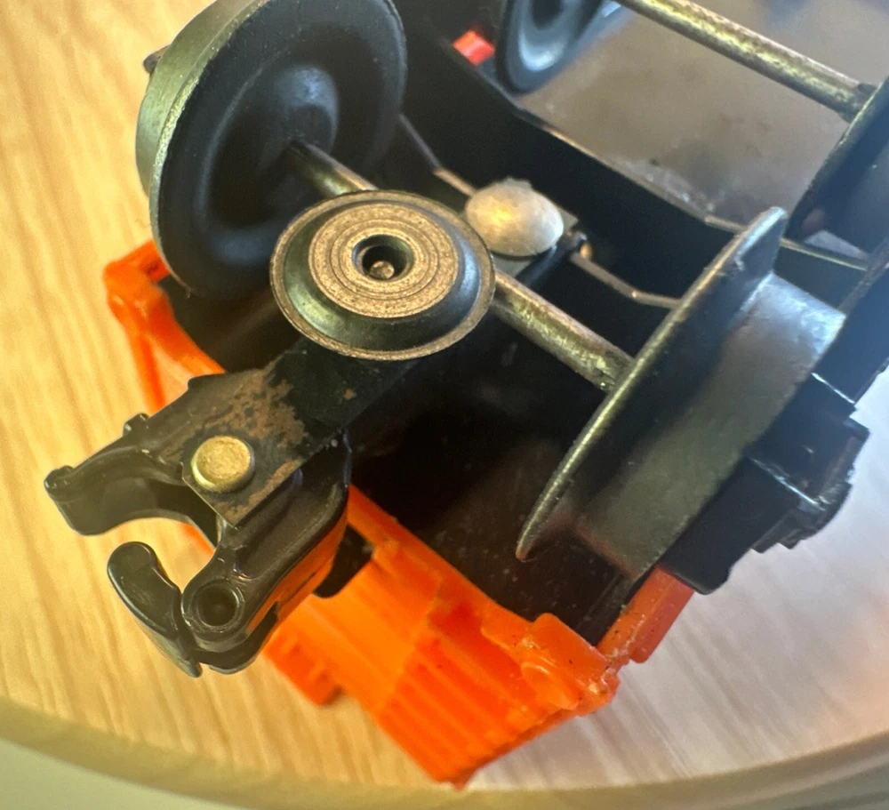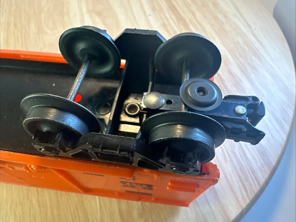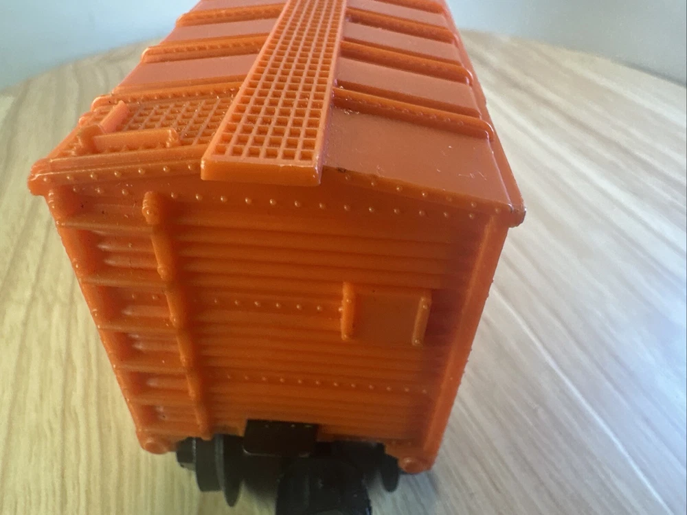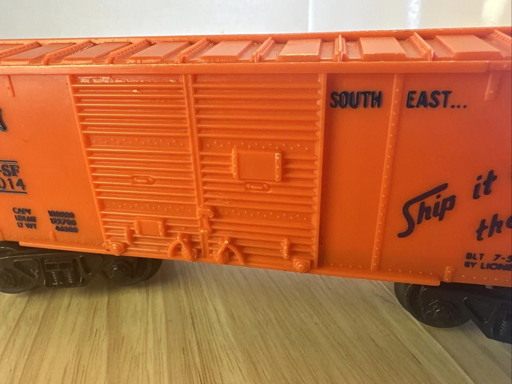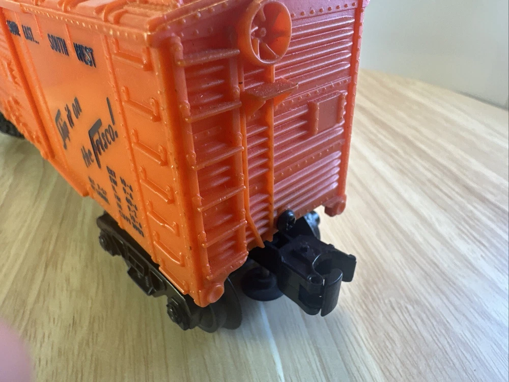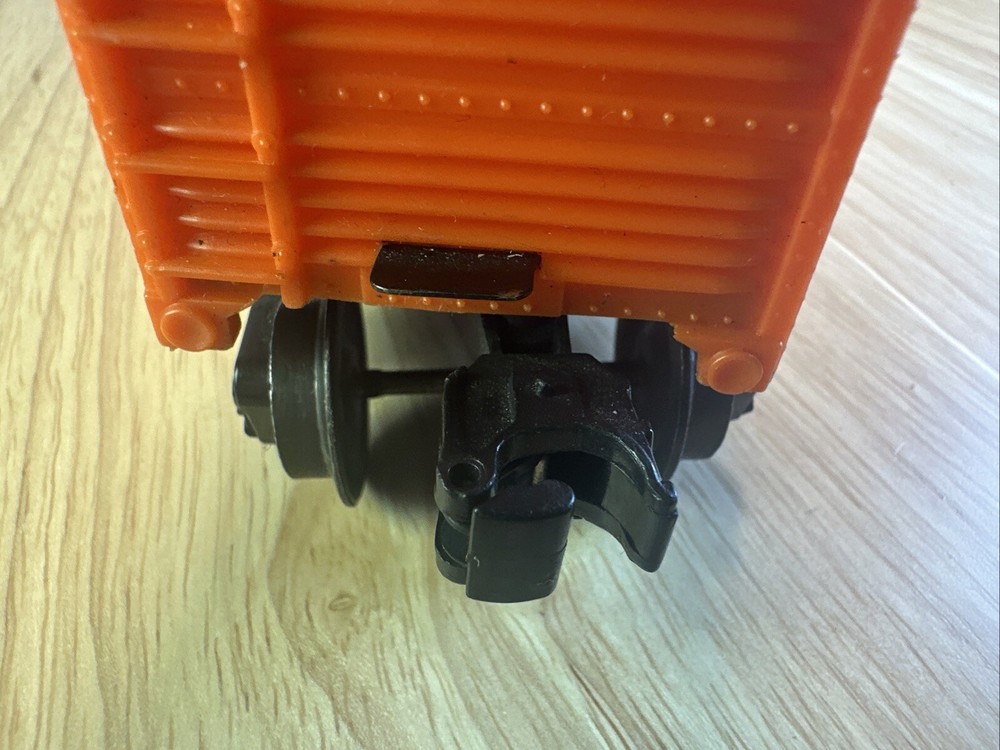 SOLD AS USED LOOKS UNUSED HARD TO FIND POSTWAR LIONEL CLEAN UNDAMAGED ORANGE PLASTIC WITH KNUCKLE COUPLERS NO RUST ON METAL AXLES BLUE READABLE MARKINGS AND GRAPHICS ON EACH SIDE LIONEL O GAUGE FROM 1957 ITEM WILL BE SECURELY WRAPPED AND QUICKLY SHIPPED WITHIN ONE BUSINESS DAY SOLD AS IS CONDITION thanks