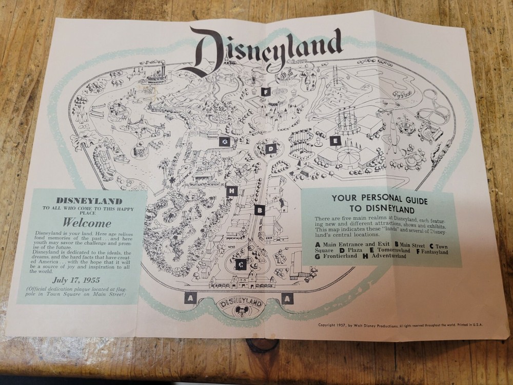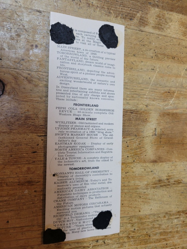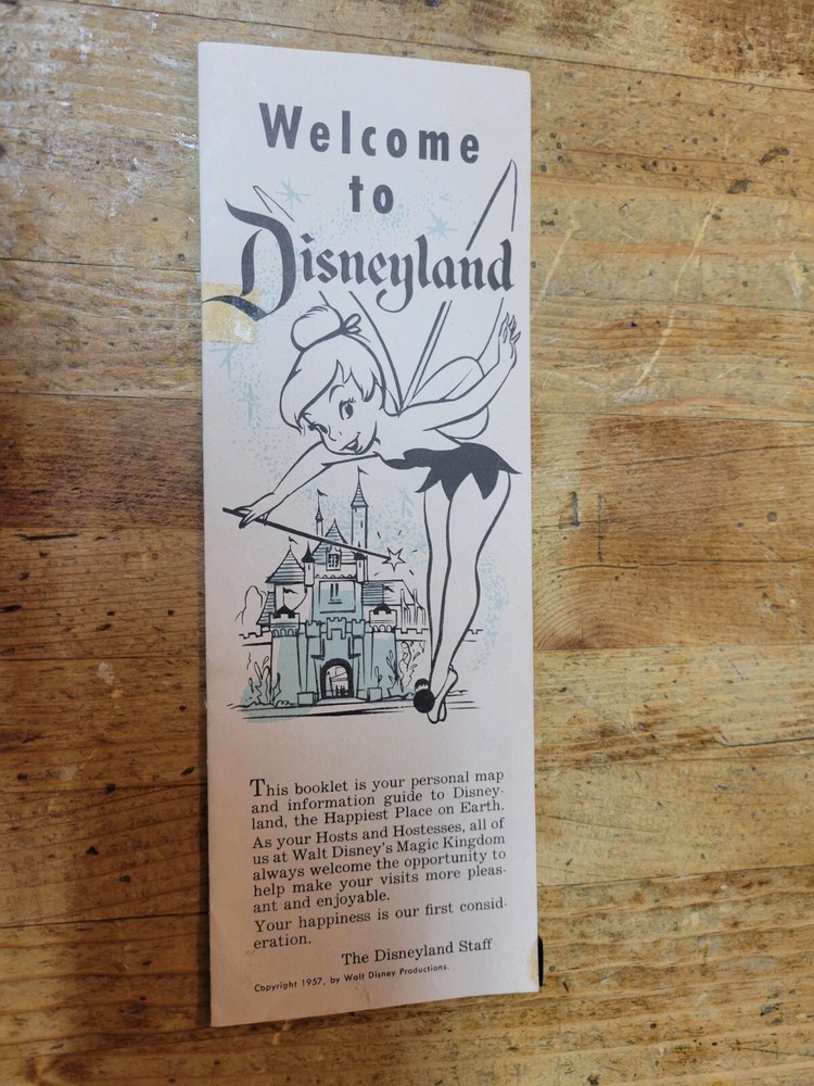 Here is a 1957 Welcome to Disneyland Tinkerbell folder for your very early Disney collection! It is in fair condition with stains, marks, tape residue, edge tears, edgewear and attached residue on the back panel where it looks like it was glued to the black pages of a scrapbook. Please look carefully at the pictures that are provided. Item is sold “as is”. I try to describe my items as accurately as possible. Please email me with any questions before bidding. NO INTERNATIONAL BIDDERS PLEASE Shipment will take place after receipt of cleared payment. I will package your item carefully for shipment. THANK YOU FOR LOOKING! PLEASE LOOK FOR MY OTHER DISNEYLAND ITEMS! I AM ALWAYS HAPPY TO COMBINE ITEMS FOR SHIPMENT TO SAVE YOU MONEY!